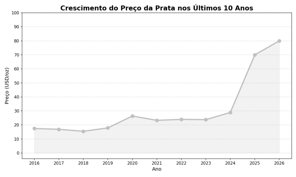 Os dados históricos revelam que o preço da prata em euros por grama cresceu significativamente nos últimos 10 anos — com uma valorização total que, mesmo com flutuações, supera os 400% em alguns períodos, quando se compara o preço mais baixo da década com níveis recentes próximos de máximos históricos.