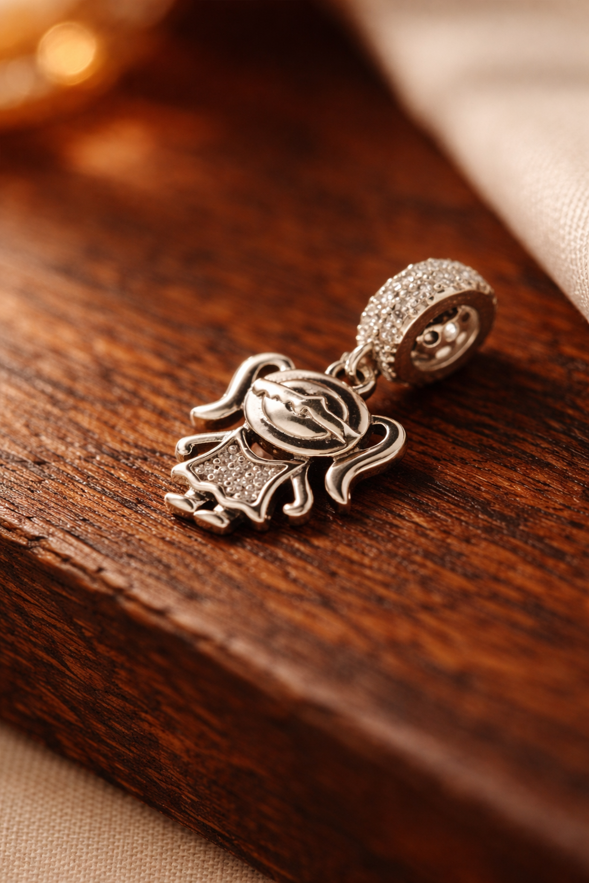 Lote 009 - Conta para pulseira SMW elaborada em prata 925, no formato de menina cravejada com brilhantes. Estado de Conservação: Excelente, como novo. Contraste: Marca 925. (PRATA - ao abrigo do Decreto Lei 120/2017, artigo 3.º, alínea x). Medidas (CxL): 2*1cm. Peso Total: 2,05g.