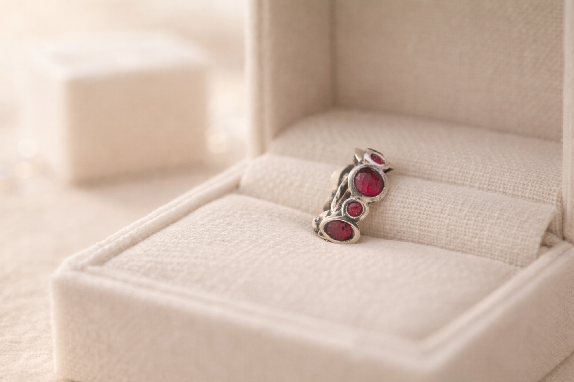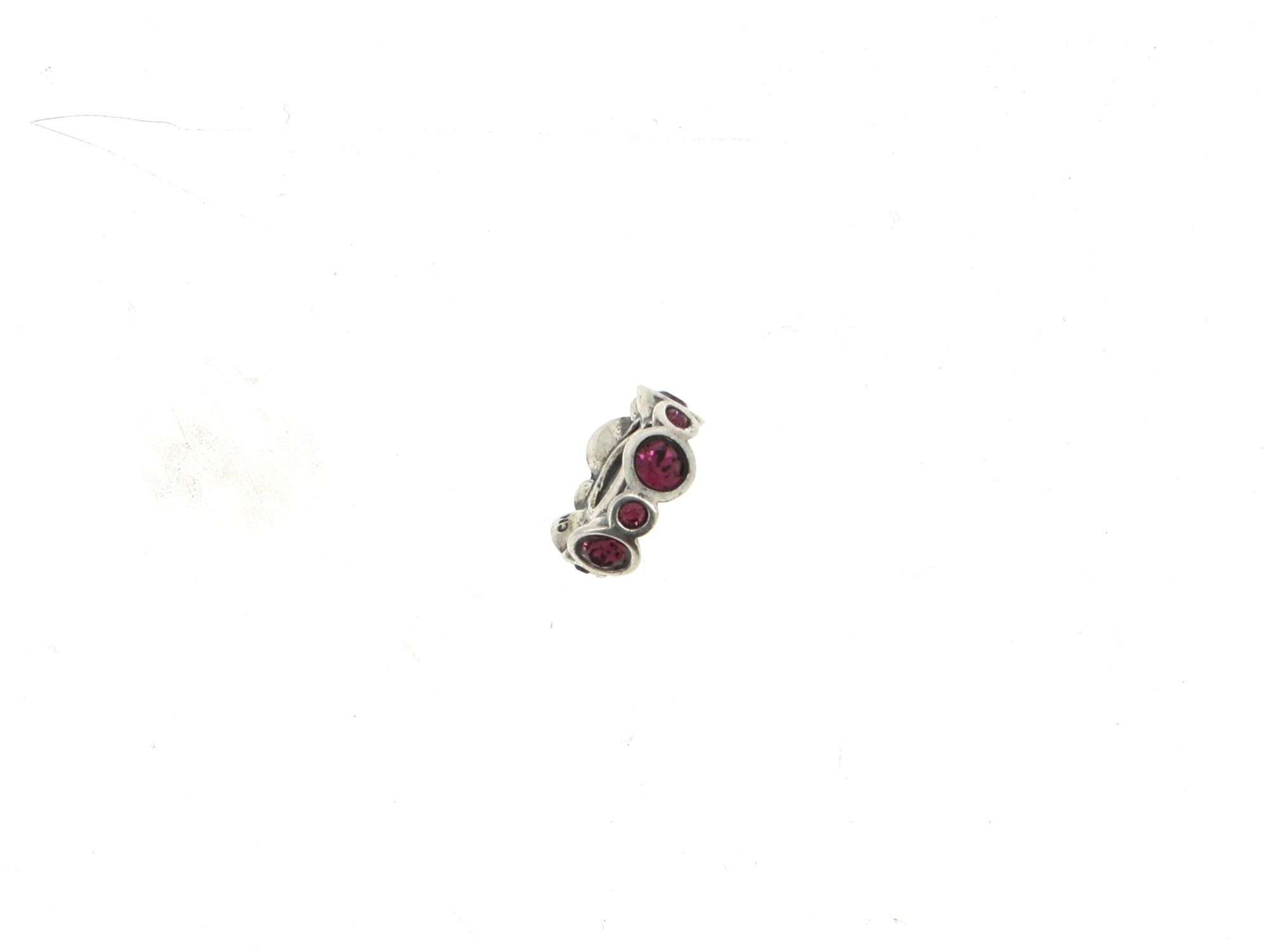 Lote 021 - Conta CHAM elaborada em prata 925 decorada com pedras roxas. Estado de Conservação: Muito Bom. Contraste: Marca 925. (PRATA - ao abrigo do Decreto Lei 120/2017, artigo 3.º, alínea x). Medidas (CxL): 1*0,4cm. Peso Total: 1,87g.