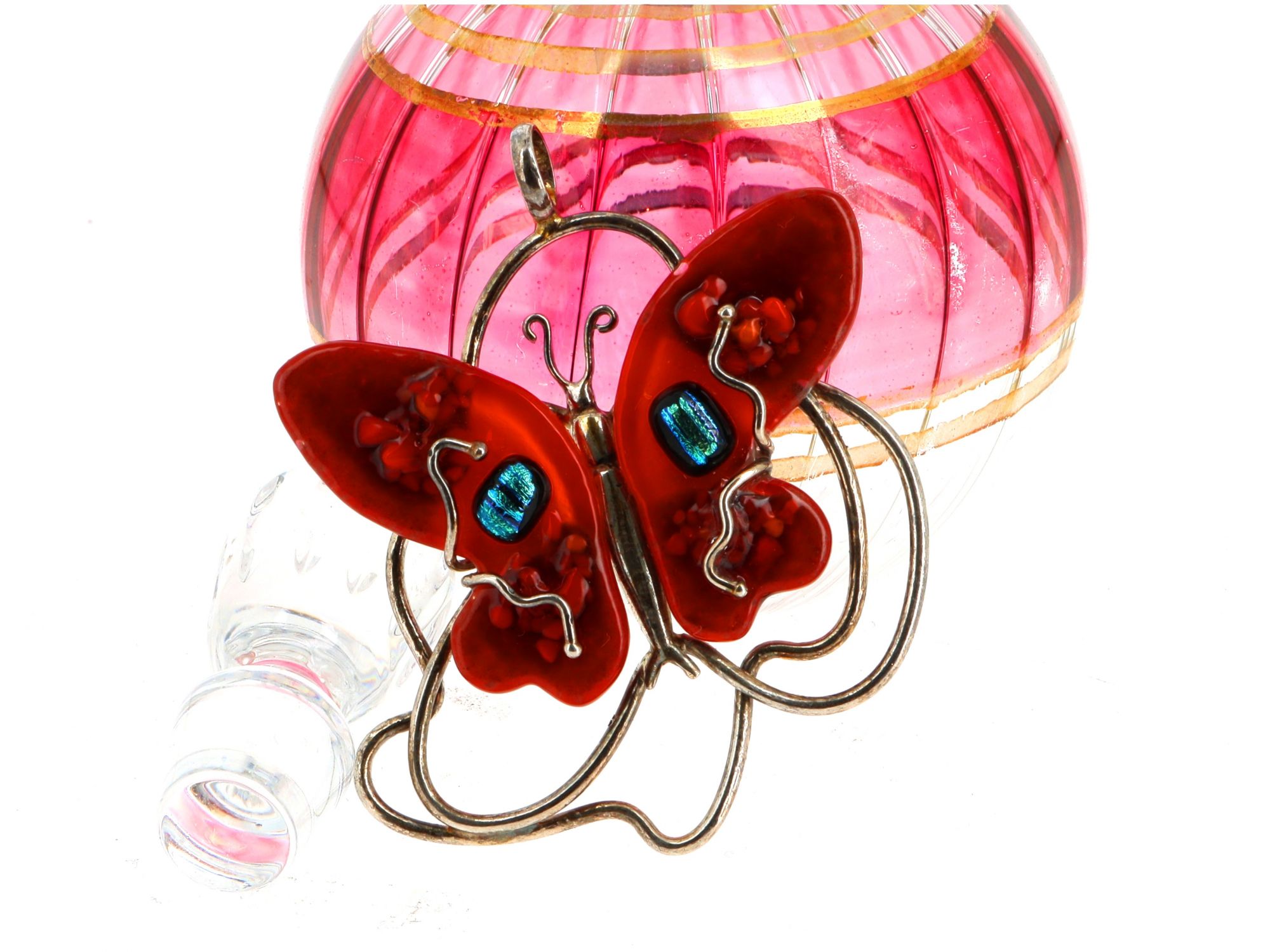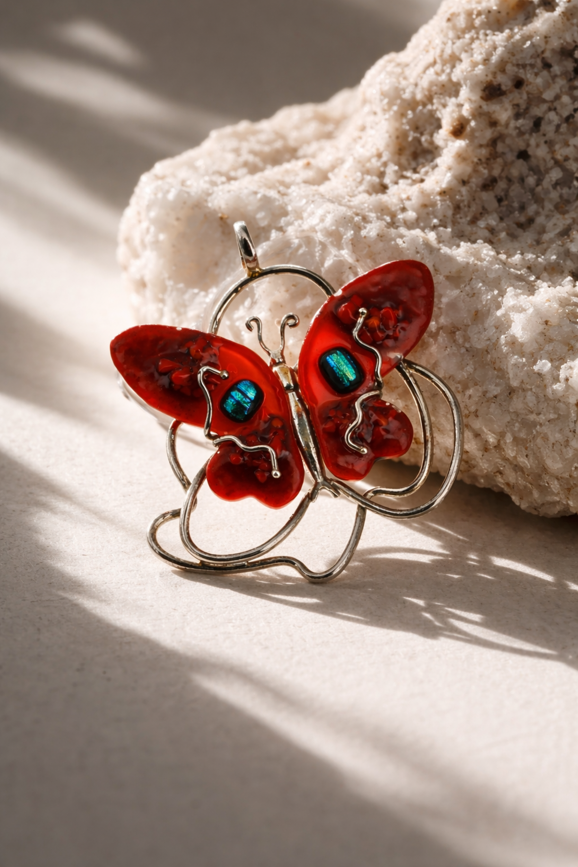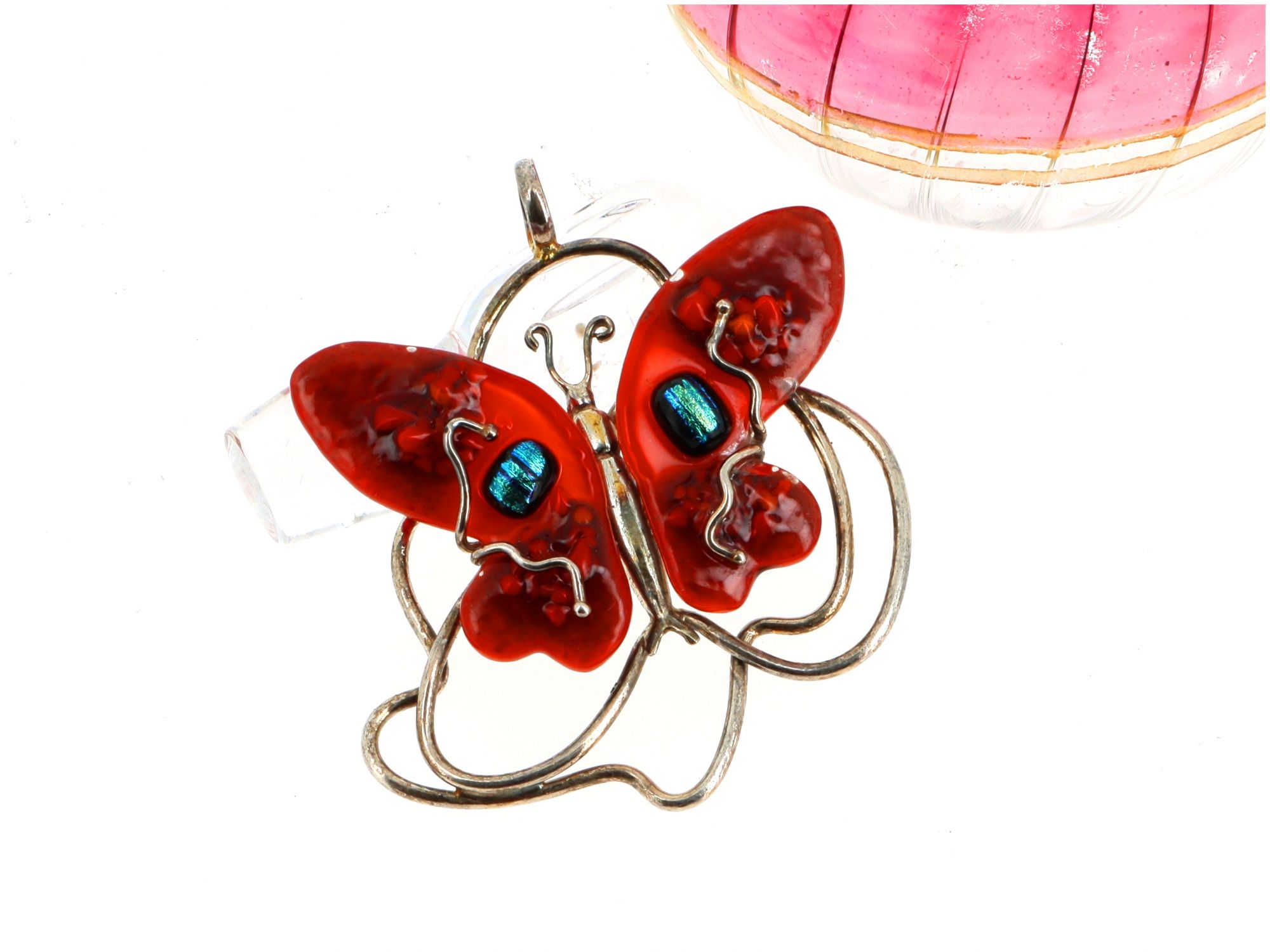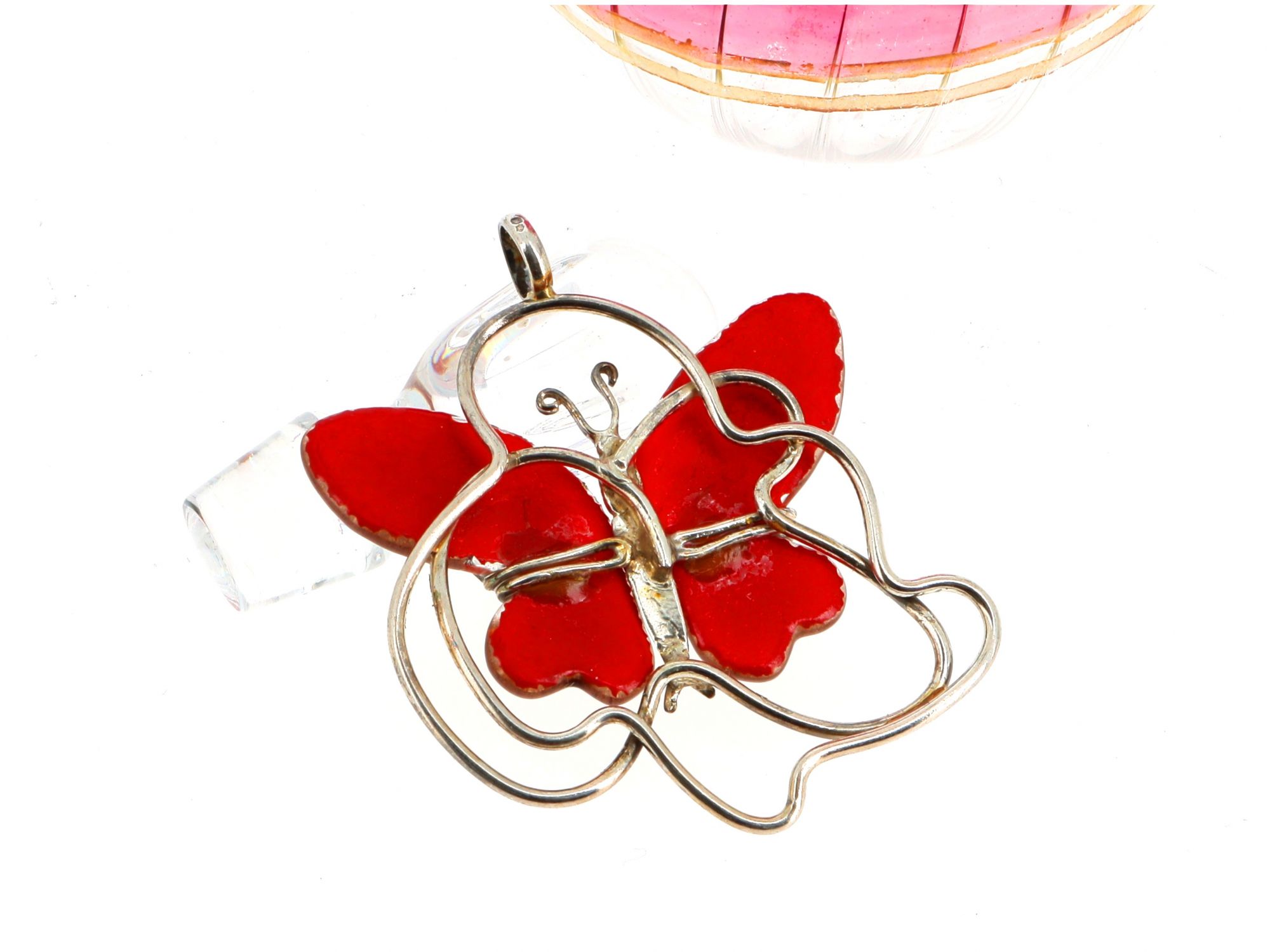 Lote 102 - Pendente elaborado em Prata 925 com feitio de Borbuleta, ornamentado com pedras decorativas. Contraste: Cabeça de Águia virada à esquerda 925 (1985-2020 - ao abrigo do Decreto Lei 120/2017, artigo 3.º, alínea y). Medidas (CxL):6 x 5 cm. Peso Total: 15g.