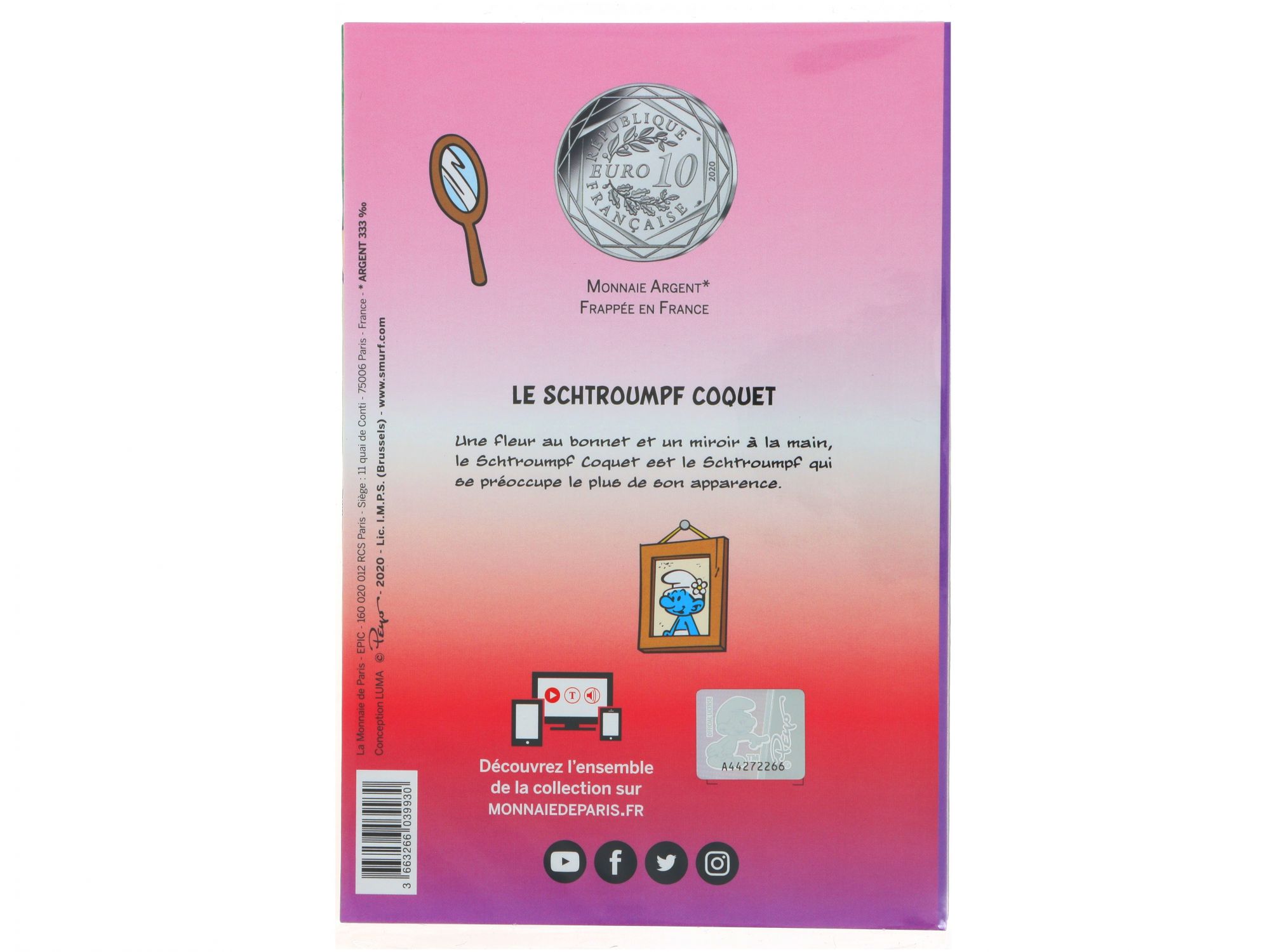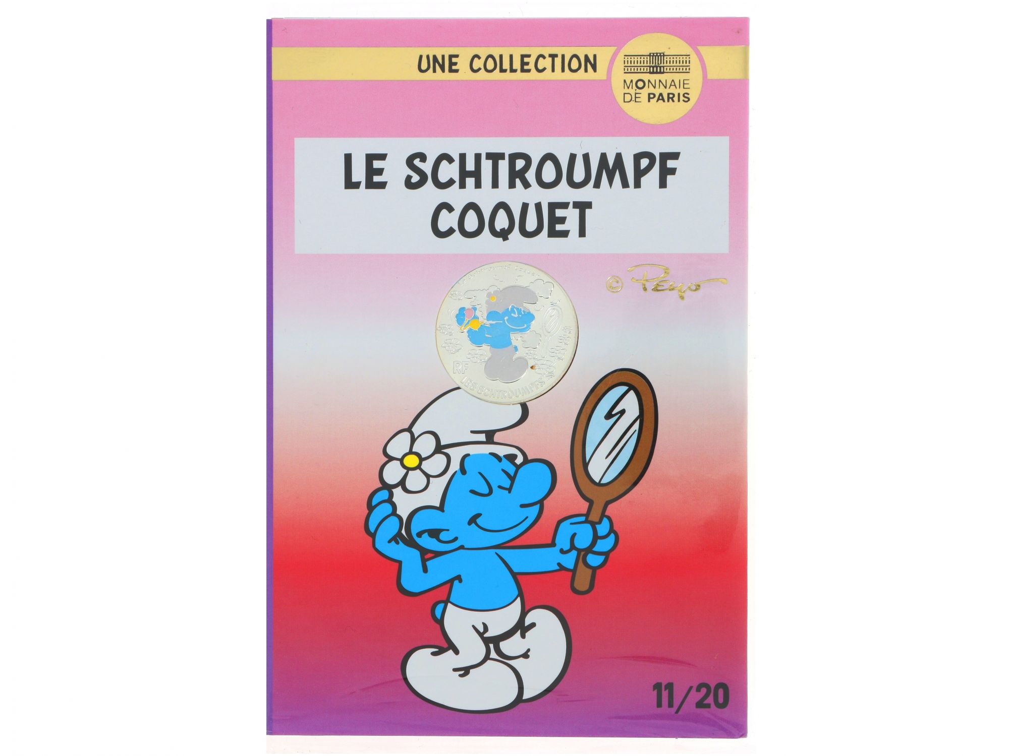 Lote 001 - Moeda Comemorativa de 10€ em Prata, da série "Les Schtroumpfs", com "Le Schtrounpf Postier" com cunhagem de 2020, elaborada em PRATA 333%. Estado de Conservação: Excelente. Contraste: Assinatura de artista. (ao abrigo do Decreto Lei 120/2017, artigo 3.º, alínea c). Medidas (Diâm): 3cm. Peso da Moeda: 17g.
