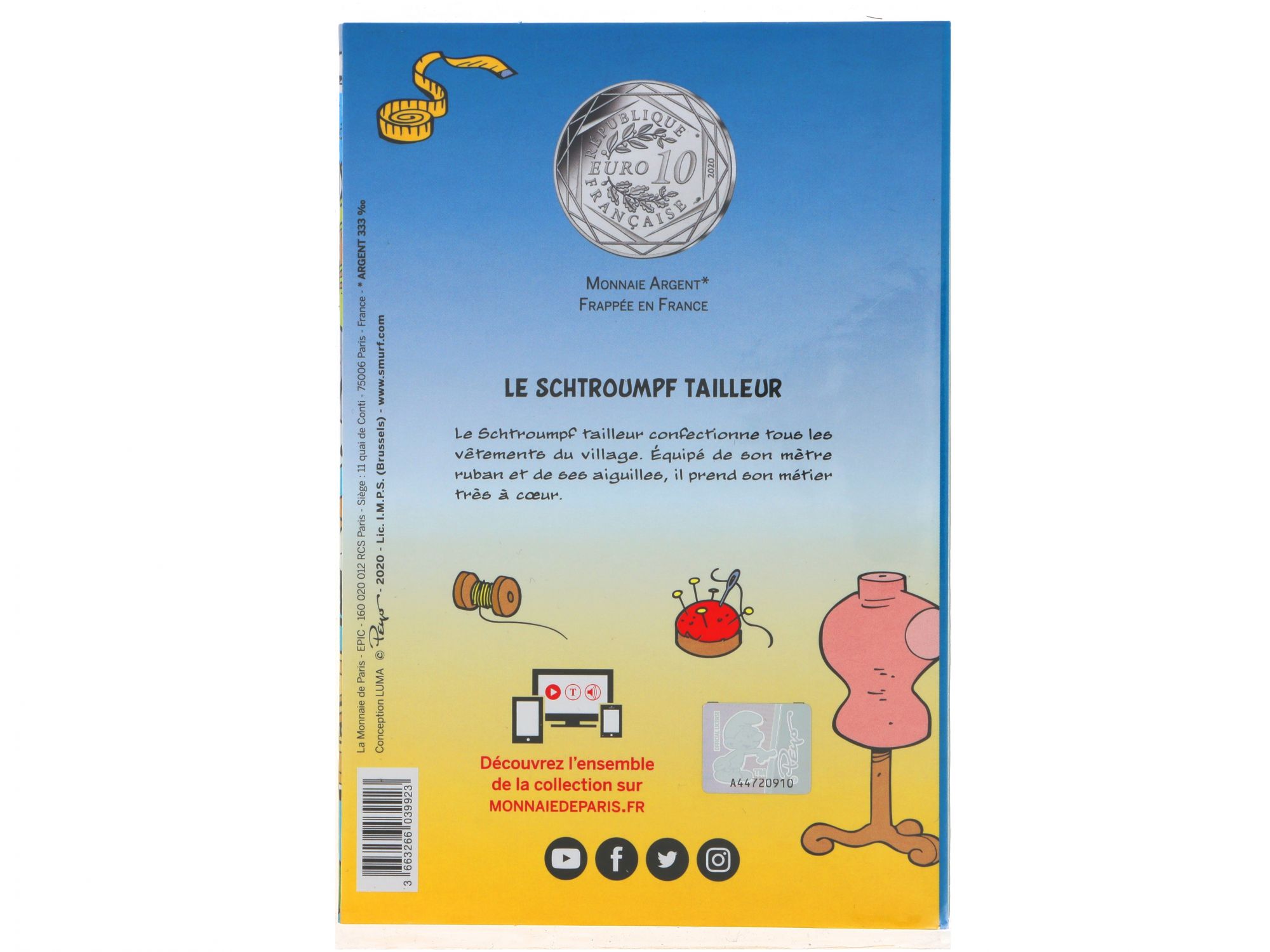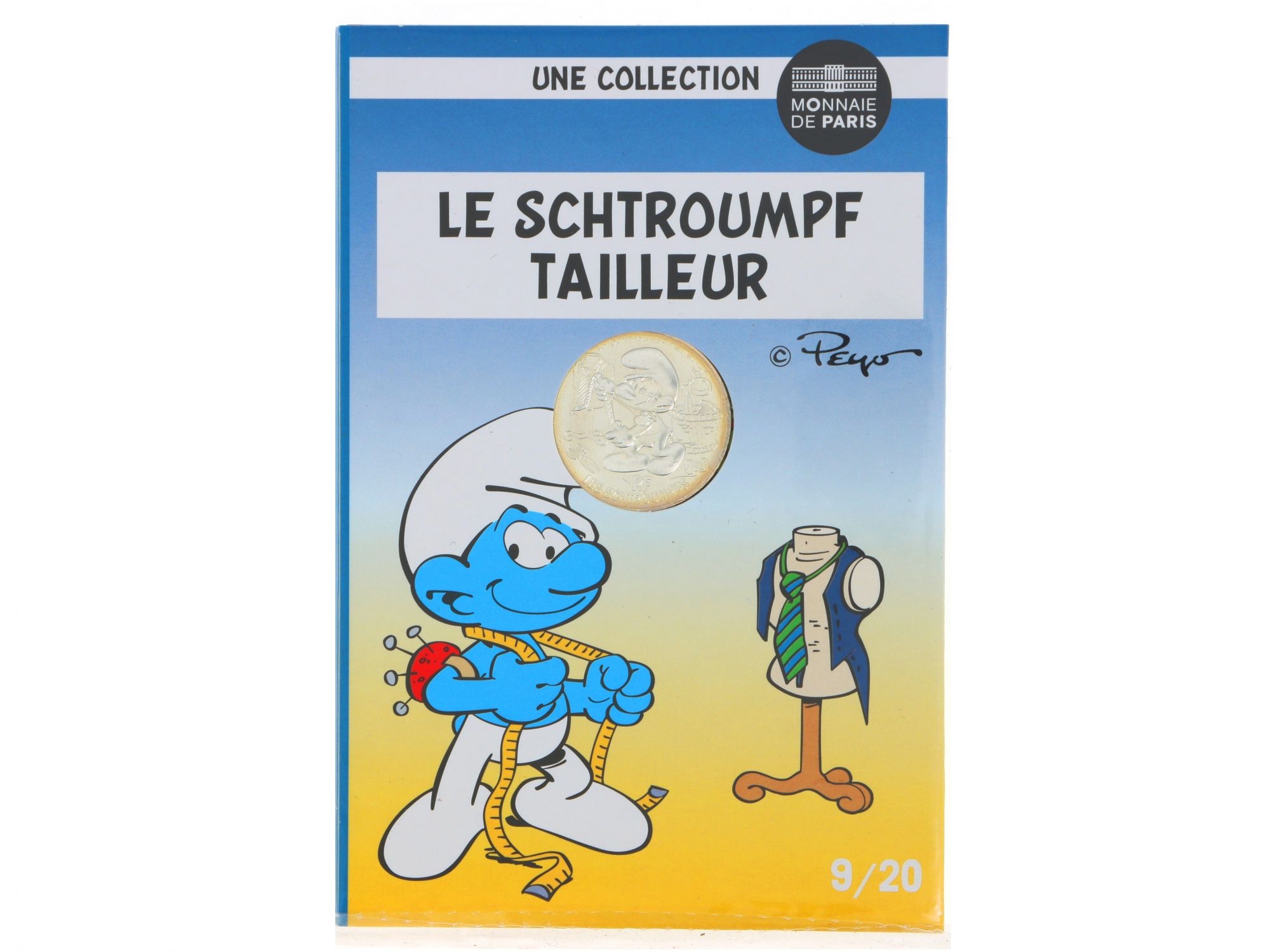 Lote 008 - Moeda Comemorativa de 10€ em Prata, da série "Les Schtroumpfs", com "Le Schtoumpf Grognon" com cunhagem de 2020, elaborada em PRATA 333%. Estado de Conservação: Excelente. Contraste: Assinatura de artista. (ao abrigo do Decreto Lei 120/2017, artigo 3.º, alínea c). Medidas (Diâm): 3cm. Peso da Moeda: 17g.