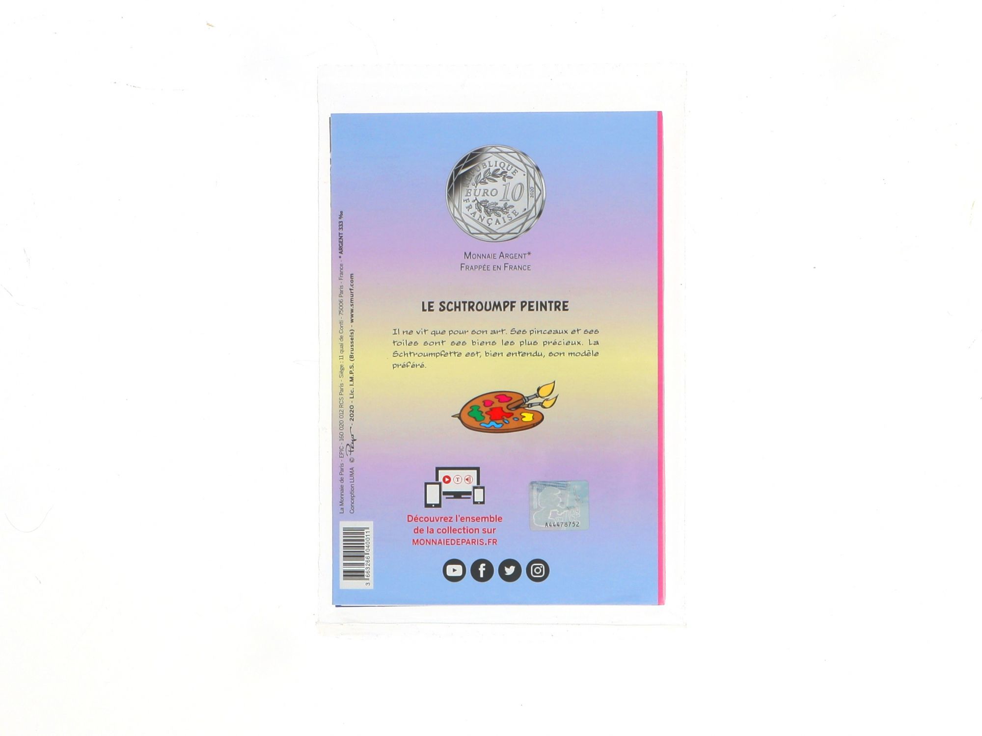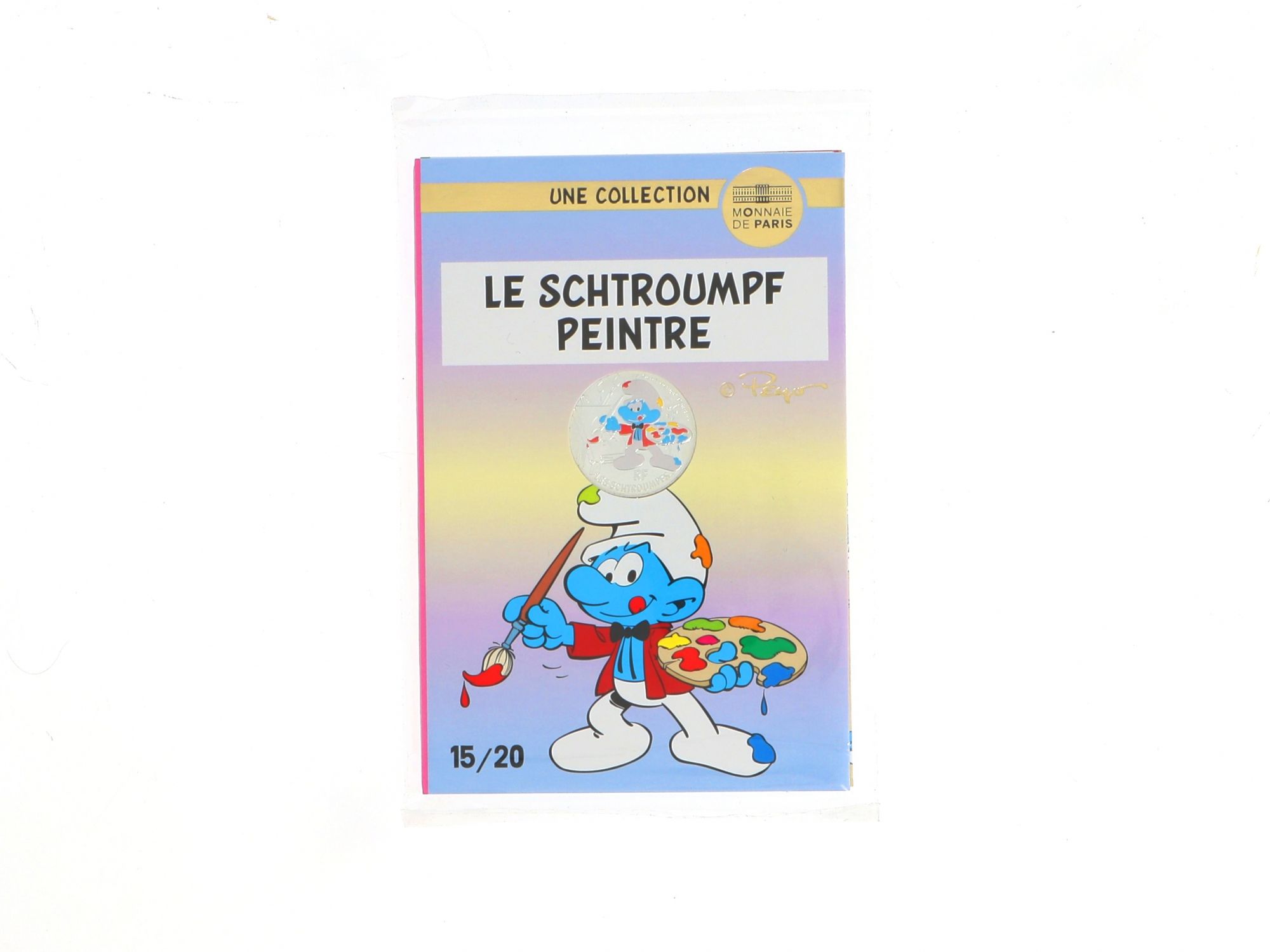 Lote 014 - Moeda Comemorativa de 10€ em Prata, da série "Les Schtroumpfs", com "Le Schtroumpf Musicien" com cunhagem de 2020, elaborada em PRATA 333%. Estado de Conservação: Excelente. Contraste: Assinatura de artista. (ao abrigo do Decreto Lei 120/2017, artigo 3.º, alínea c). Medidas (Diâm): 3cm. Peso da Moeda: 17g.