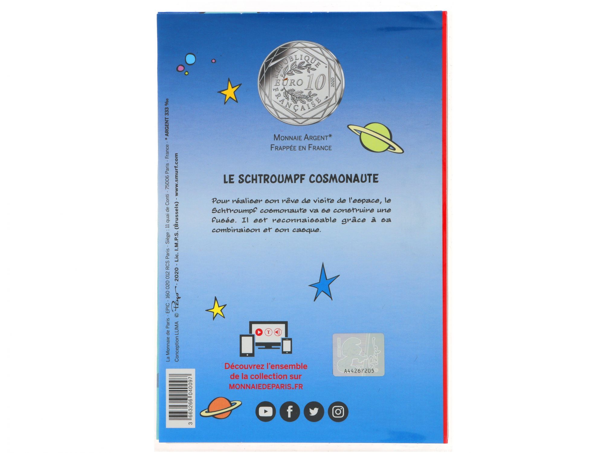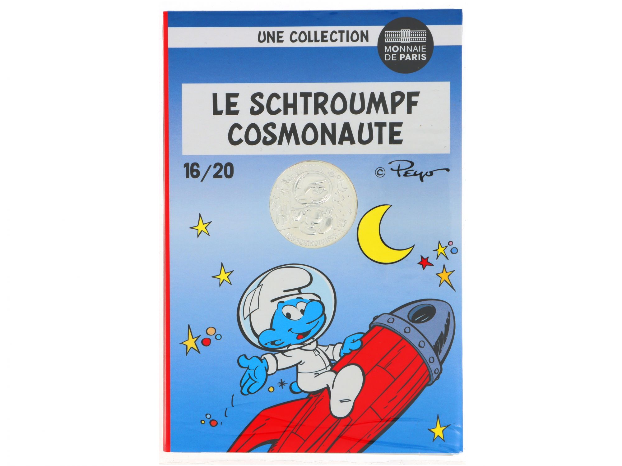 Lote 015 - Moeda Comemorativa de 10€ em Prata, da série "Les Schtroumpfs", com "Le Schtroumpf Peintre" com cunhagem de 2020, elaborada em PRATA 333%. Estado de Conservação: Excelente. Contraste: Assinatura de artista. (ao abrigo do Decreto Lei 120/2017, artigo 3.º, alínea c). Medidas (Diâm): 3cm. Peso da Moeda: 17g.