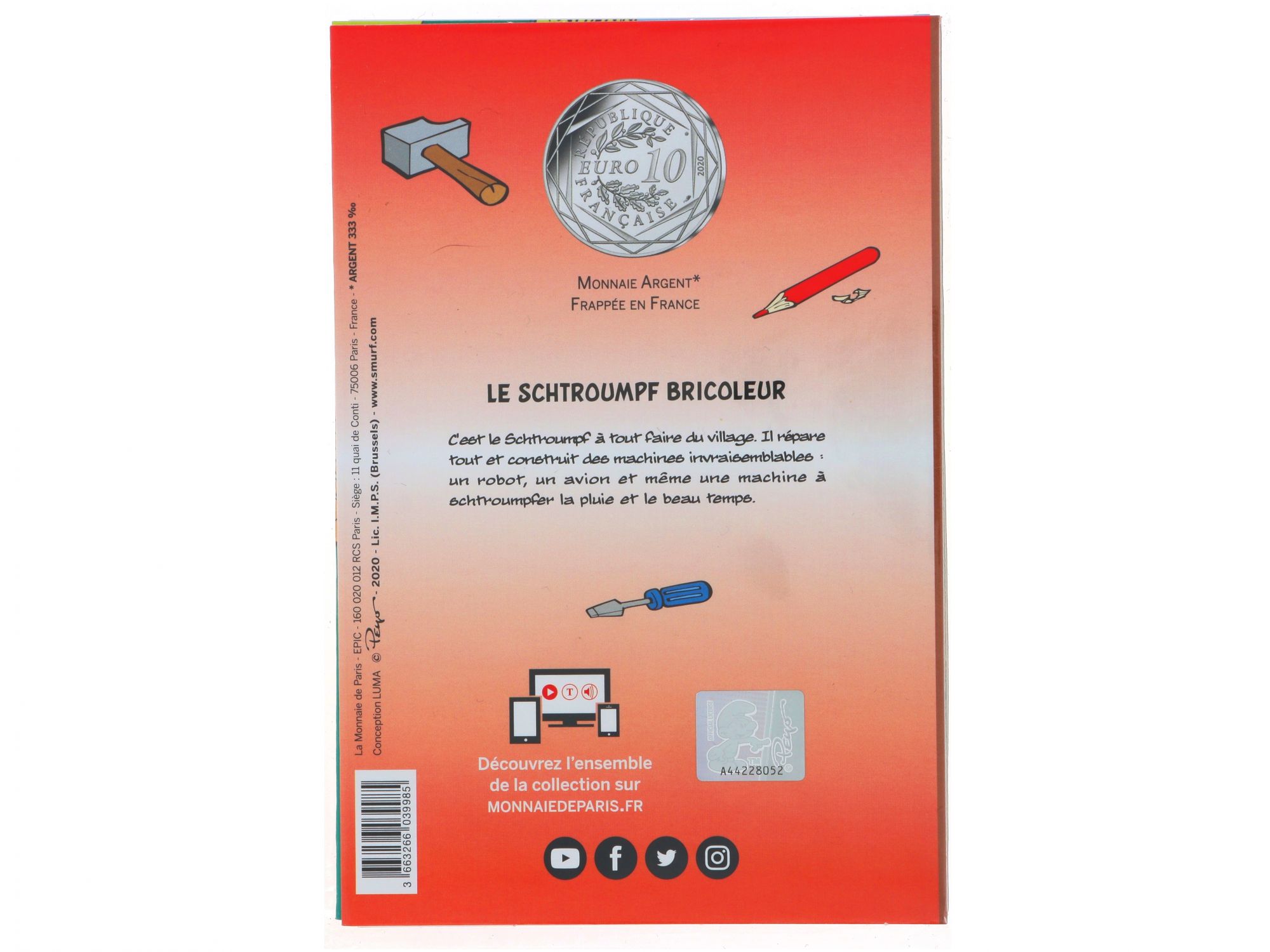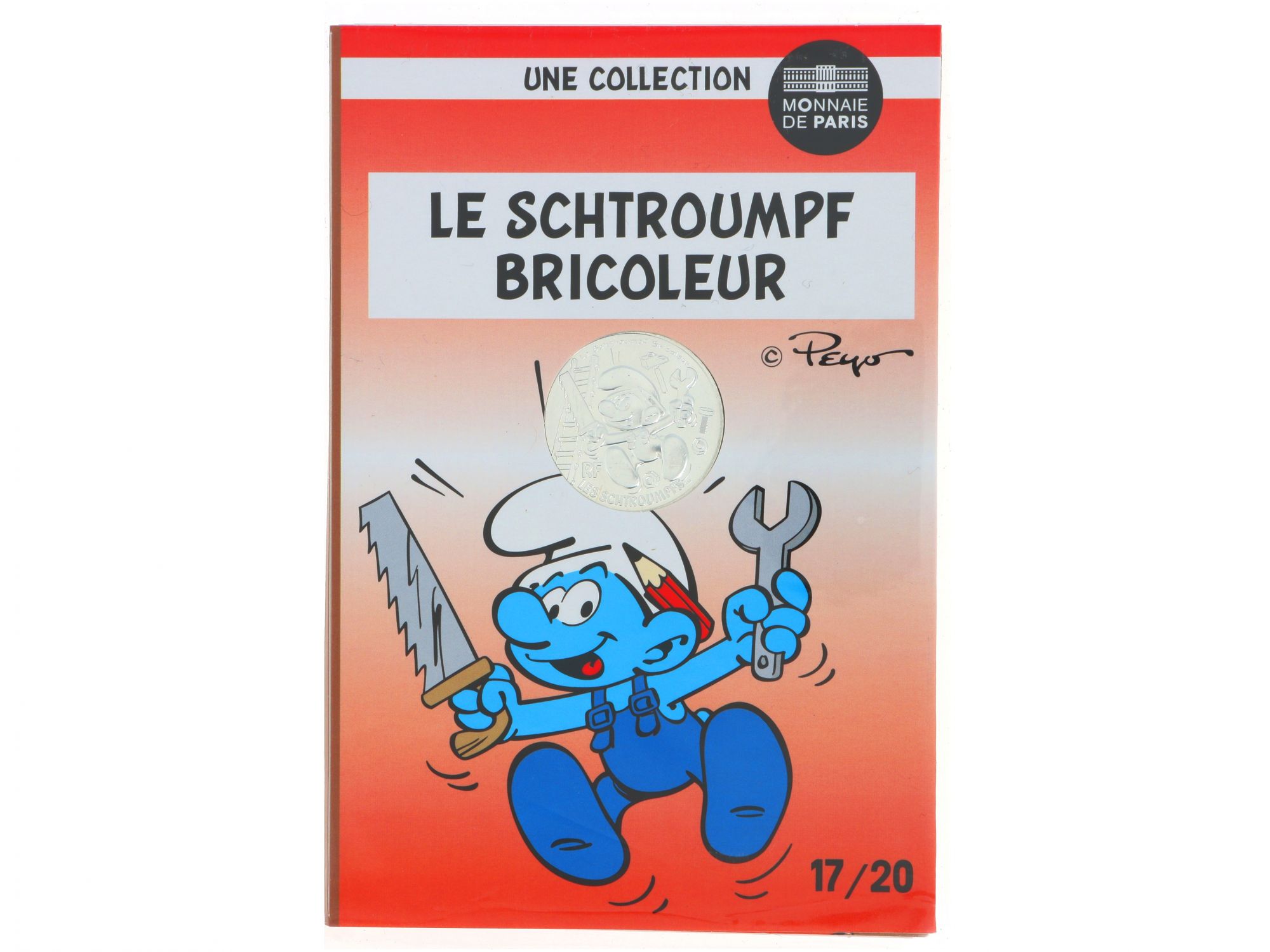 Lote 016 - Moeda Comemorativa de 10€ em Prata, da série "Les Schtroumpfs", com "Le Schtroumpf Cosmonaute" com cunhagem de 2020, elaborada em PRATA 333%. Estado de Conservação: Excelente. Contraste: Assinatura de artista. (ao abrigo do Decreto Lei 120/2017, artigo 3.º, alínea c). Medidas (Diâm): 3cm. Peso da Moeda: 17g.