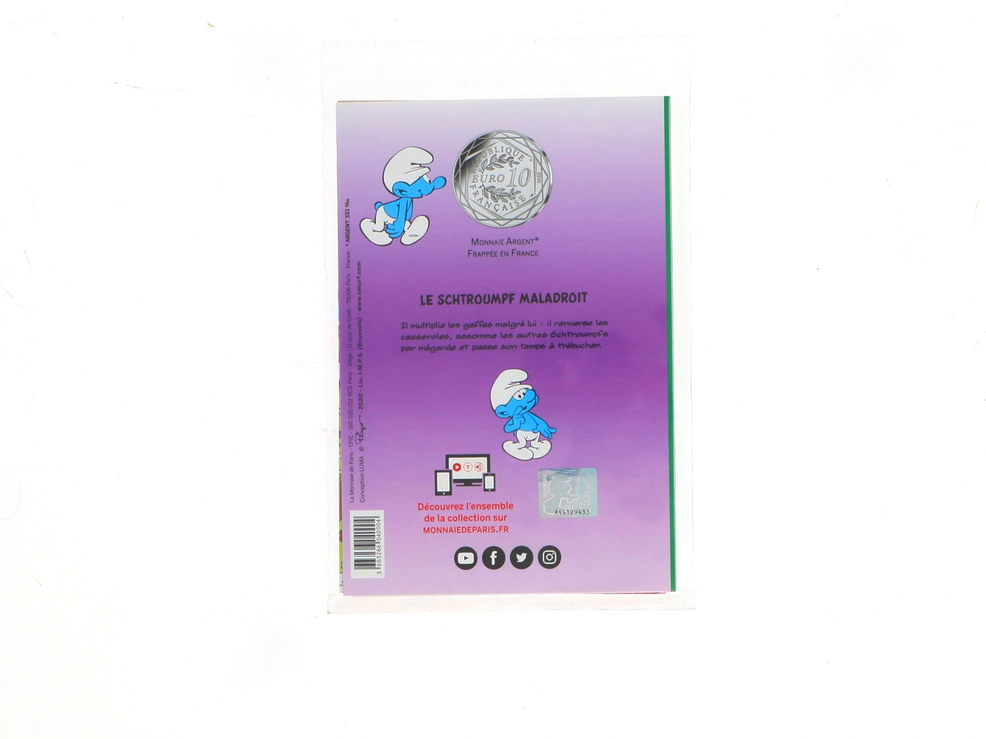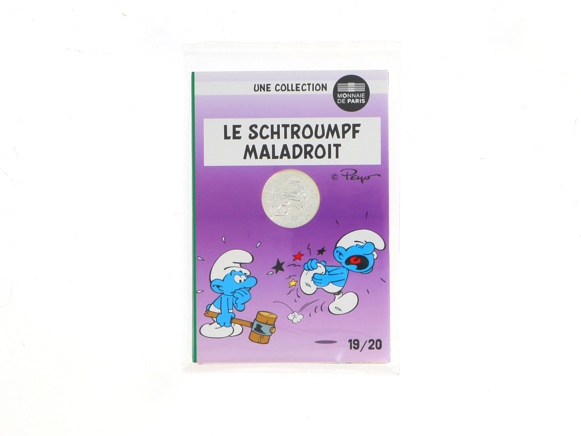 Lote 018 - Moeda Comemorativa de 10€ em Prata, da série "Les Schtroumpfs", com "Le Schtroumpf Paysan" com cunhagem de 2020, elaborada em PRATA 333%. Estado de Conservação: Excelente. Contraste: Assinatura de artista. (ao abrigo do Decreto Lei 120/2017, artigo 3.º, alínea c). Medidas (Diâm): 3cm. Peso da Moeda: 17g.