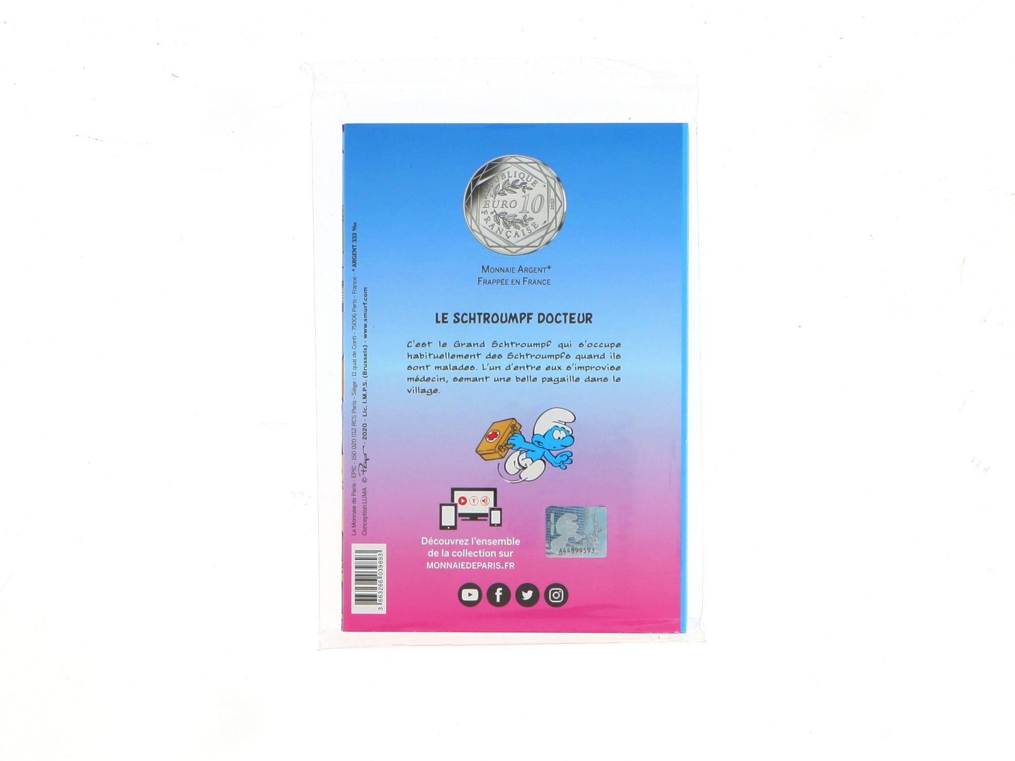 Lote 003 - Moeda Comemorativa de 10€ em Prata, da série "Les Schtroumpfs", com "Le Schtroumpf Paresseux" com cunhagem de 2020, elaborada em PRATA 333%. Estado de Conservação: Excelente. Contraste: Assinatura de artista. (ao abrigo do Decreto Lei 120/2017, artigo 3.º, alínea c). Medidas (Diâm): 3cm. Peso da Moeda: 17g.