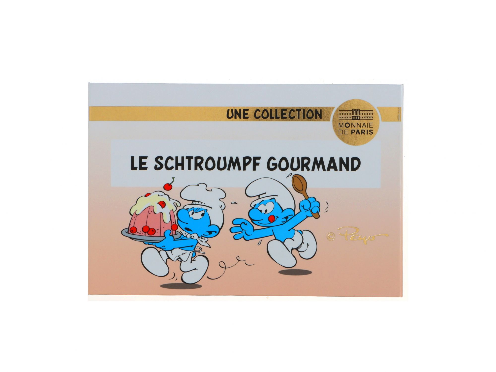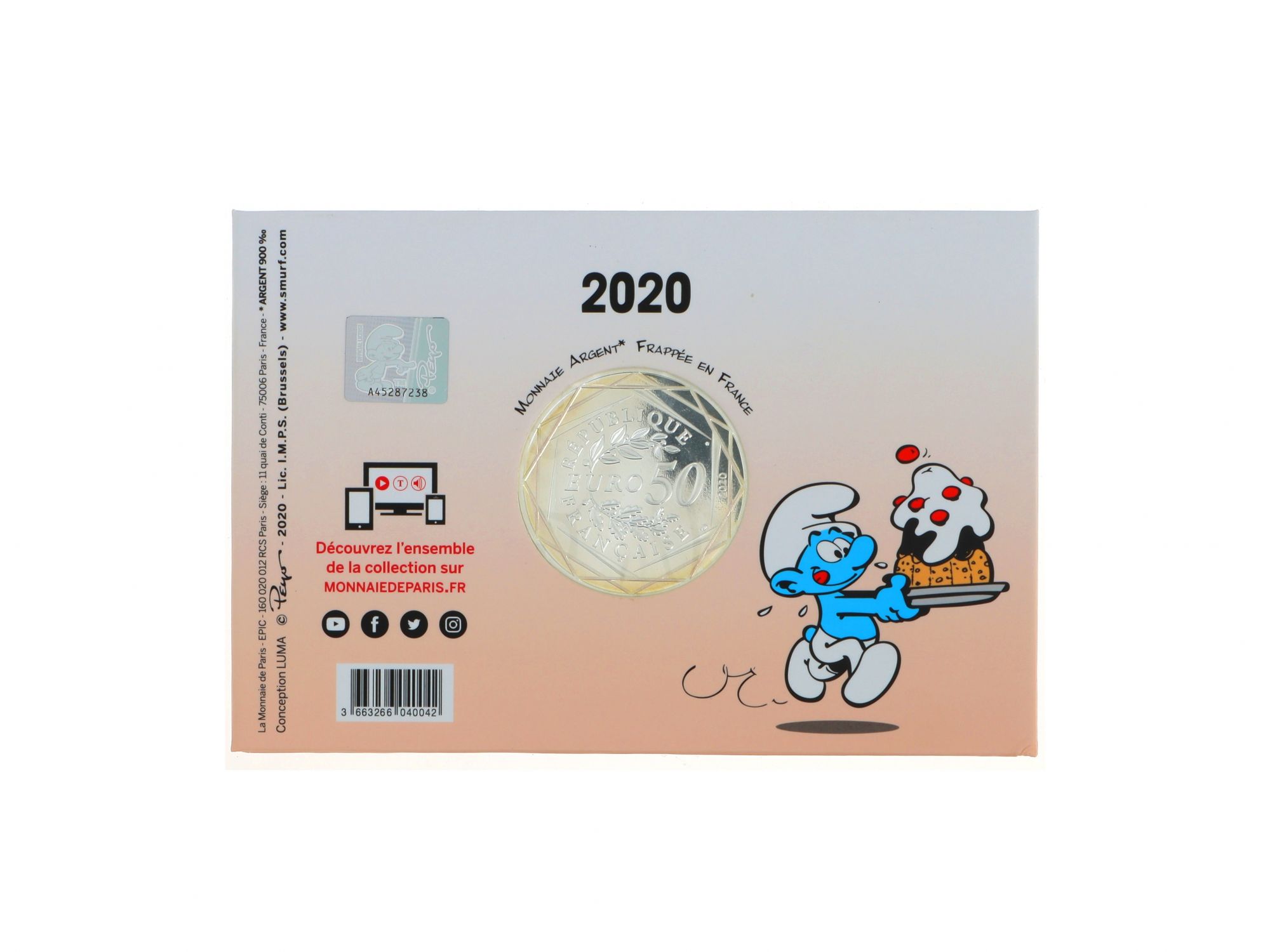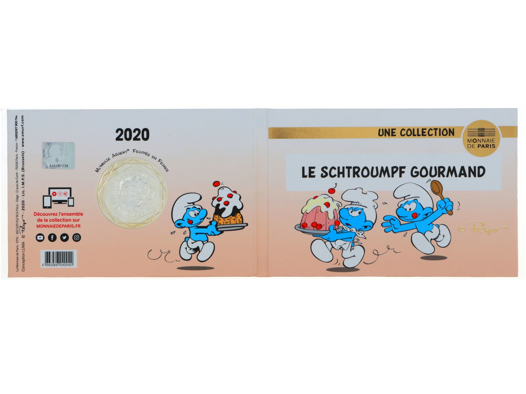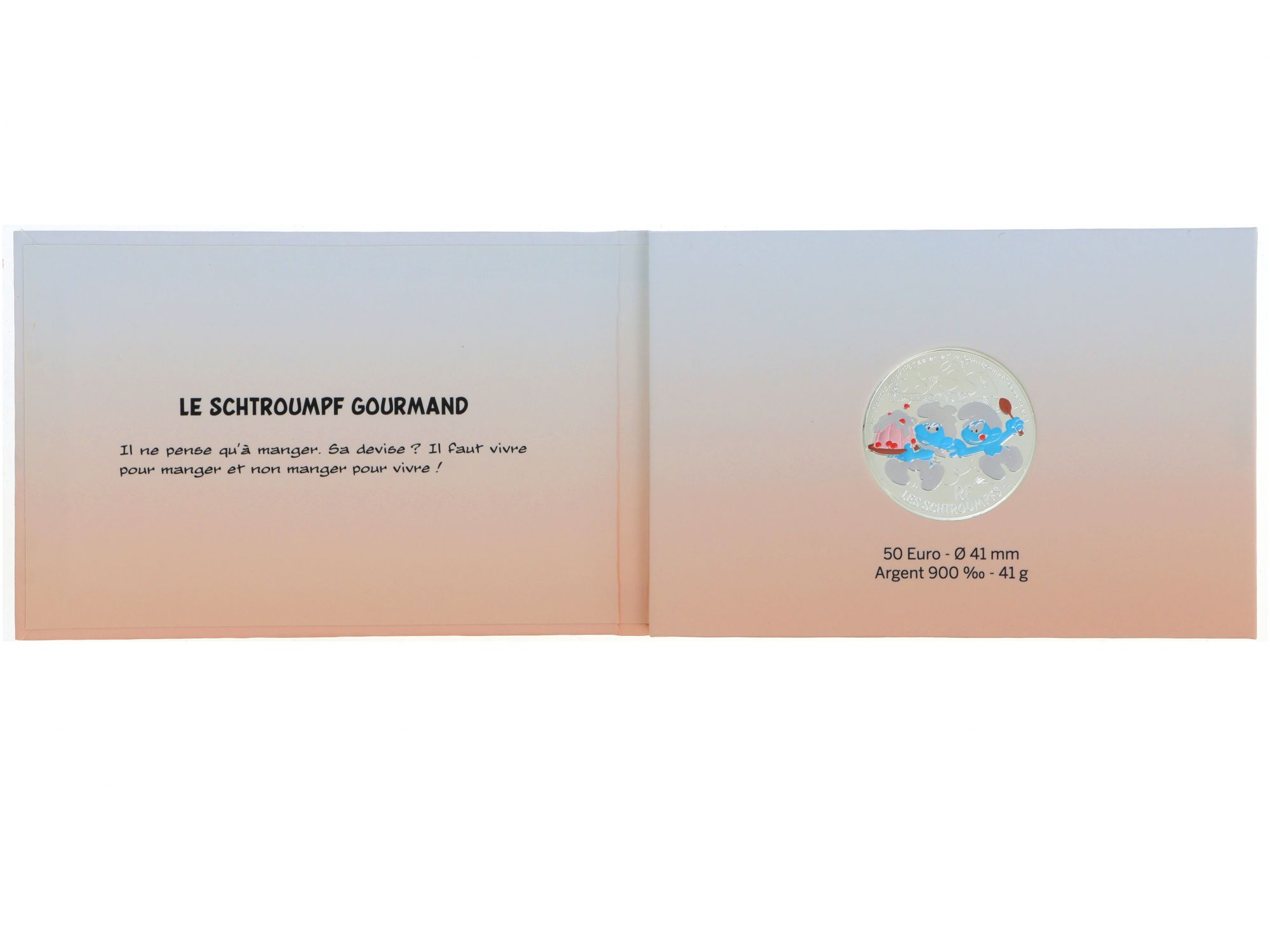 Lote 021 - Moeda Comemorativa de 50€ em Prata, da série "LES SCHTROUMPFS", com tema “LE SCHTROUMPF GOURMAND”, com cunhagem de 2020, elaborada em PRATA 900. Estado de Conservação: Excelente. Contraste: Assinatura de artista. (ao abrigo do Decreto Lei 120/2017, artigo 3.º, alínea c). Medidas (Diâm): 4,1cm. Peso Total: 41g.