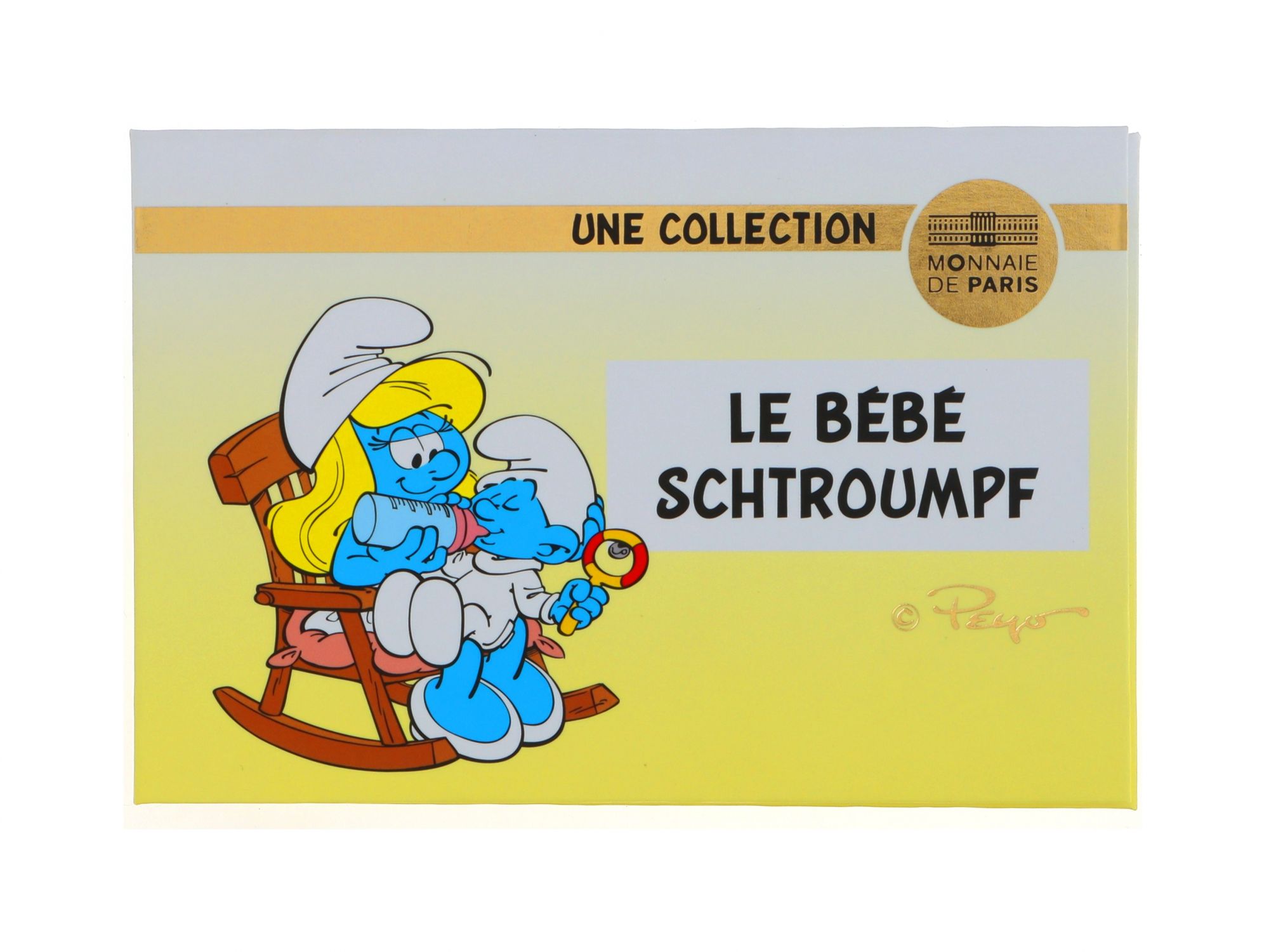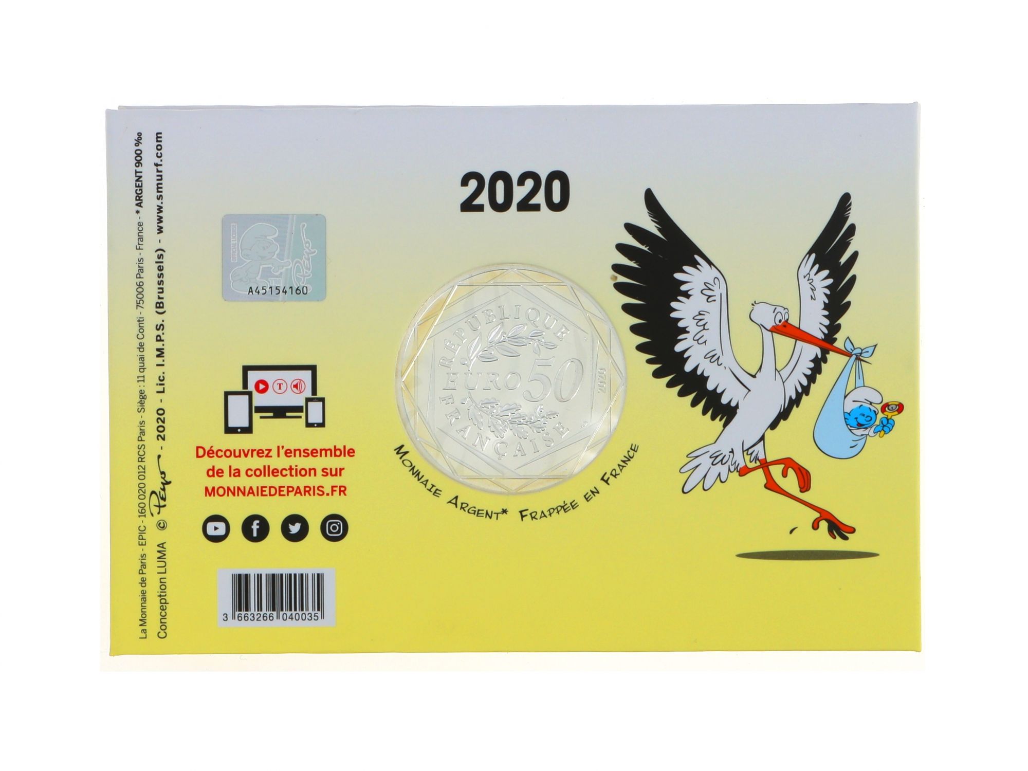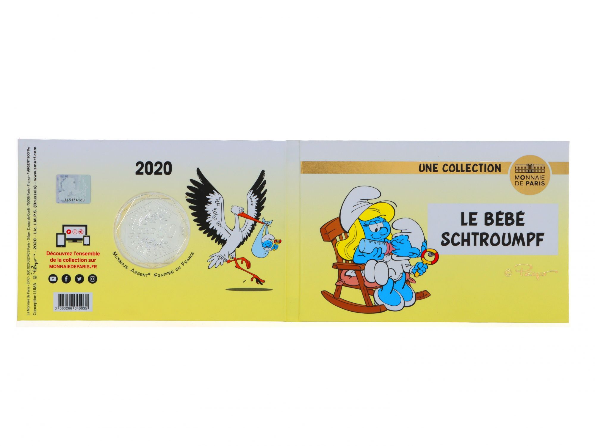 Lote 018 - Moeda Comemorativa de 50€ em Prata, da série "LES SCHTROUMPFS", com tema “LE BÉBÉ SCHTROUMPF”, com cunhagem de 2020, elaborada em PRATA 900. Estado de Conservação: Excelente. Contraste: Assinatura de artista. (ao abrigo do Decreto Lei 120/2017, artigo 3.º, alínea c). Medidas (Diâm): 4,1cm. Peso Total: 41g.