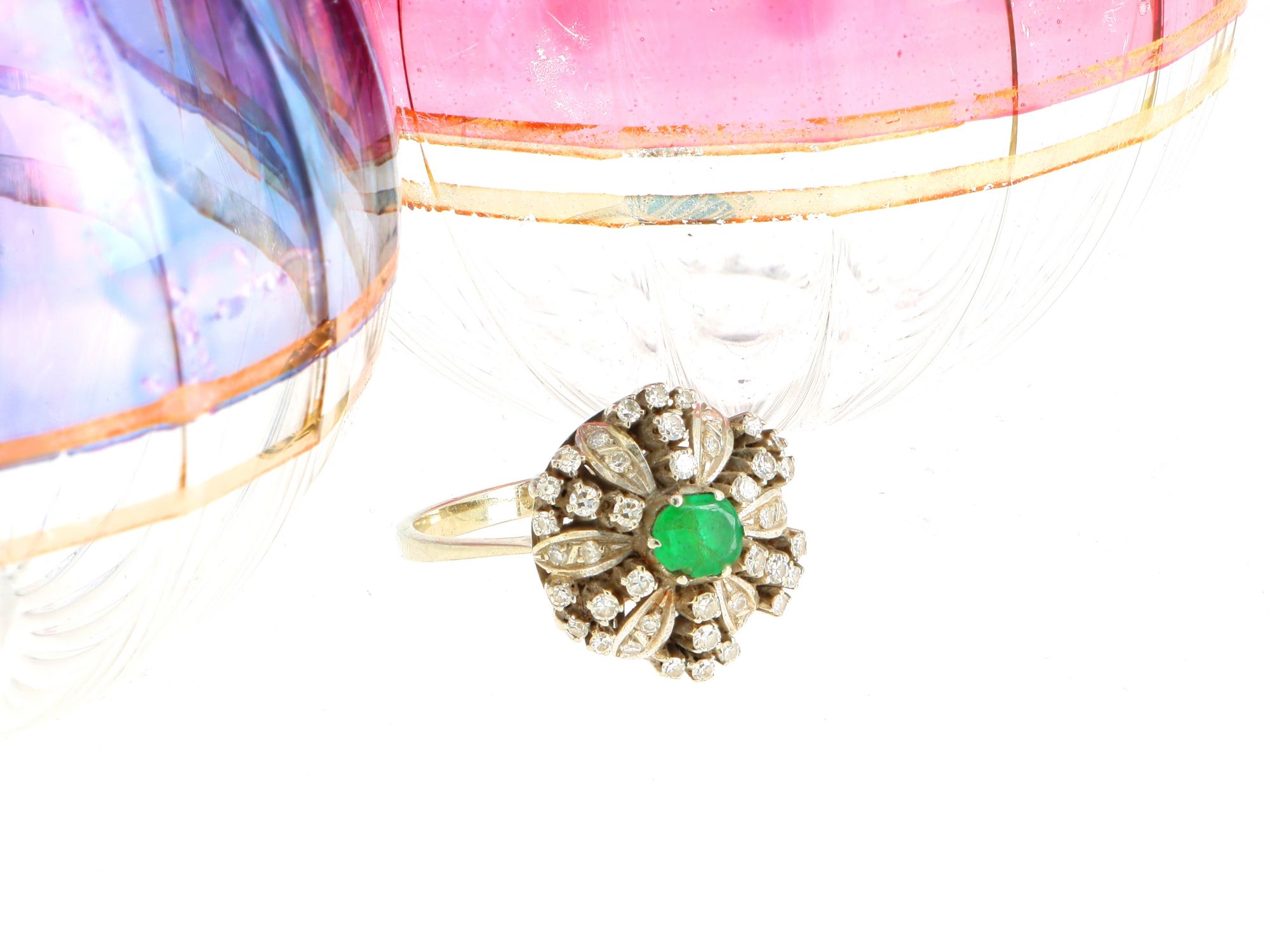 Lote 002 - Anel ANTIGO de ALTA JOALHERIA em Ouro Branco de 19,2 quilates, em forma de Chuveiro Decorado com ESMERALDA em talhe redondo, e 40 DIAMANTES em talhe redondo brilhante. Estado de Conservação: Muito Bom. Contrastes: Formiga ( Contraste de Ouro Branco) e Cabelça de Galo ( Contraste de certificação das Pedras Preciosas). Peso Total: 5.67gr.