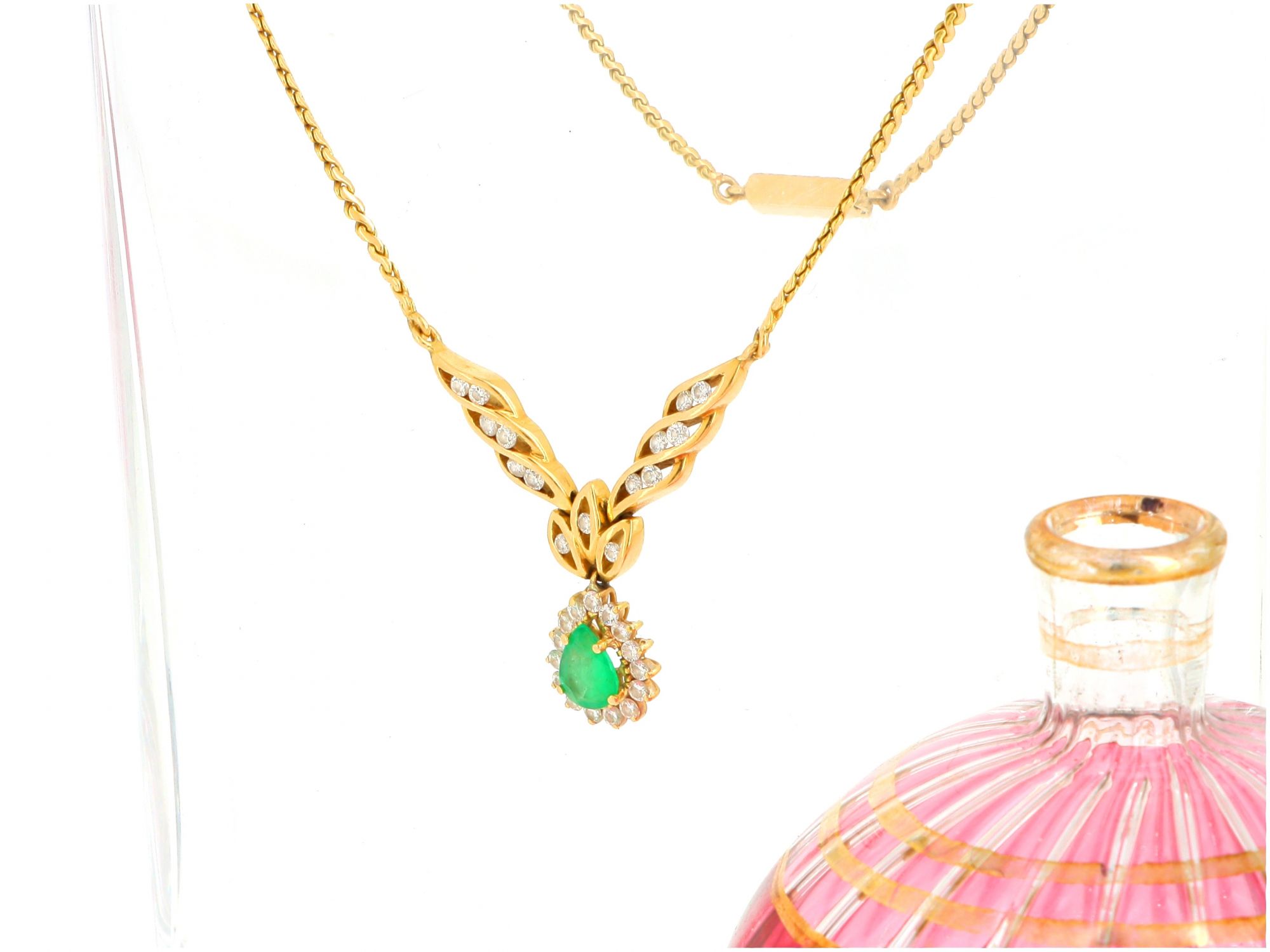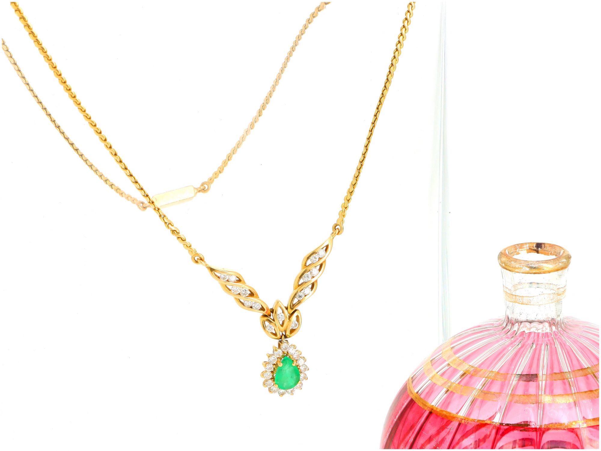 Lote 013 - Colar em ouro de 19,2kt, com pendente delicadamente trabalhado e adornado com 30 DIAMANTES em talhe redondo brilhante que envolvem uma magnífica ESMERALDA em talhe lágrima Estado de Conservação: Excelente. Contraste: Cabeça de Veado 800 (OURO - 1985-2020, ao abrigo do Decreto Lei 120/2017, artigo 3.º, alínea y). Medidas (CxL): 43,5x2,67 cm. Peso Total: 13,16g.
