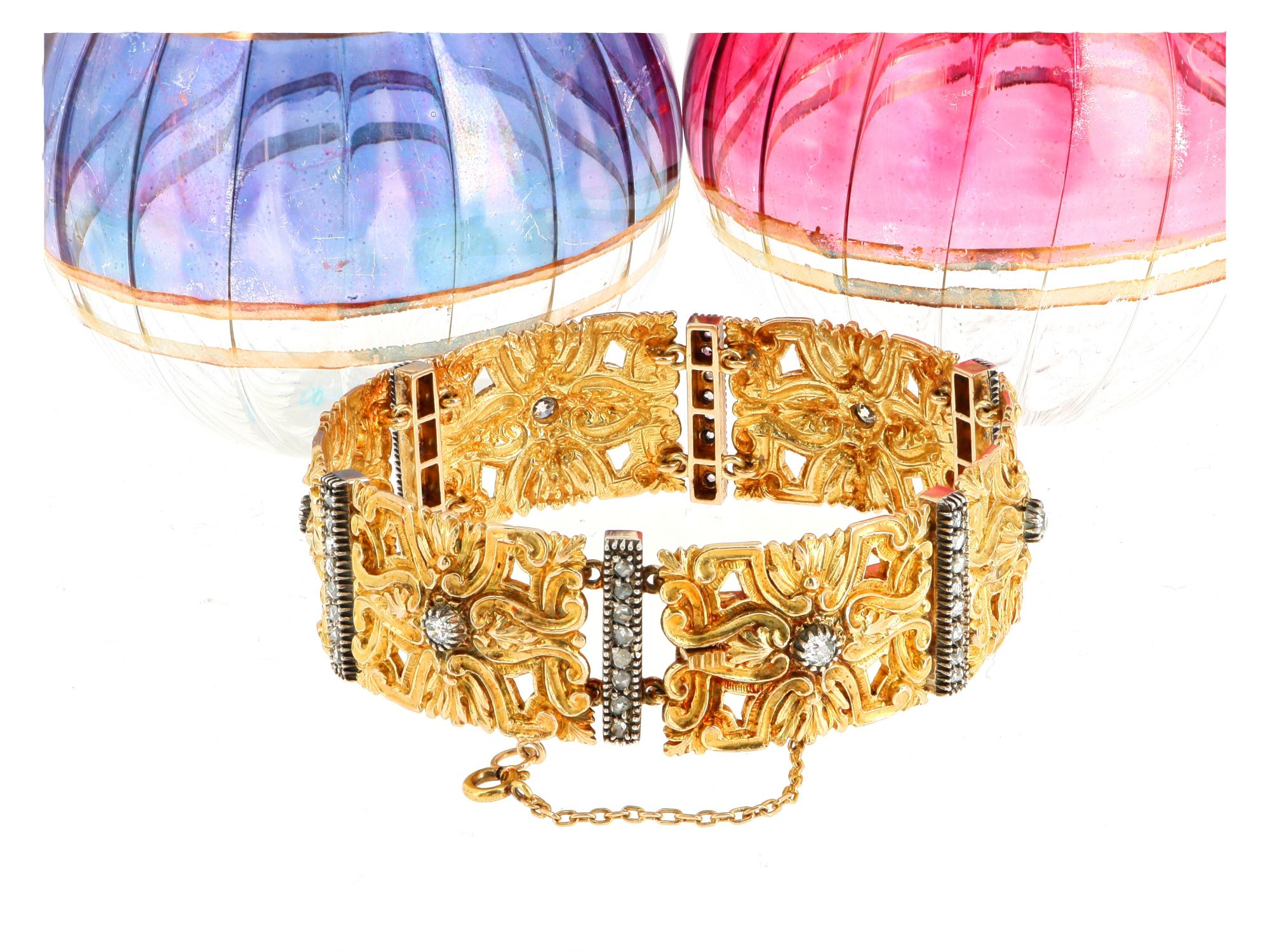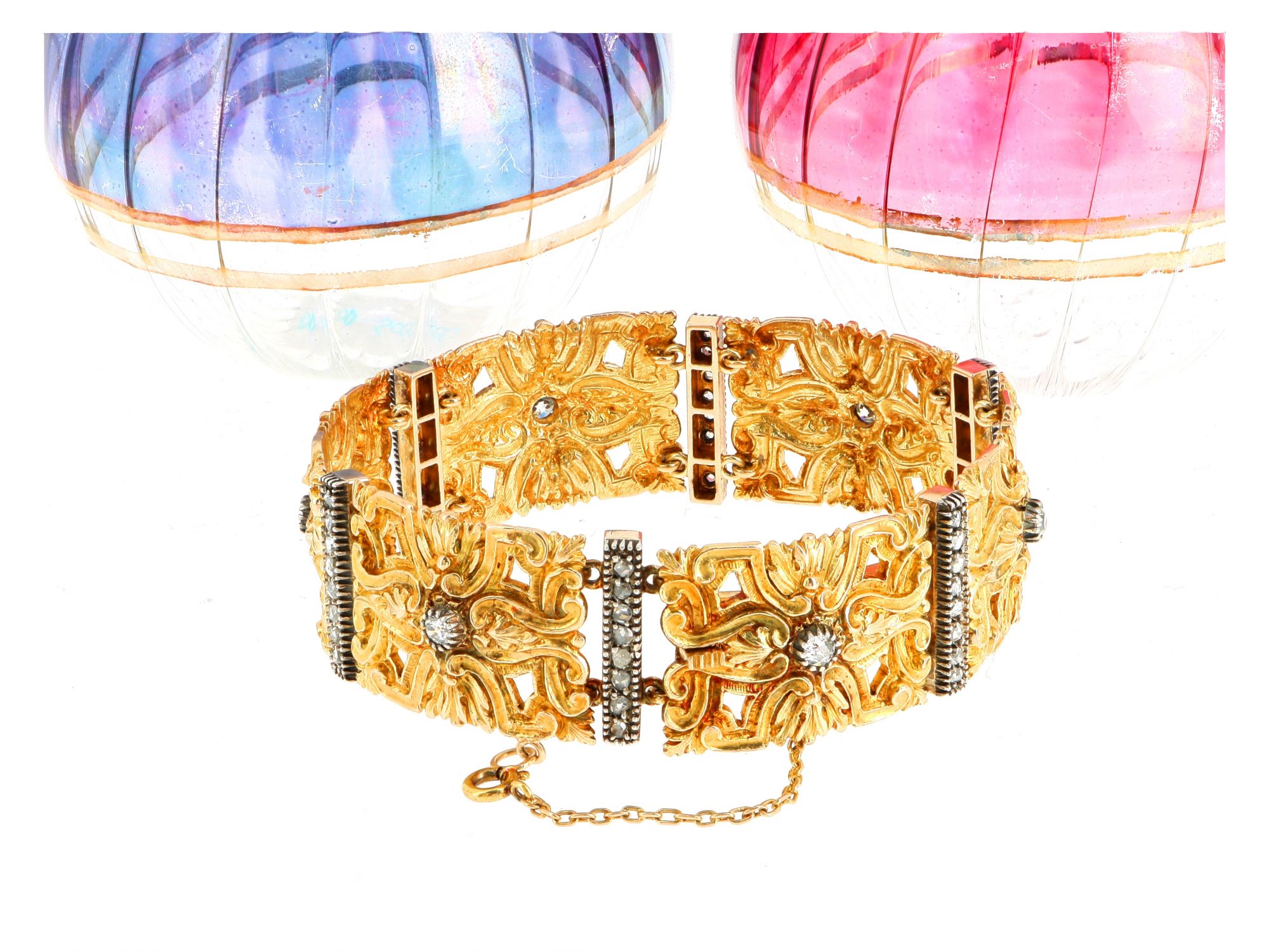 Lote 013 - Pulseira antiga elaborada em ouro 19.2K e prata 833 adornado com 54 diamantes. Estado de Conservação: Muito Bom. Contrastes: Cabeça de Tigre II (Ouro 800) e Cabeça de Javali II Prata 833) (1887-1937 - ao abrigo do Decreto Lei 120/2017, artigo 3.º, alínea y). Medidas (CxL): 20,5*2cm. Peso Total: 56,12g.