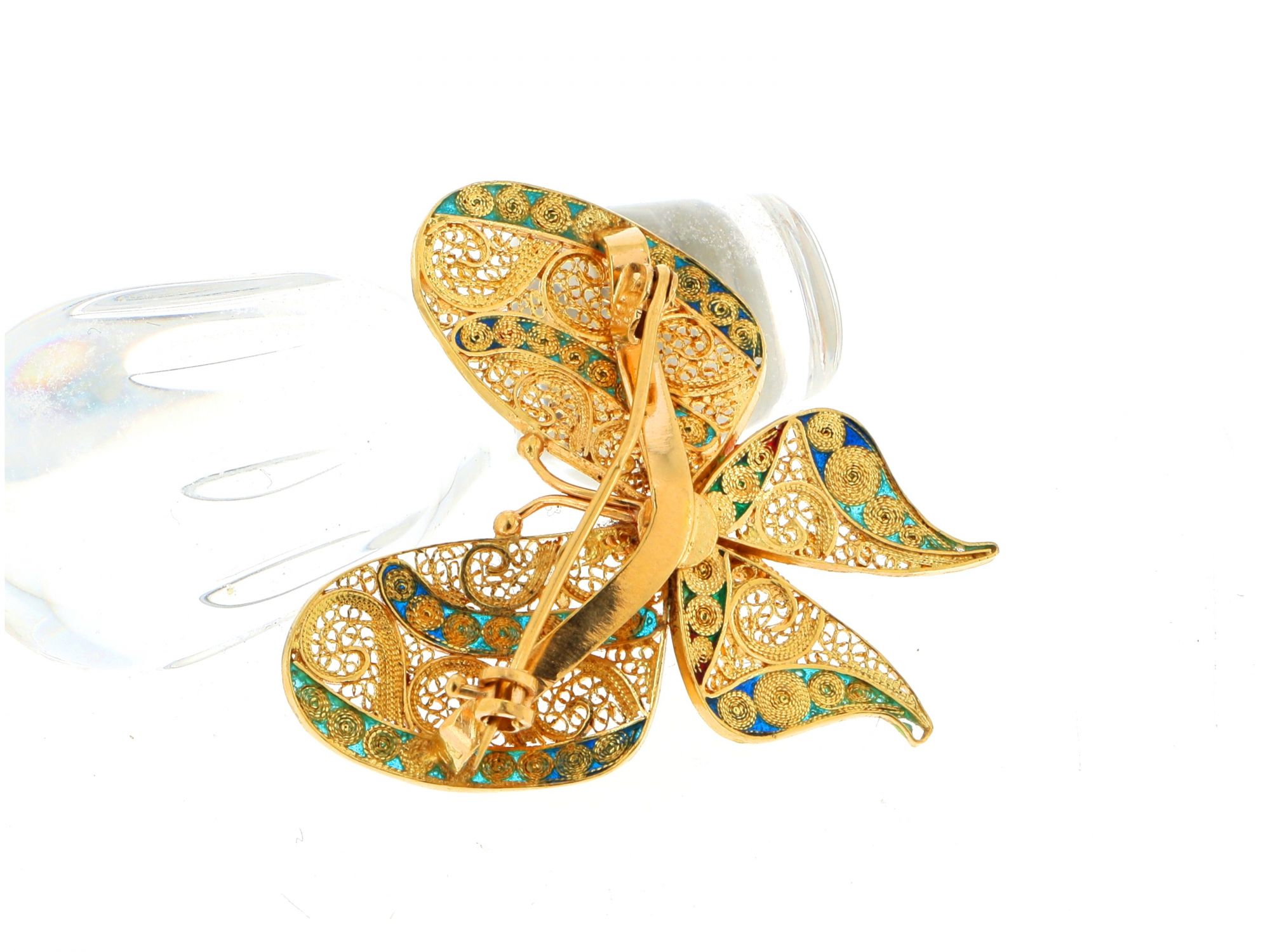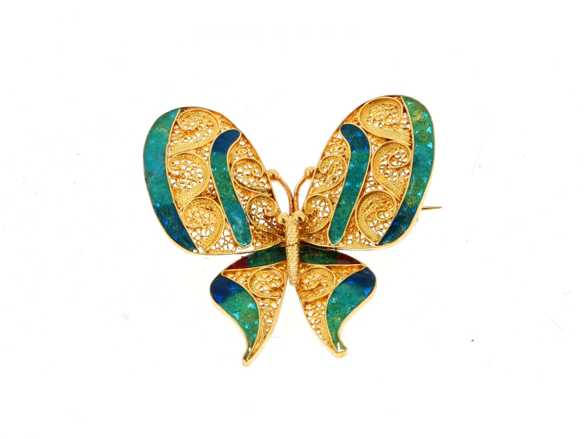 Lote 025 - Alfinete de Peito em Ouro com forma de Borboleta, trabalhado à mão em FILIGRANA, suas asas preenchidas com esmalte em tons de azul, verde e vermelho, elaborado em OURO 19,2 QUILATES. Estado de Conservação: Muito Bom. Contraste: Cabeça de Veado 800 (OURO - 1985-2020, ao abrigo do Decreto Lei 120/2017, artigo 3.º, alínea y). Medidas (LxA): 3,3*3,5cm. Peso Total: 6,25g.