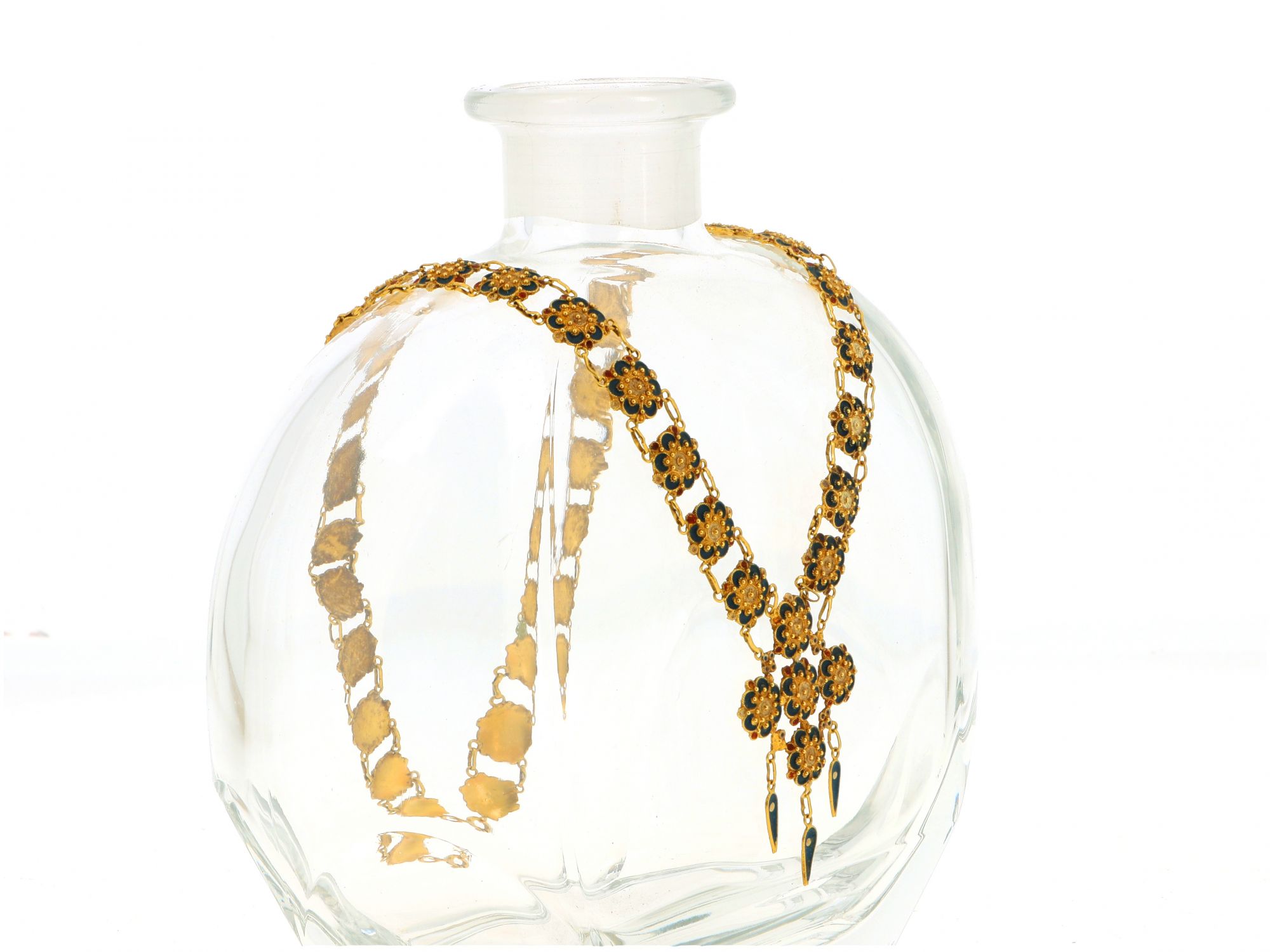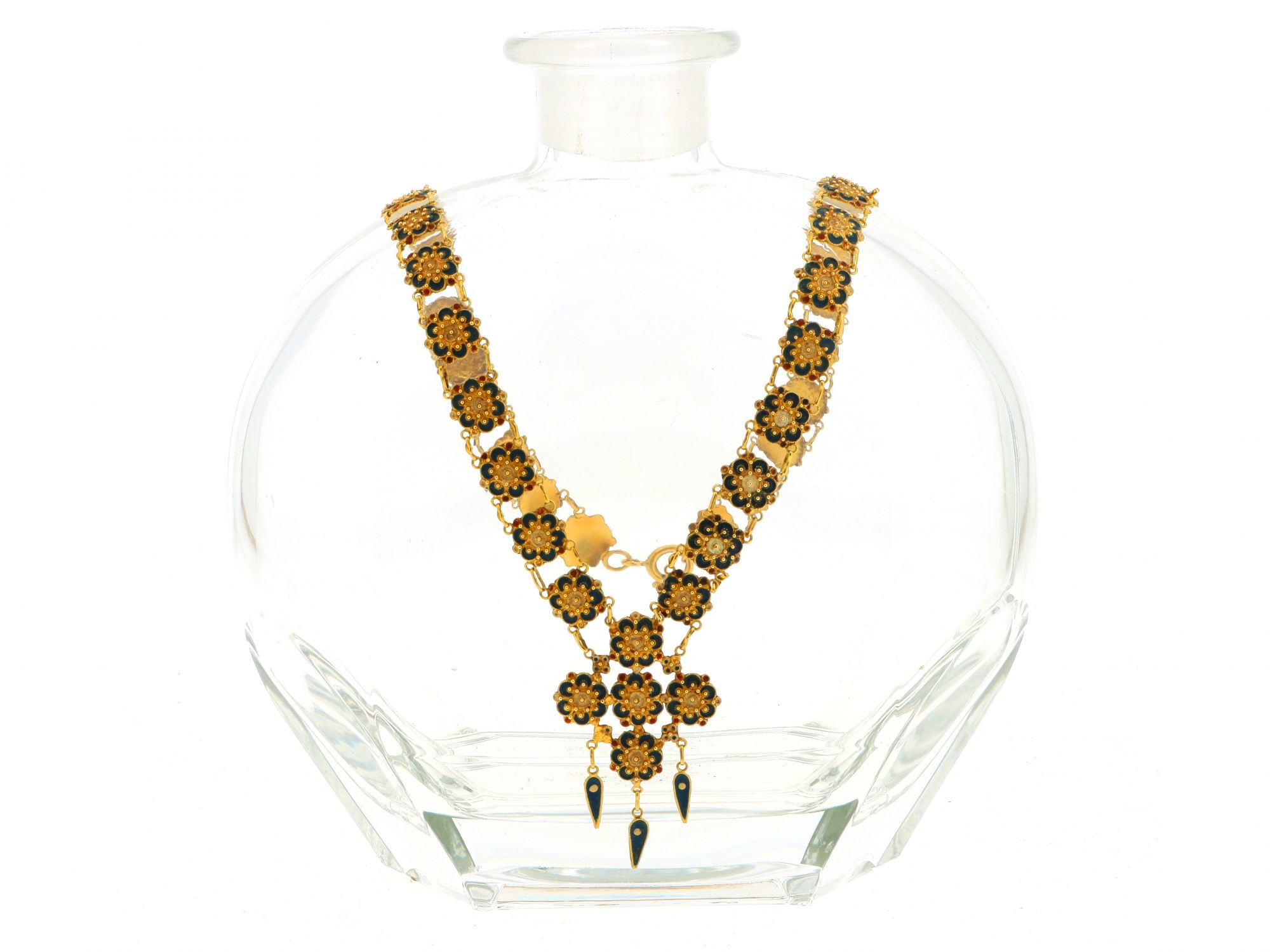 Lote 001 - Colar ANTIGO em Ouro de malha Caramujo com Rosas Portuguesas, trabalhados e pintados à mão em FILIGRANA, com centro mais caído, acompanhado por três pingentes em losango, elaborado em OURO 19,2 QUILATES. Estado de Conservação: pequenas falhas ou imperfeições. Contraste: Cabeça de Dragão 800 (1938-1984 - ao abrigo do Decreto Lei 120/2017, artigo 3.º, alínea y). Medidas (CxL): 46,1*3,1cm. Peso Total: 28,85g.