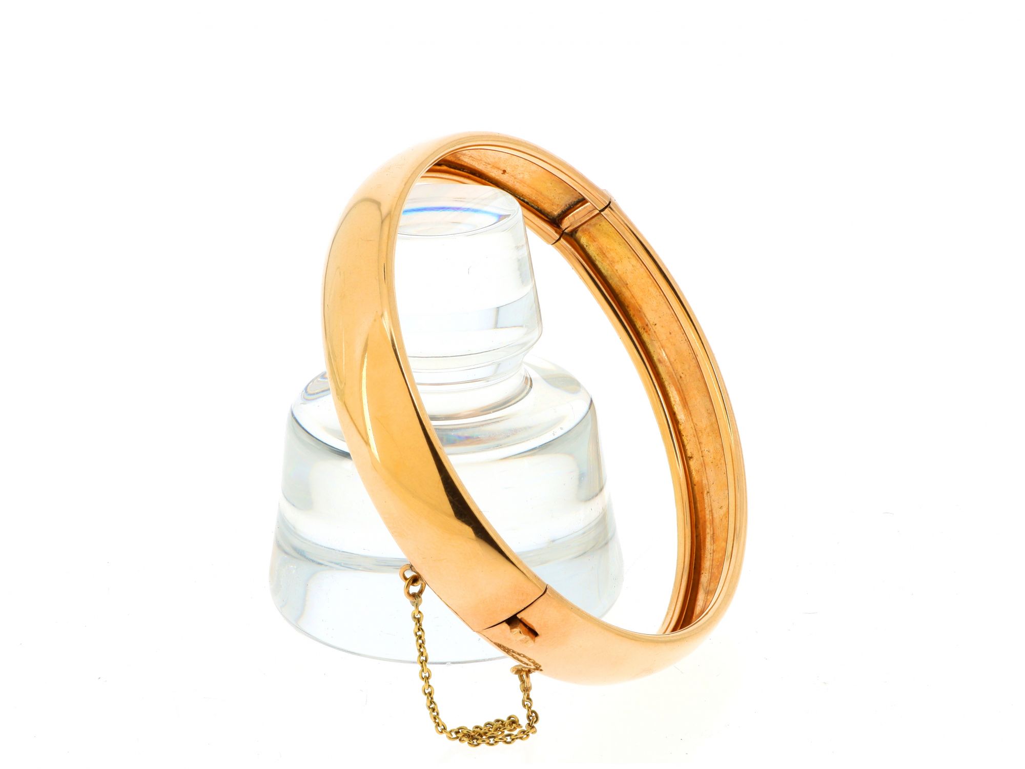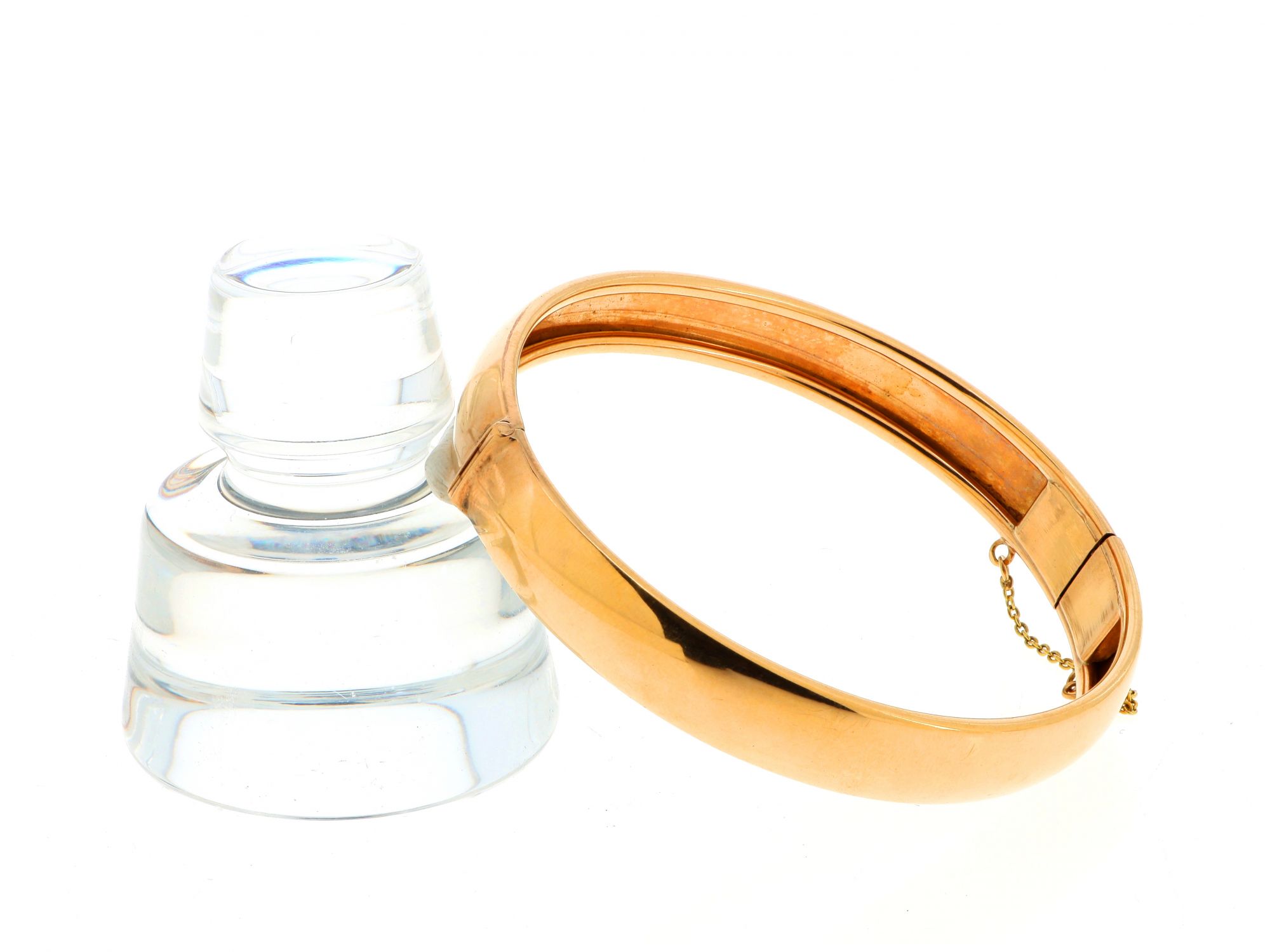 Lote 034 - Escrava ANTIGA em Ouro lisa e polida com fecho caixa e corrente de proteção, elaborado em OURO 19,2 QUILATES. Estado de Conservação: Bom, sinais de uso. Contraste: Cabeça de Dragão 800 (1938-1984 - ao abrigo do Decreto Lei 120/2017, artigo 3.º, alínea y). Medidas (CxLxA): 8,6*1*7,1cm. Peso Total: 15,71g.