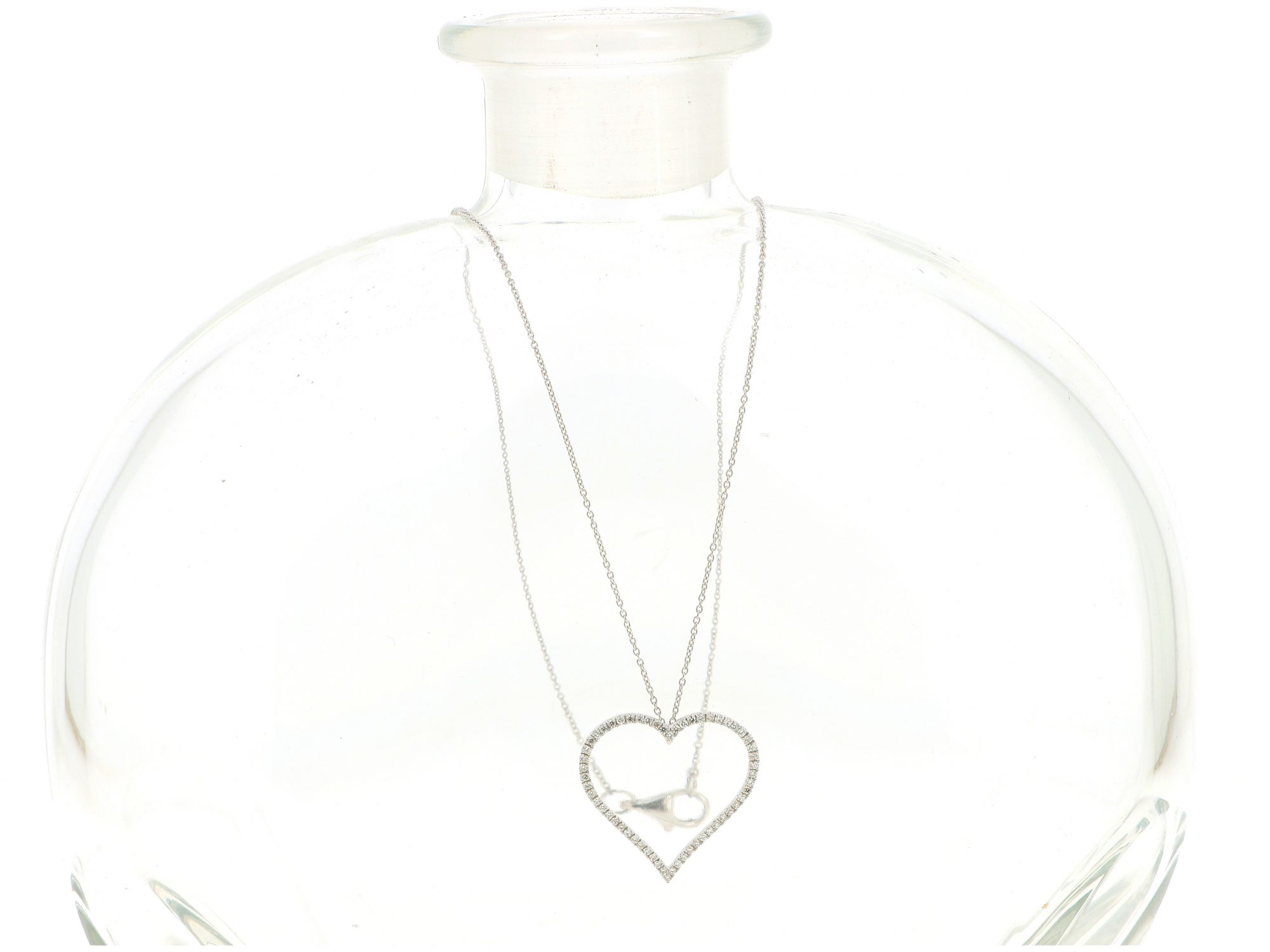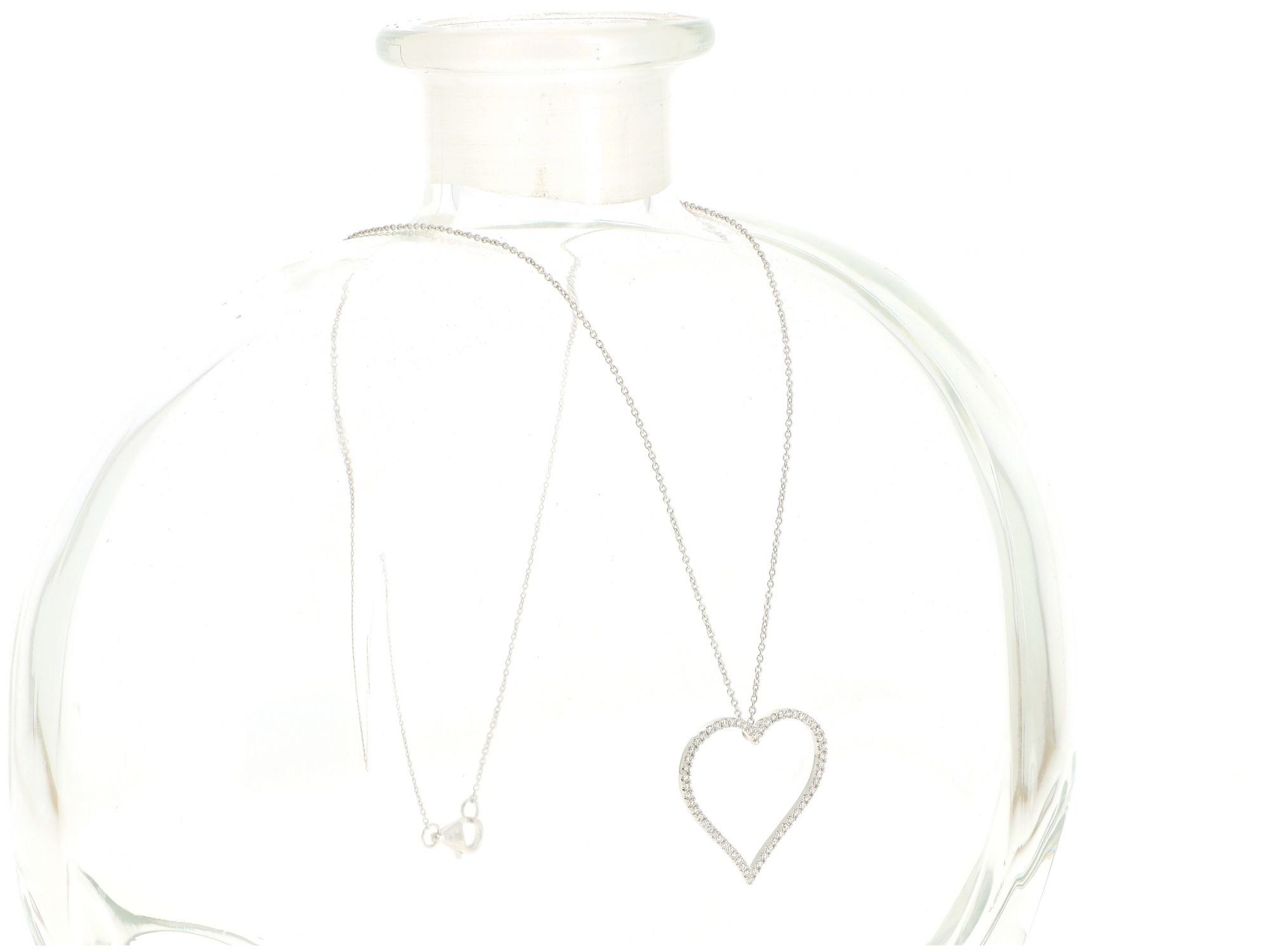 Lote 039 - Gargantilha em Ouro Branco de malha Elo Português com medalha Coração recortado, cravejado com 58 DIAMANTES em talhe brilhante, elaborado em OURO 18 QUILATES. Estado de Conservação: Muito Bom. Contraste: Marca 750. (OURO - ao abrigo do Decreto Lei 120/2017, artigo 3.º, alínea x). Medidas (CxL): 42*2,3cm. Peso Total: 2,83g.