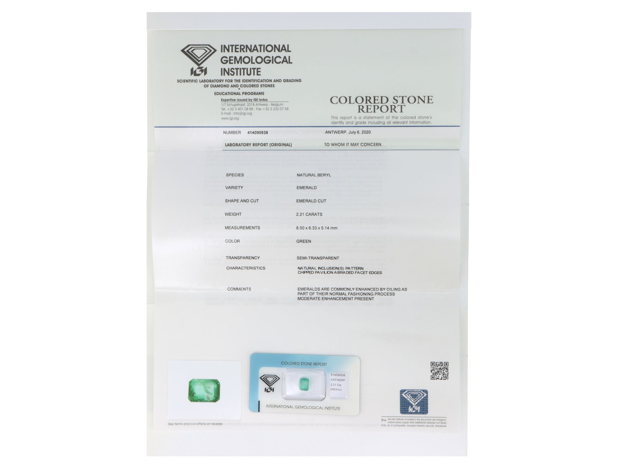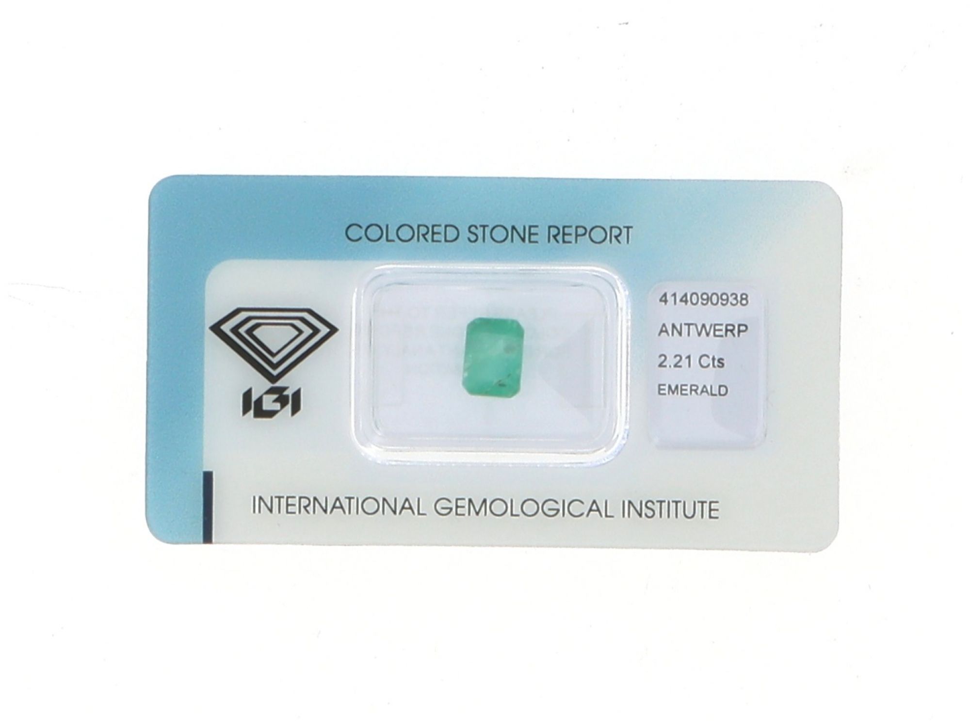 Lote 28 - Pedra Esmeralda Natural, em talhe esmeralda, cor "Green", semi-transparente. Com Certificado IGI Antwerpia Nº 414090938. Gema em invólucro Selado. Estado de Conservação: Excelente. Medidas (CxLxA): 8.50*6.33*5.14 mm. Peso Total (ct): 2,21.