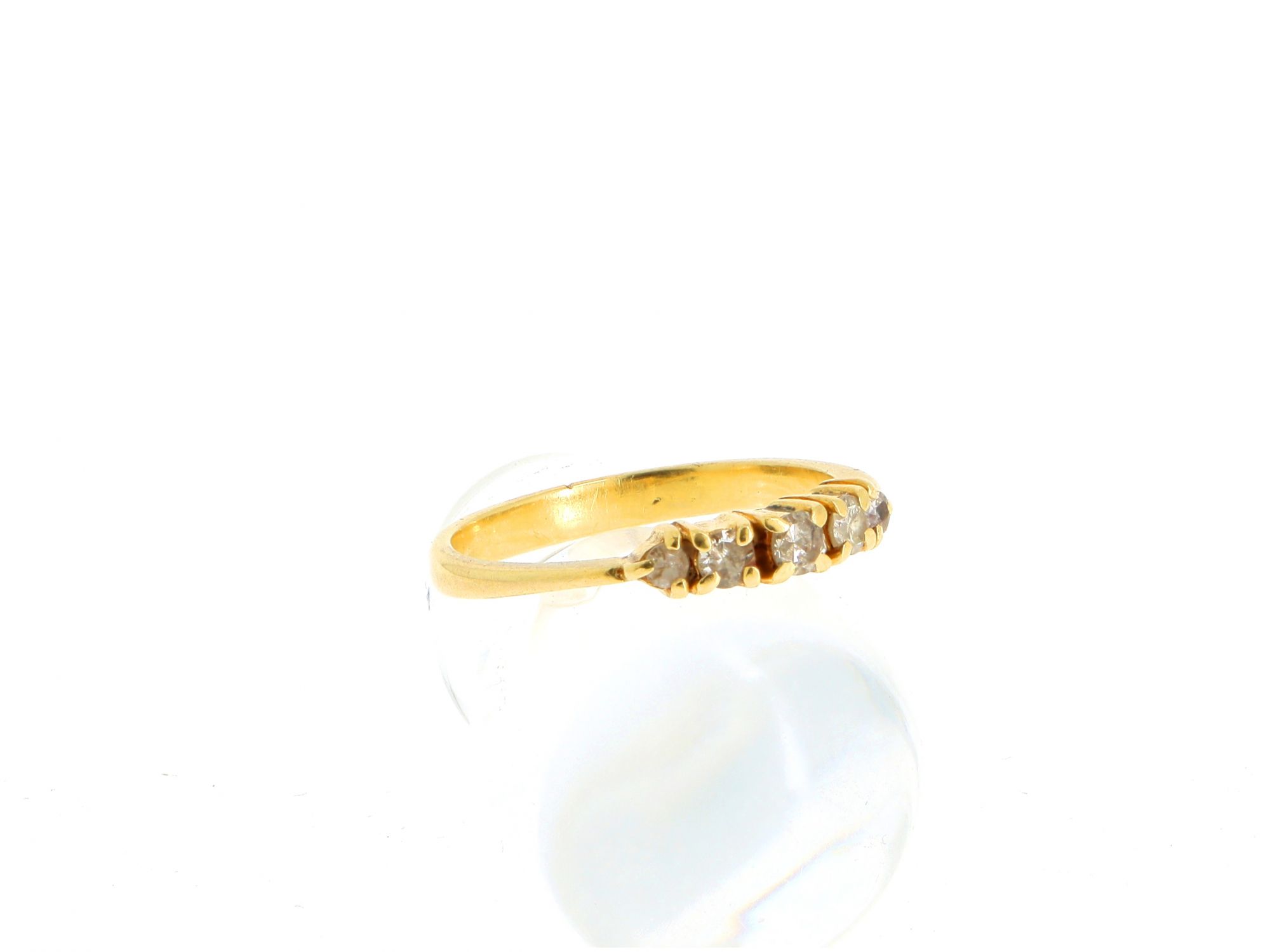 Lote 039 - Anel Noivado elaborado em OURO 19,2 QUILATES com parte superior em relevo e cravejada com 5 DIAMANTES em talhe redondo brilhante, . Estado de Conservação: Bom. Contraste: sem marcas de contraste, com mais de 50 anos ao abrigo do Decreto Lei 120/2017, artigo 2.º, alínea c). Tam.: 16. Medidas (CxLxA): 2,1*0,3*2,1cm. Peso Total: 2,62g.