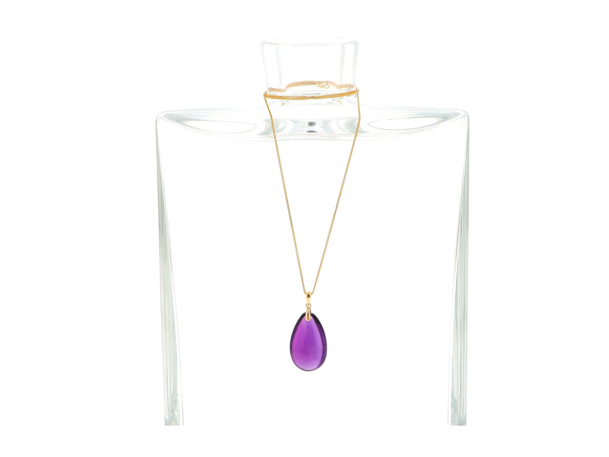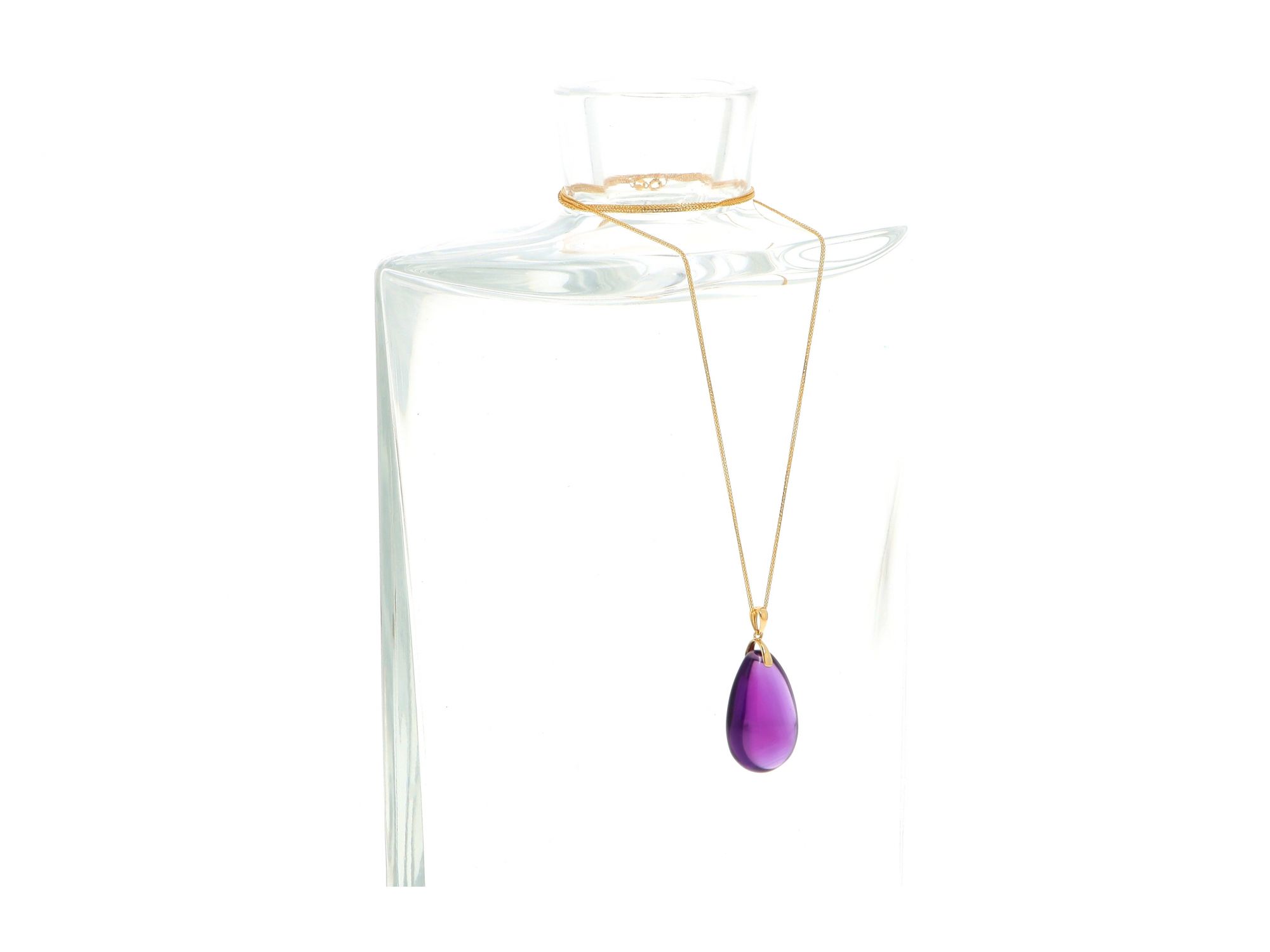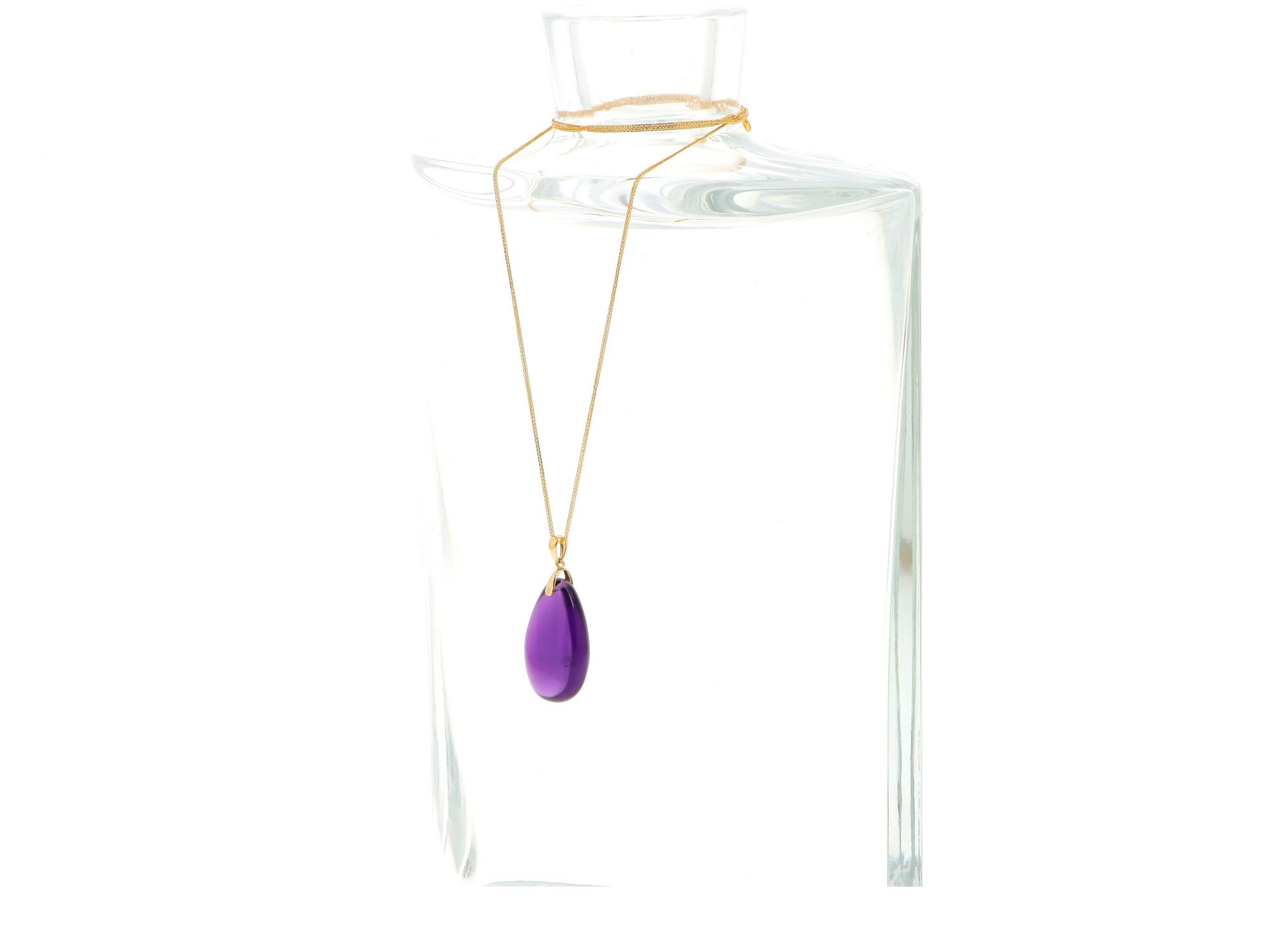 Lote 021 - Fio em Ouro de malha Veneziana e fecho bóia,com pingente decorado com IOLITE LILÁS elaborado em OURO 18 QUILATES. Estado de Conservação: Muito Bom, ligeiros sinais de uso. Contraste: Marca 750. (OURO - ao abrigo do Decreto Lei 120/2017, artigo 3.º, alínea x). Medidas (CxL): 45,7 (2,7*1,5)cm. Peso Total: 4,78gr.