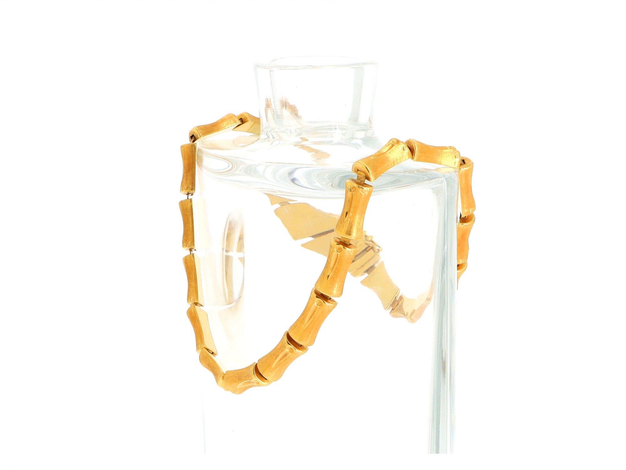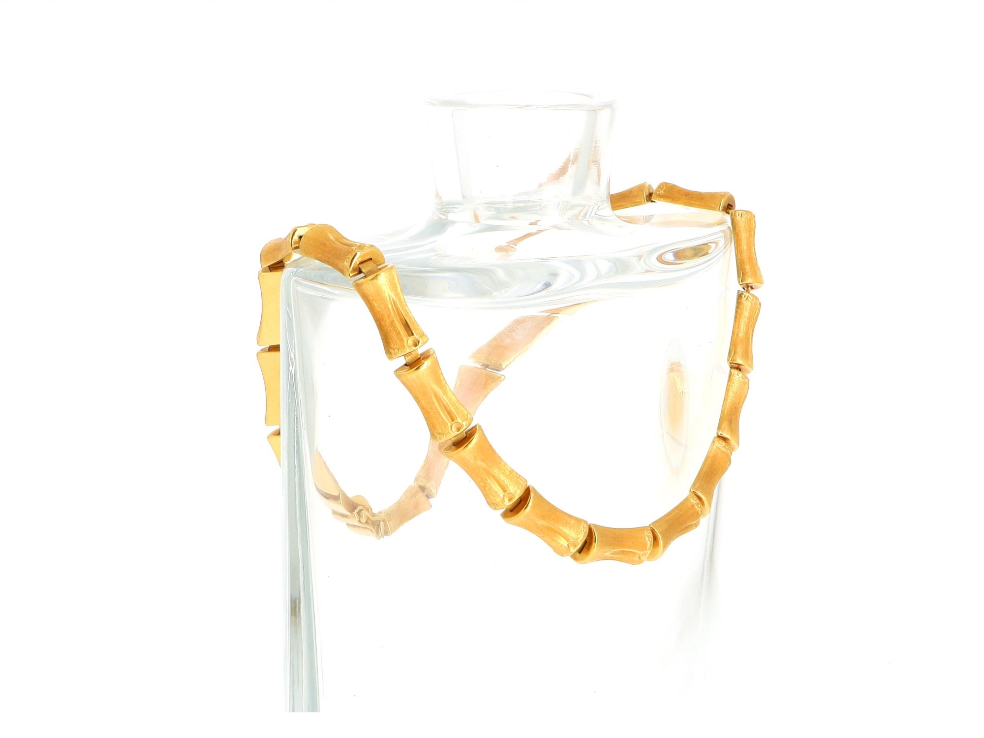 Lote 001 - Gargantilha em Ouro escovado em malha de cana de Bambu e com fecho caixa com mola de proteção, elaborado em OURO 19,2 QUILATES. Estado de Conservação: Muito Bom. Contraste: Cabeça de Veado 800 (OURO - 1985-2020, ao abrigo do Decreto Lei 120/2017, artigo 3.º, alínea y). Medidas (Comp): 40,5cm. Peso Total: 42,74g.