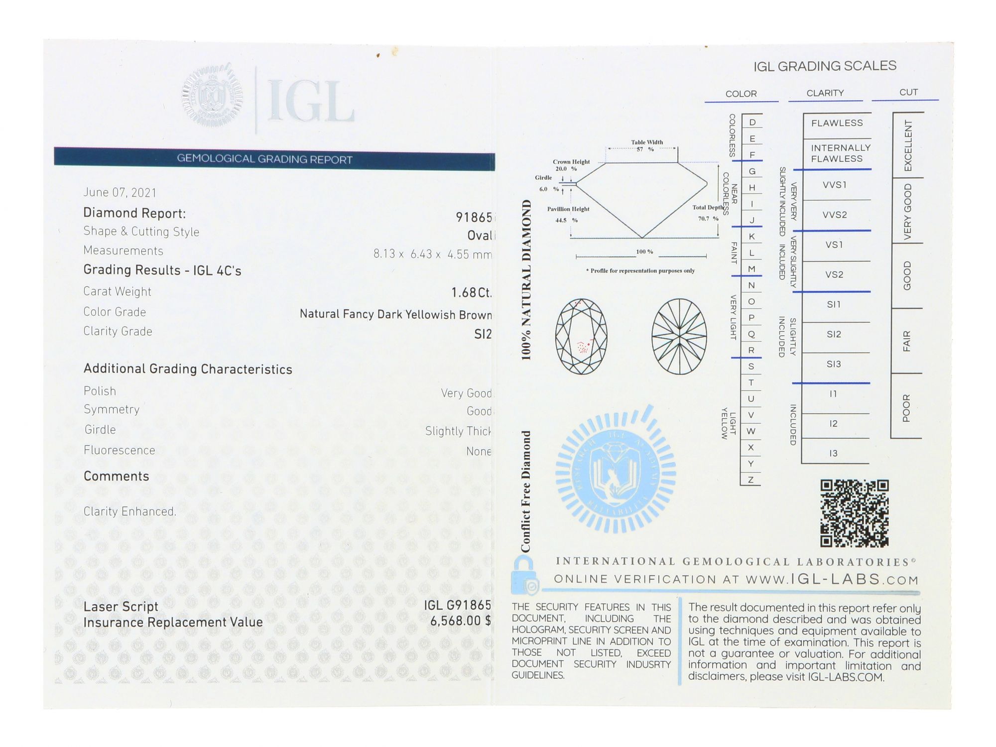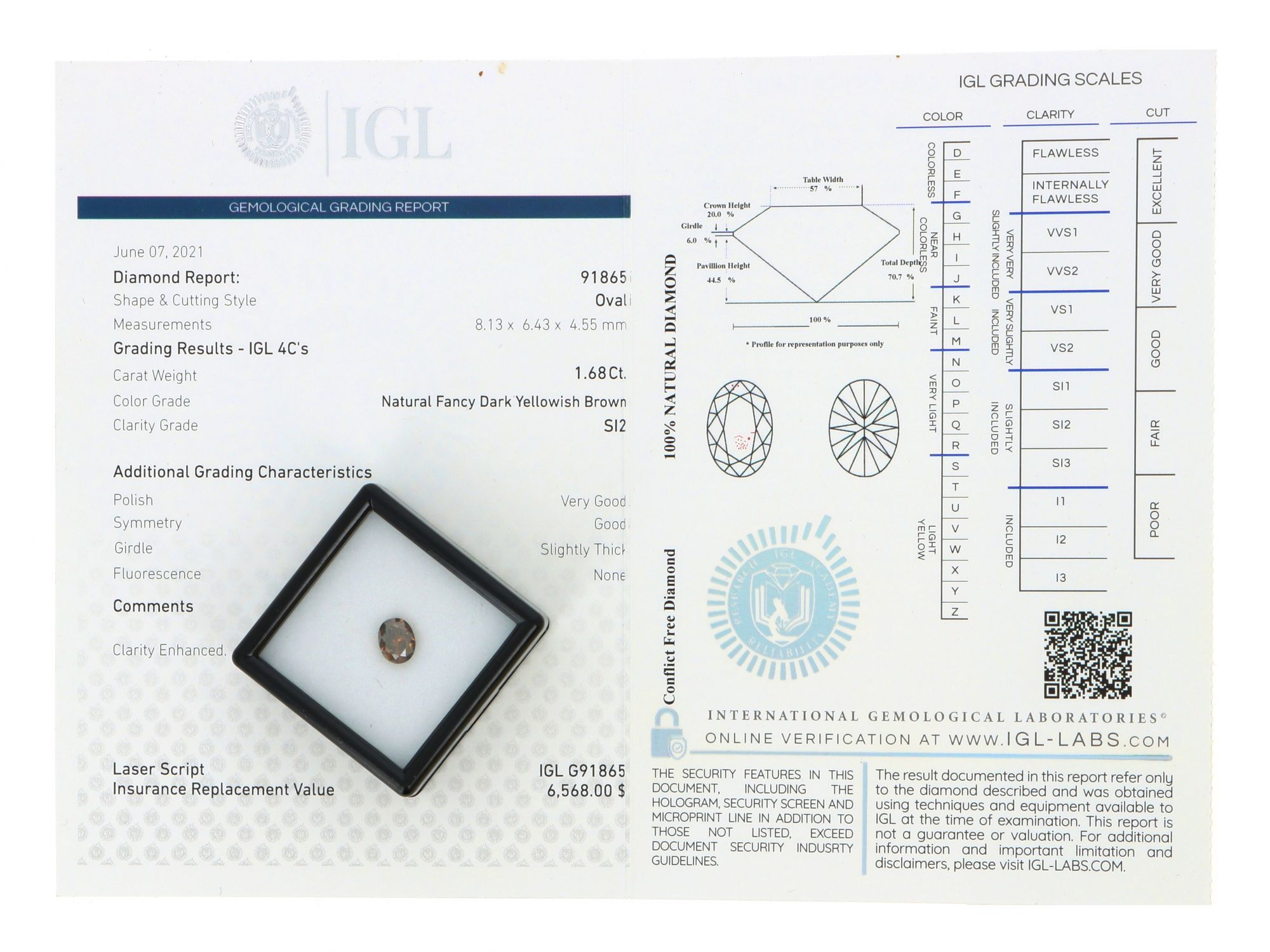 Lote 21 - Pedra Diamante Natural, talhe Brilhante Redondo, cor "Natural Fancy Dark Yellowish Brown", pureza SI2, com tratamento de claridade. Com certificado IGL (International Gemological Laboratories) Nº 91865. Valor estimado de retalho de € 5.639 ($ 6.568) presente no certificado. Número do certificado inscrito a laser no diamante. Estado de Conservação: Excelente. Medidas (CxLxA): 8.13*6.43*4.55mm. Peso Total (ct): 1,68.