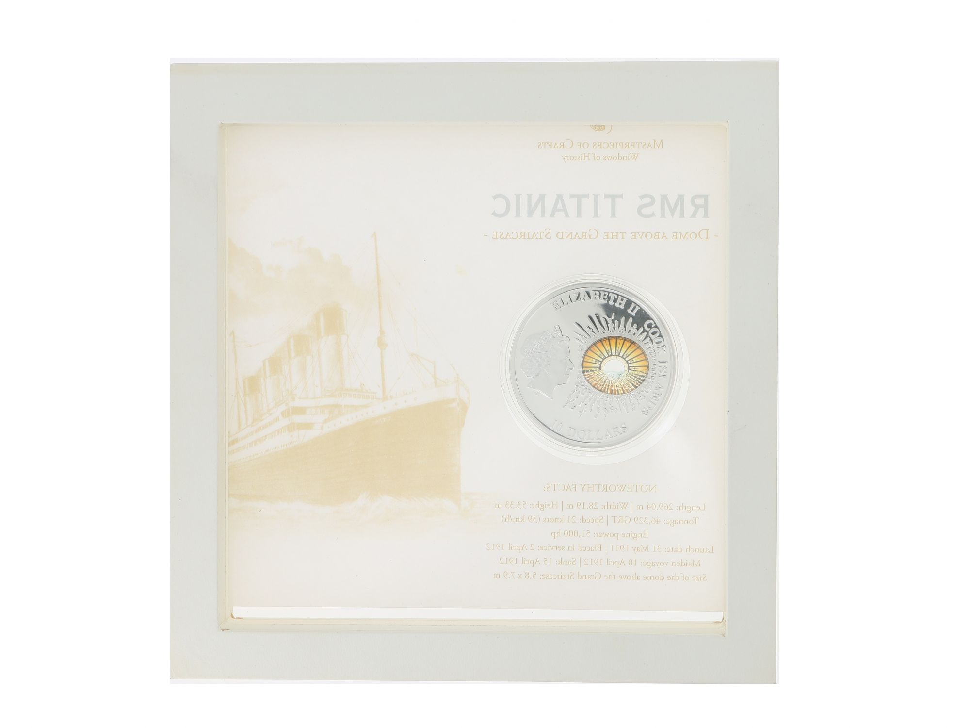 Lote 024 - Moeda Comemorativa RMS TITANIC em Prata de 10 DÓLARES, emita em 2012 e apresenta uma moldura com informações sobre o navio e uma imagem dele, elaborado em PRATA 925. Esta moeda faz parte da coleção “MASTERPIECES OF CRAFTS” e celebra o centenário do navio. Peso da moeda é de 50g. Acompanhada com Certificado de Autenticidade. Estado de Conservação: Muito Bom. Contraste: Marca 925. (PRATA - ao abrigo do Decreto Lei 120/2017, artigo 3.º, alínea x). Medidas (CxLxA): 18*18,5*3,2cm. Peso Total: 389,92g.