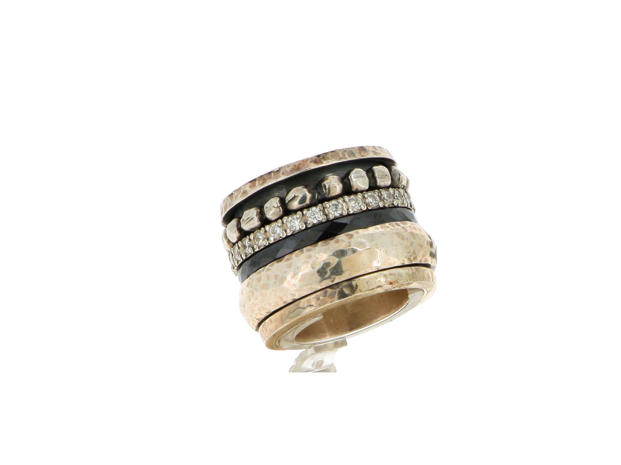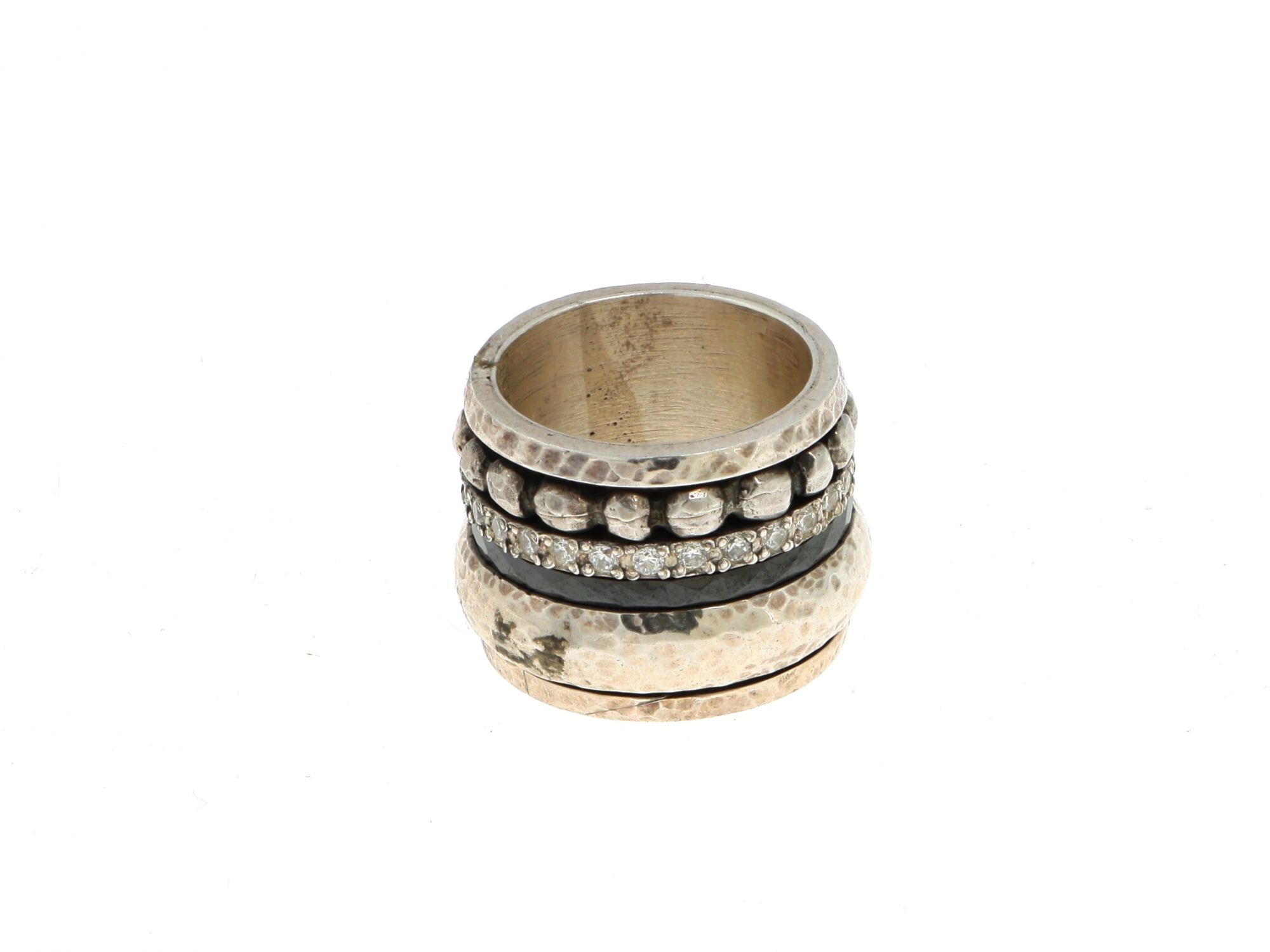 Lote 066 - Aliança Anti-Stress (Giratória) em Prata martelada, com quatro divisórias todas elas distintas, elaborado em PRATA 925. Estado de Conservação: Bom, sinais de uso. Contraste: Marca 925. (PRATA - ao abrigo do Decreto Lei 120/2017, artigo 3.º, alínea x). Tam.: 11,5. Medidas (CxLxA): 2,1*1,7*2,1cm. Peso Total: 20,48g.