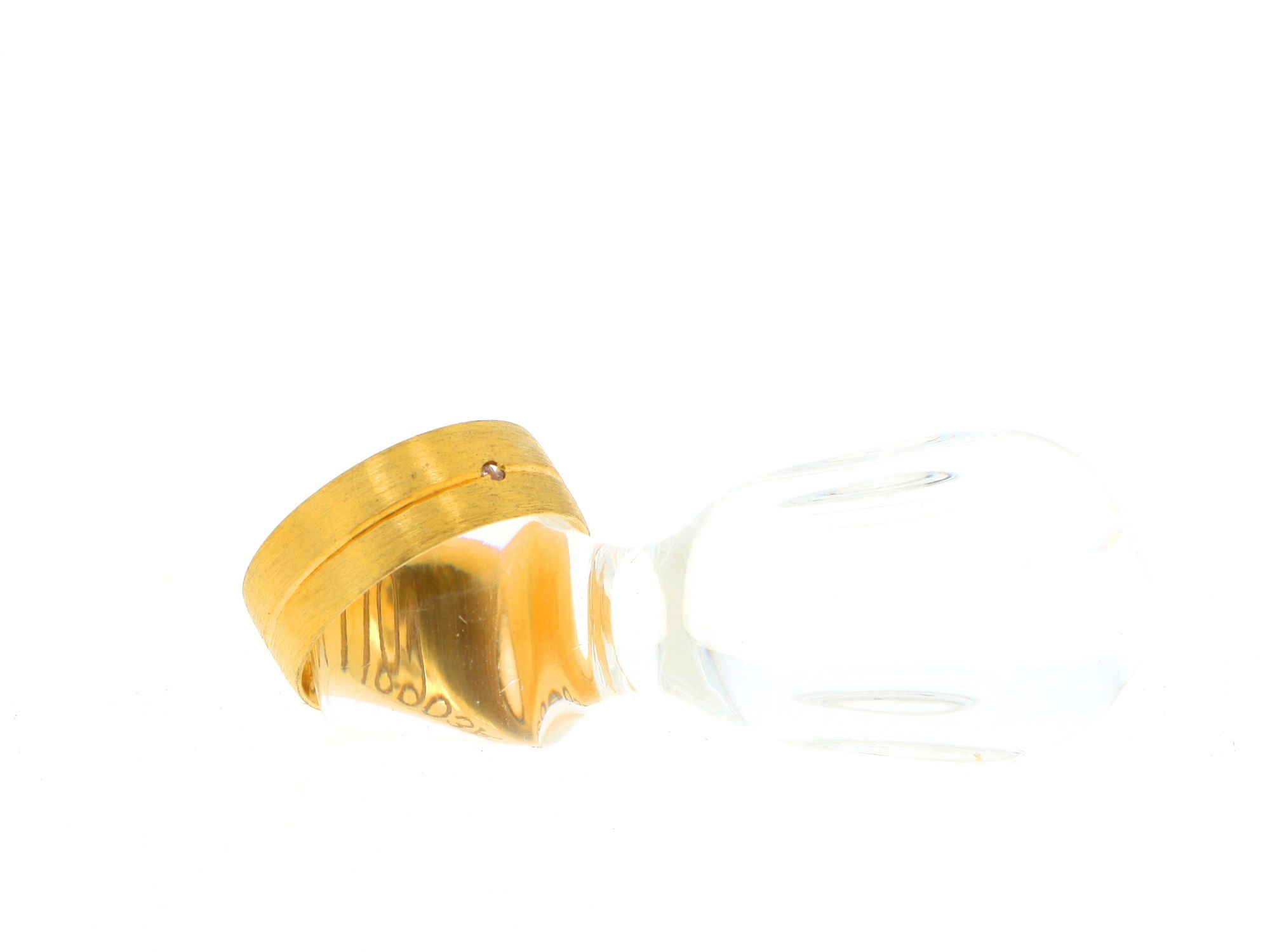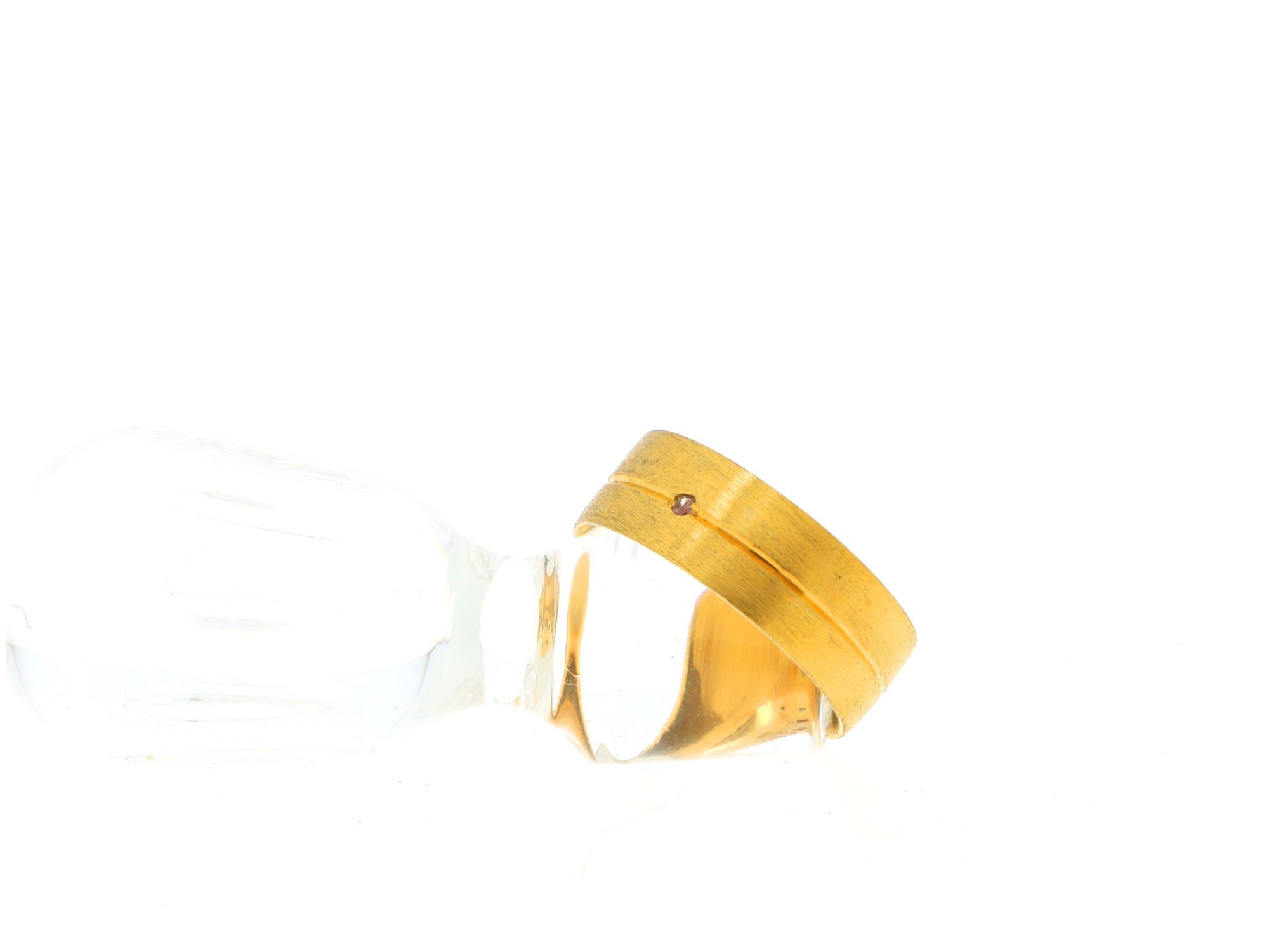 Lote 059 - Aliança em Prata Dourada escovada com listra no centro e cravejada com uma zicórnia incolor, elaborado em PRATA 925. Estado de Conservação: Bom. Contraste: Águia virada à esquerda 925 (1985-2020 - ao abrigo do Decreto Lei 120/2017, artigo 3.º, alínea y). Tam.: 15. Medidas (CxLxA): 2*0,7*2cm. Peso Total: 4,94g.
