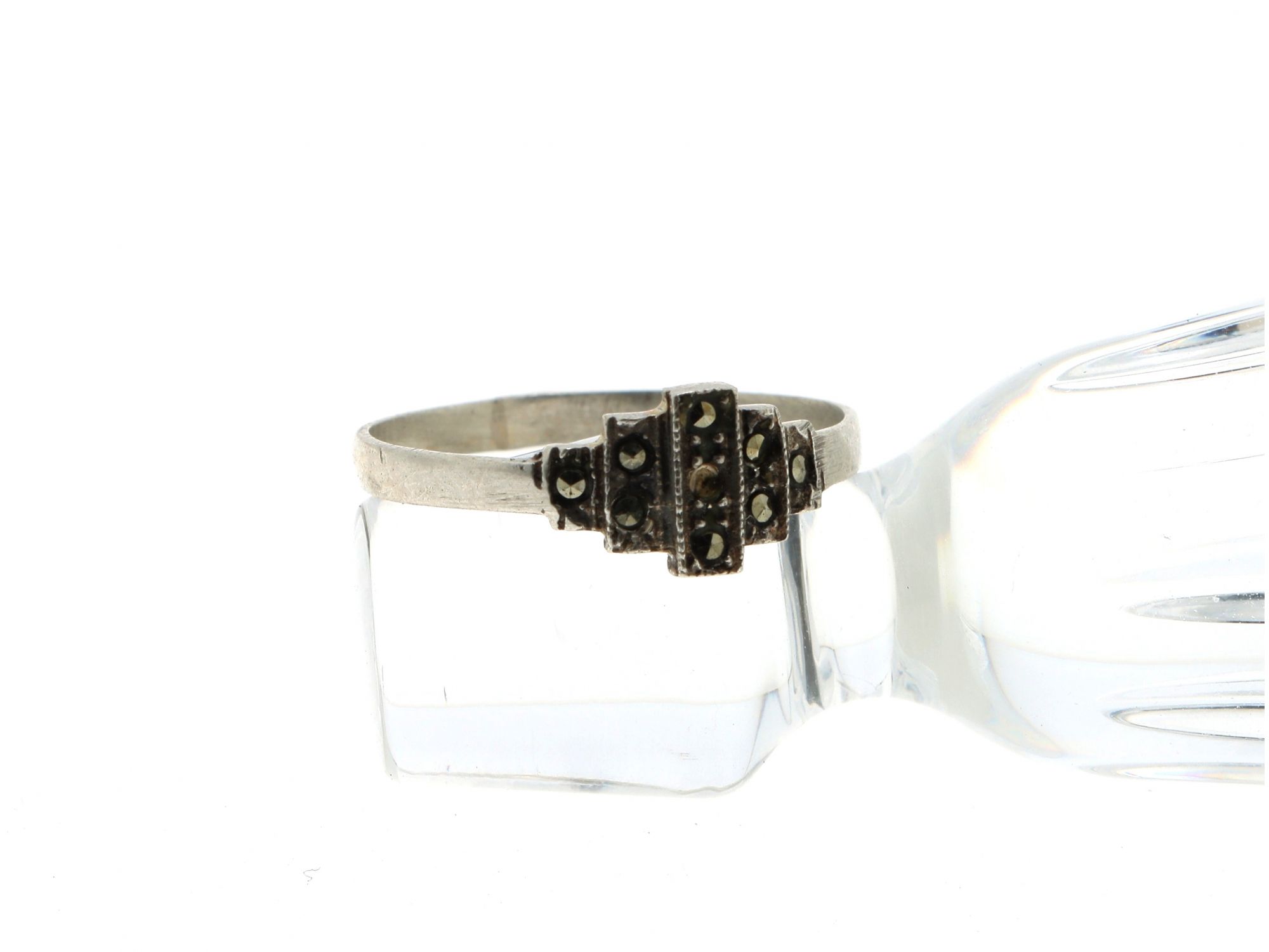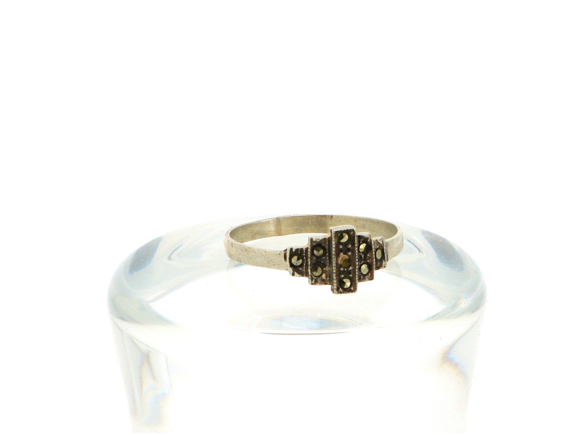 Lote 084 - Anel em Prata com topo em marcassites, elaborado em PRATA 835. FALHA DE PEDRA Estado de Conservação: pequenas falhas ou imperfeições. Contraste: Cabeça de Águia virada à direita 835 (1985-2020 - ao abrigo do Decreto Lei 120/2017, artigo 3.º, alínea y). Tam.: 19. Medidas (CxLxA): 1,9*0,7*2,1cm. Peso Total: 1,33g.
