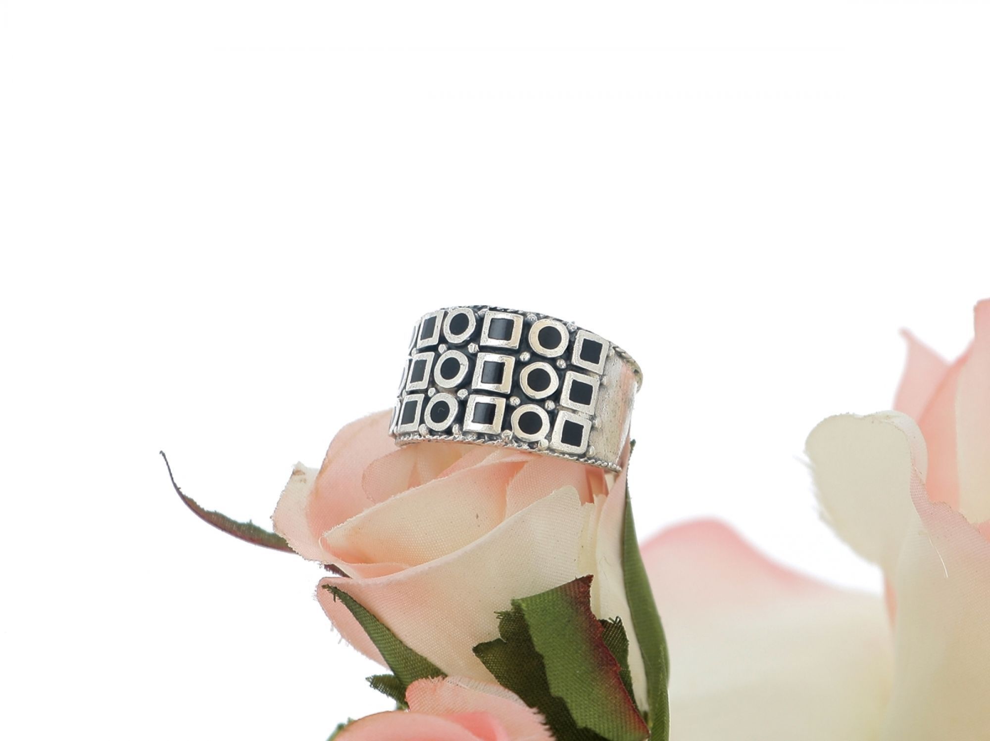 Lote 032 - Anel elaborado em PRATA 925 decorado com esmalte preto. Estado de Conservação: Muito Bom. Contraste: Marca 925. (PRATA - ao abrigo do Decreto Lei 120/2017, artigo 3.º, alínea x). Tam.: 17,5. Medidas (LxA): 0,61x1,35x2,2cm. Peso Total: 7.80g.