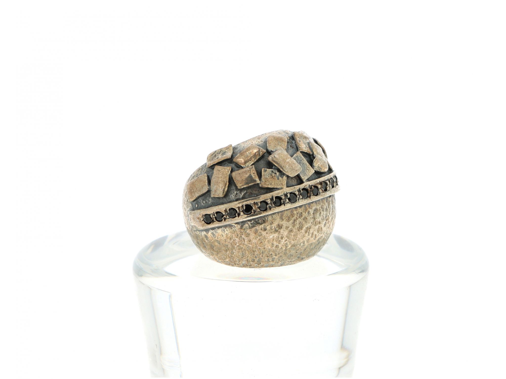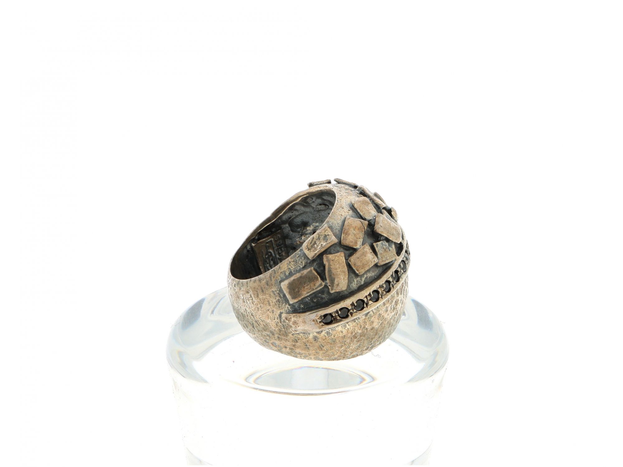 Lote 005 - Anel em Prata largo martelado com parte central com linha cravejada de zicórnias pretas e outra parte trabalhado em relevo, elaborado em PRATA 925. Estado de Conservação: Bom, sinais de uso. Contraste: Cabeça de Águia virada à esquerda 925 (1985-2020 - ao abrigo do Decreto Lei 120/2017, artigo 3.º, alínea y). Tam.: 16. Medidas (CxLxA): 1,9*2,3*2,5cm. Peso Total: 20,96g.