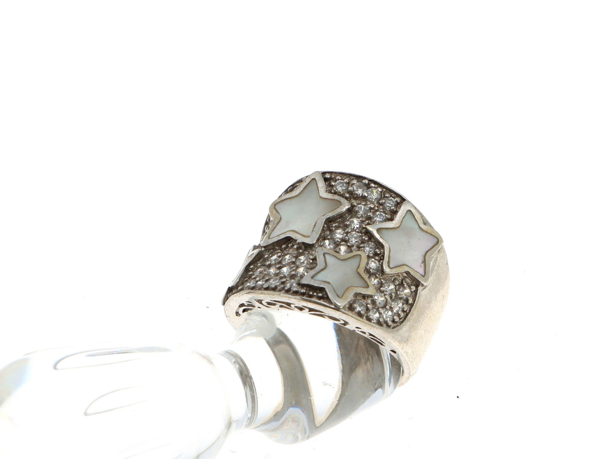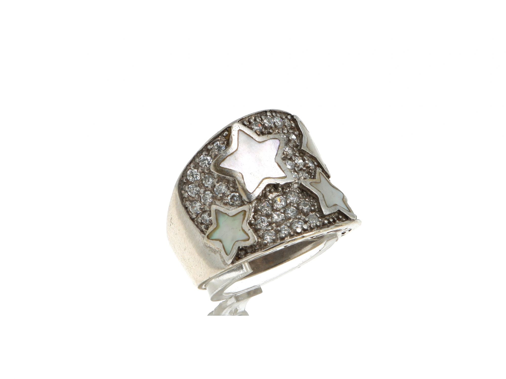 Lote 031 - Anel em Prata com topo largo com Estrelas em Madrepérola e cravejada com zicórnias cúbicas incolores, elaborado em PRATA 925. Estado de Conservação: Bom, sinais de uso. Contraste: Cabeça de Águia virada à esquerda 925 (1985-2020 - ao abrigo do Decreto Lei 120/2017, artigo 3.º, alínea y). Tam.: 15. Medidas (CxLxA): 2,2*1,8*2,3cm. Peso Total: 9,88g.