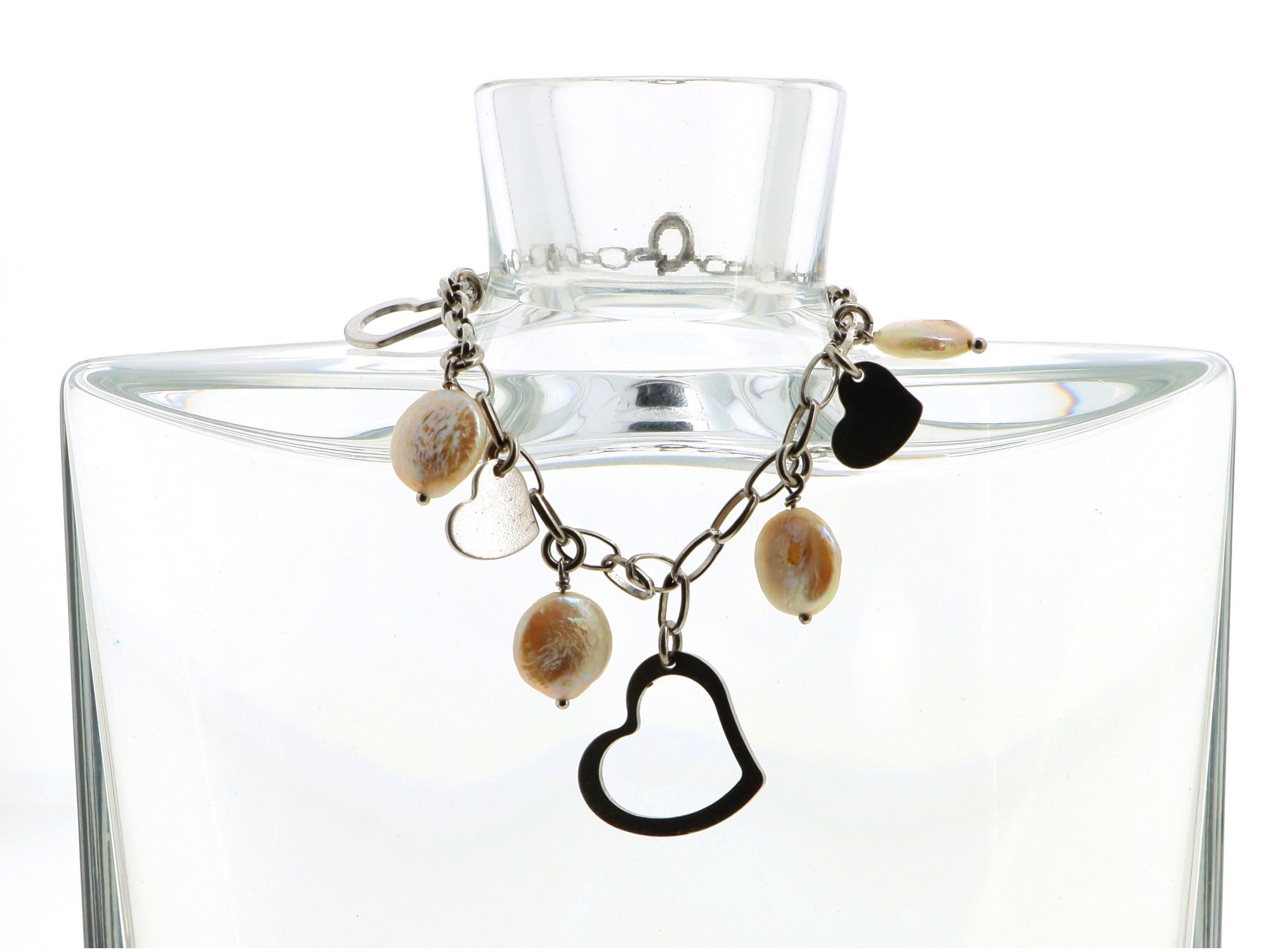 Lote 003 - Pulseira em Prata de malha elos com pendentes em coração e madre pérola com fecho bóia, elaborado em PRATA 925. Estado de Conservação: Bom, sinais de uso. Contraste: sem marcas de contraste, com mais de 50 anos ao abrigo do Decreto Lei 120/2017, artigo 2.º, alínea c). Medidas (CxL): 17,5*2,2cm. Peso Total: 8,14g.