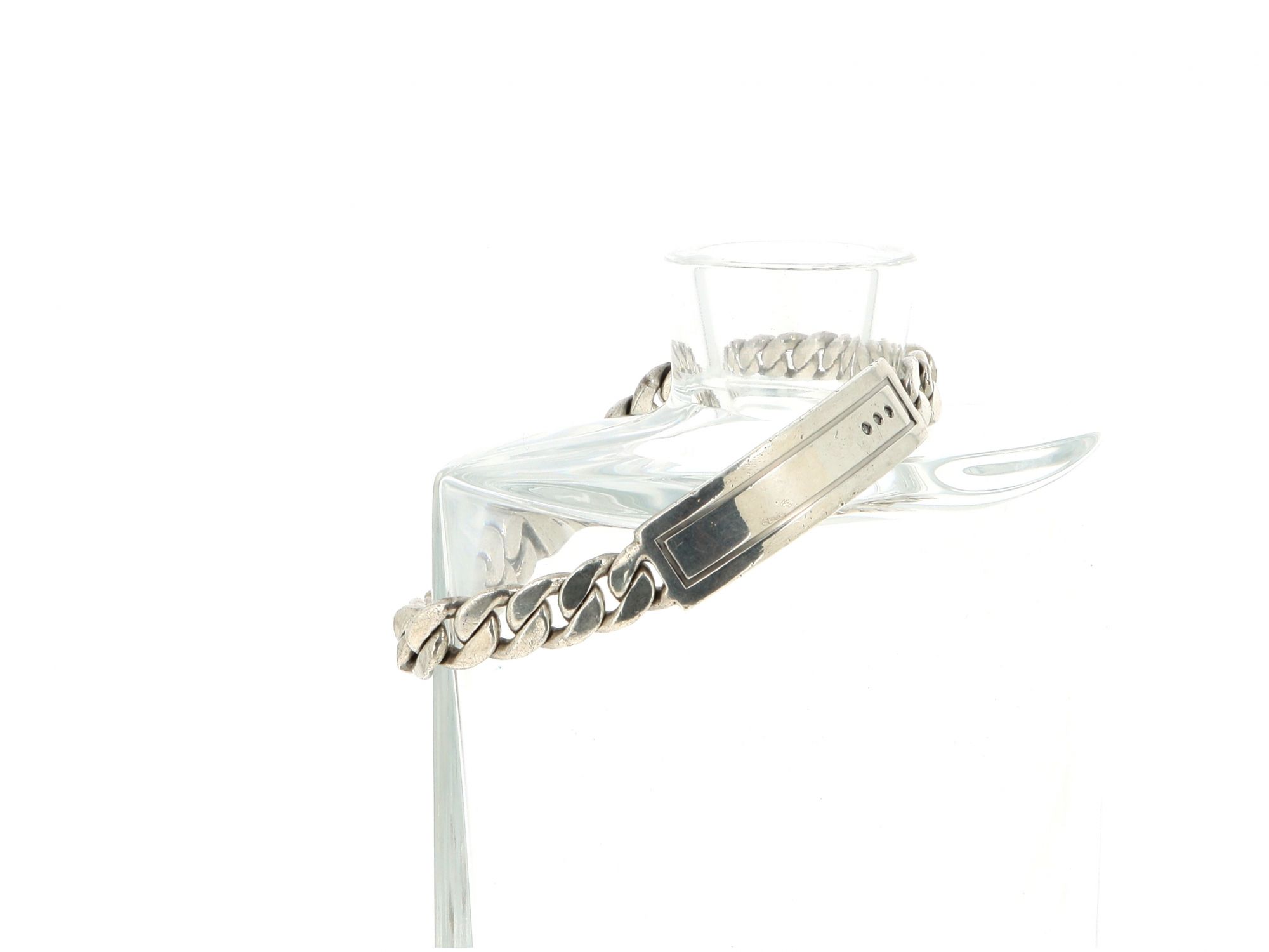 Lote 030 - Pulseira em Prata de malha barbela martelada com chapa para gravação e numa das laterais cravejada com 3 DIAMANTES/MOISSANITES com fecho caixa, elaborado em PRATA 925. Estado de Conservação: Bom, sinais de uso. Contraste: Marca 925. (PRATA - ao abrigo do Decreto Lei 120/2017, artigo 3.º, alínea x). Medidas (CxL): 23,5*1,8cm. Peso Total: 58,77g.