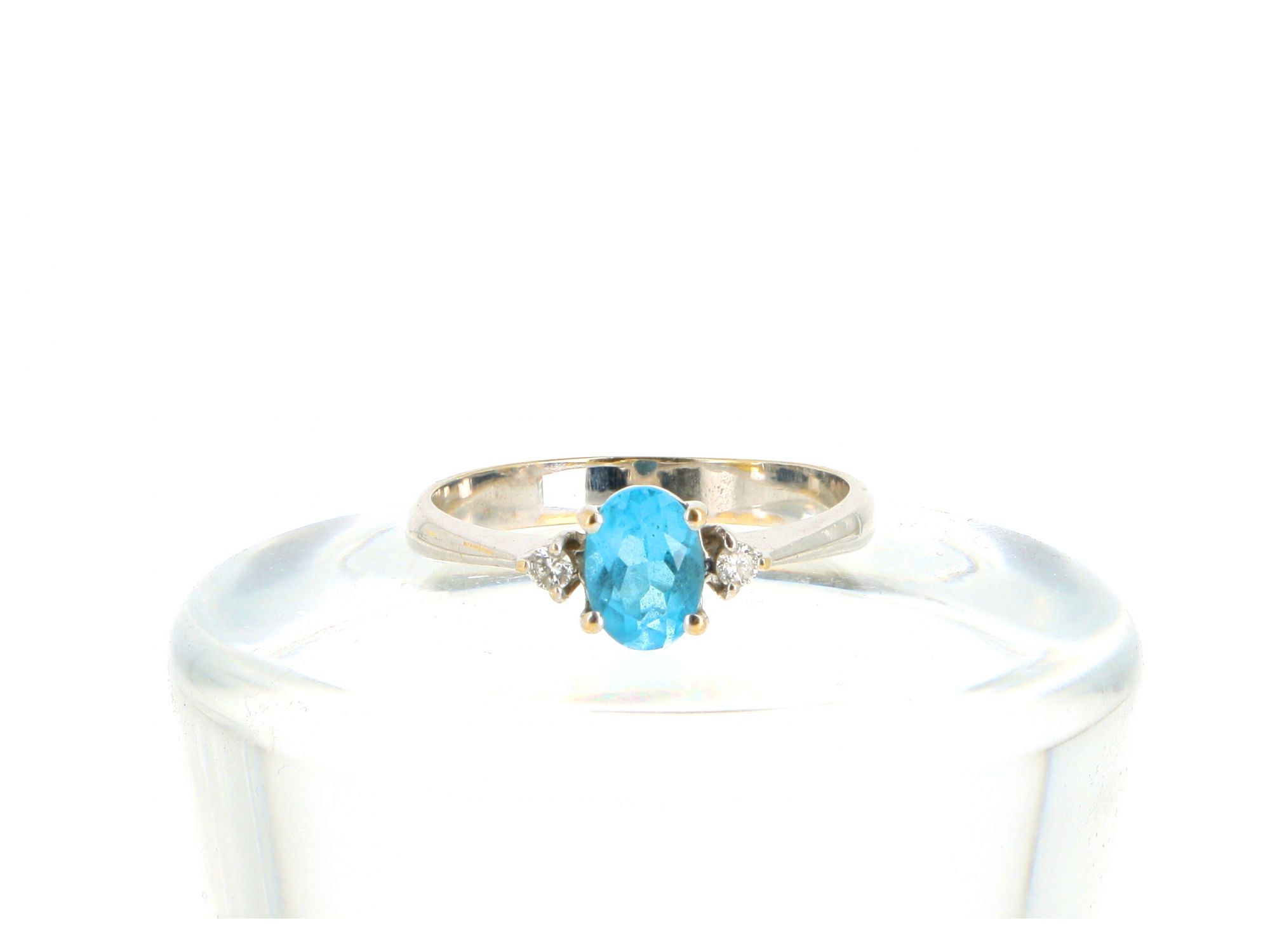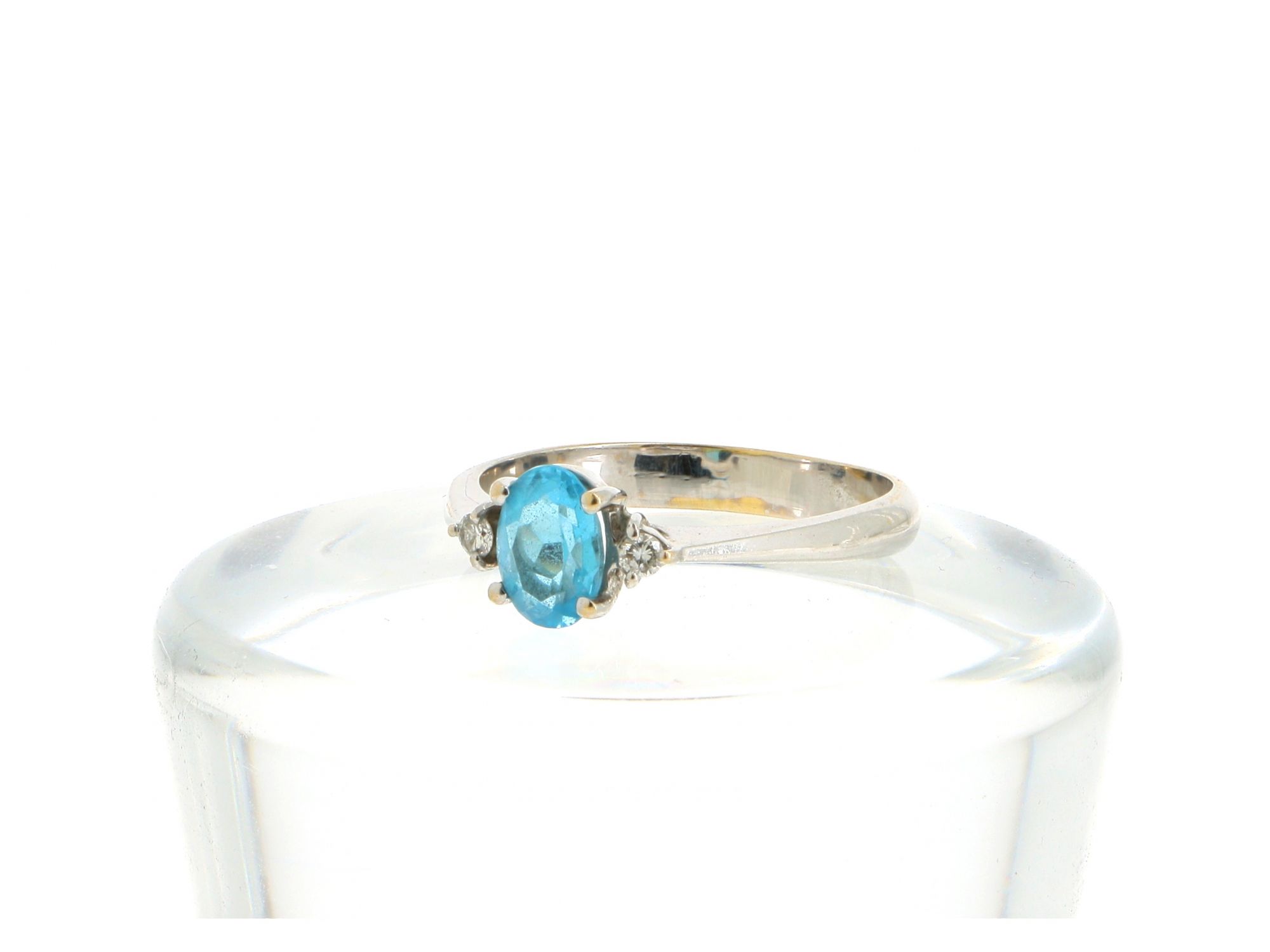 Lote 013 - Anel Solitário em Ouro Branco de 19,2 QUILATES decorado na parte central com TOPÁZIO AZUL CÉU em talhe oval e nas laterais cravejados com 2 DIAMANTES em talhe redondo brilhante. Estado de Conservação: Muito Bom, ligeiros sinais de uso. Contraste: Cabeça de Veado 800 (OURO - 1985-2020, ao abrigo do Decreto Lei 120/2017, artigo 3.º, alínea y). Tam.: 16. Medidas (CxLxA): 2*0,8*2,4cm. Peso Total: 3,28g.