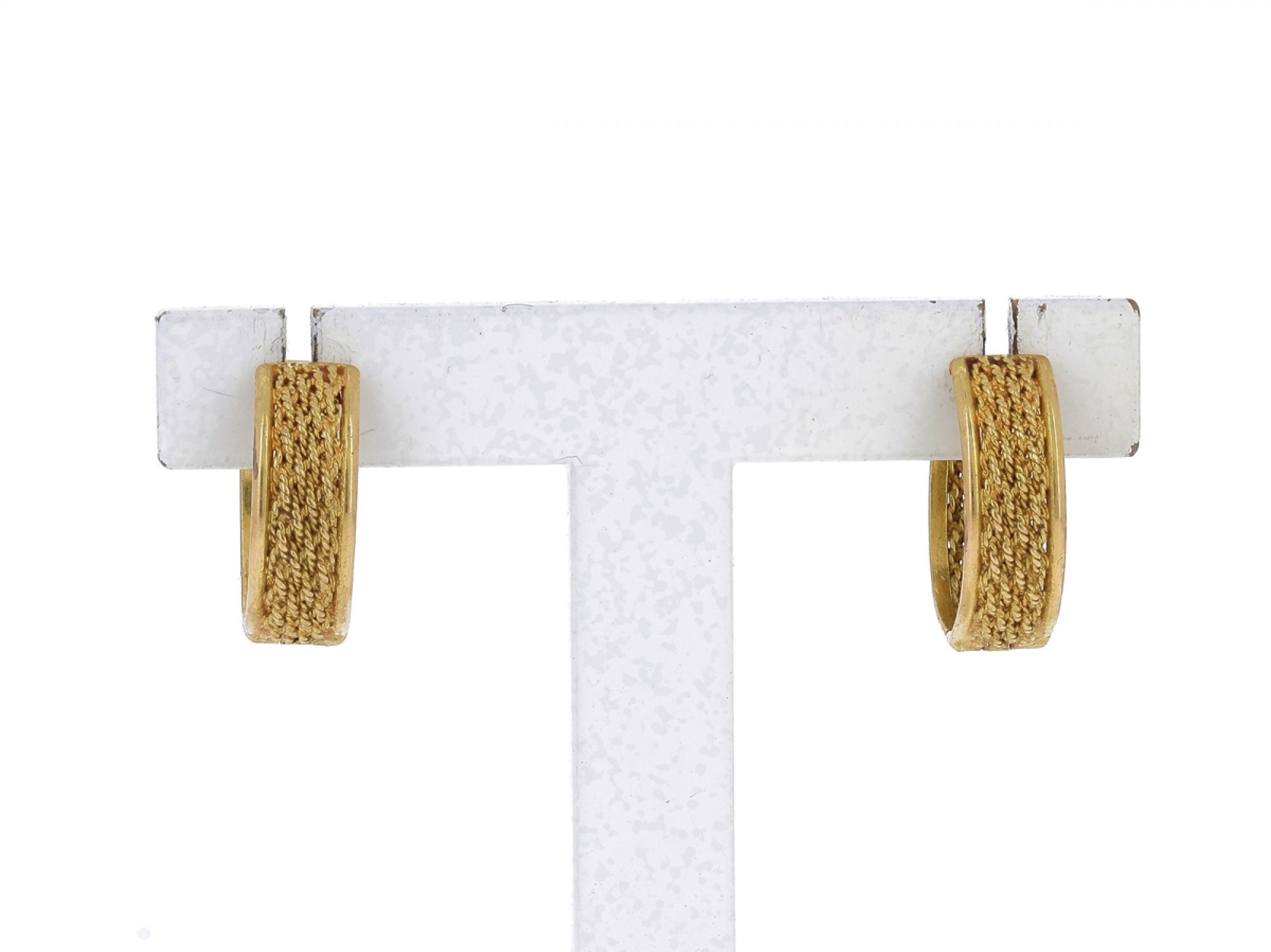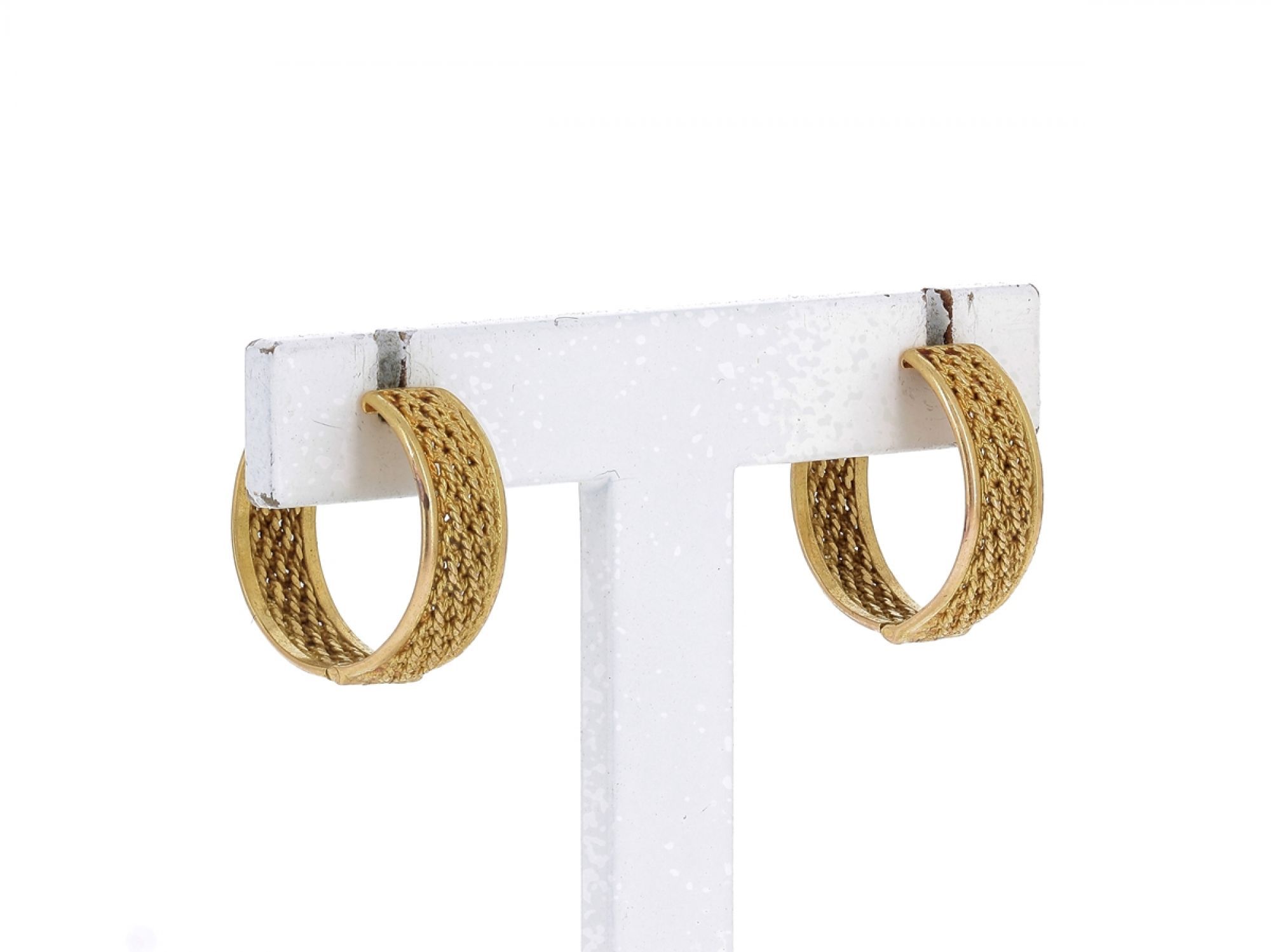 Lote 014 - Argolas elaboradas em OURO 19,2 Quilates, Trabalhadas em FILIGRANA com 0,5cm de largura. Estado de Conservação: Excelente. Contraste: Cabeça de Veado 800 (OURO - 1985-2020, ao abrigo do Decreto Lei 120/2017, artigo 3.º, alínea y). Medidas (Diâm): 1,7cmcm. Peso Total: 5,6gr.