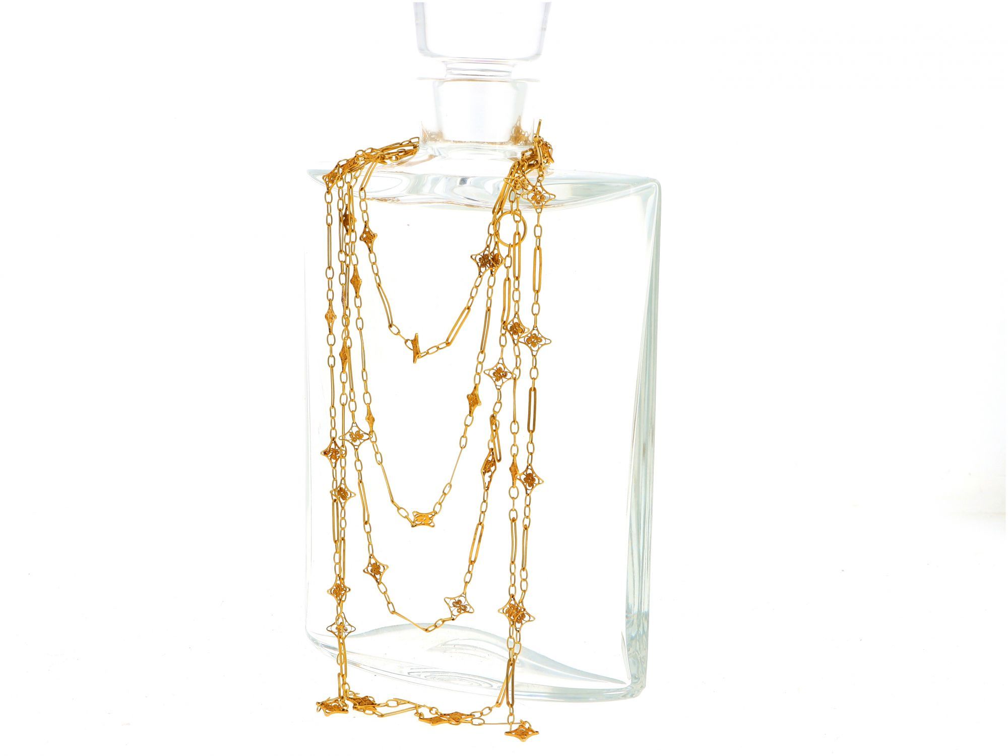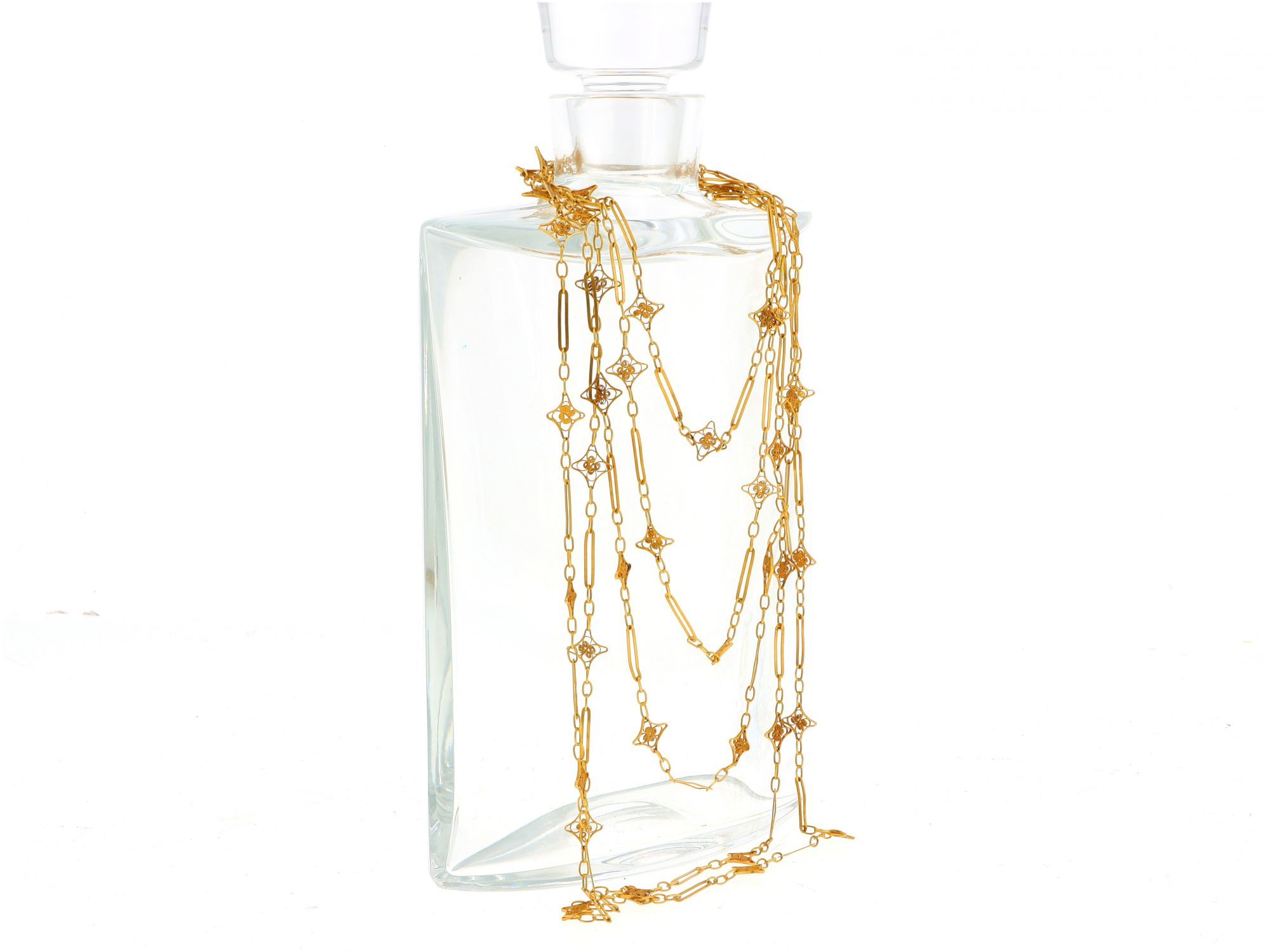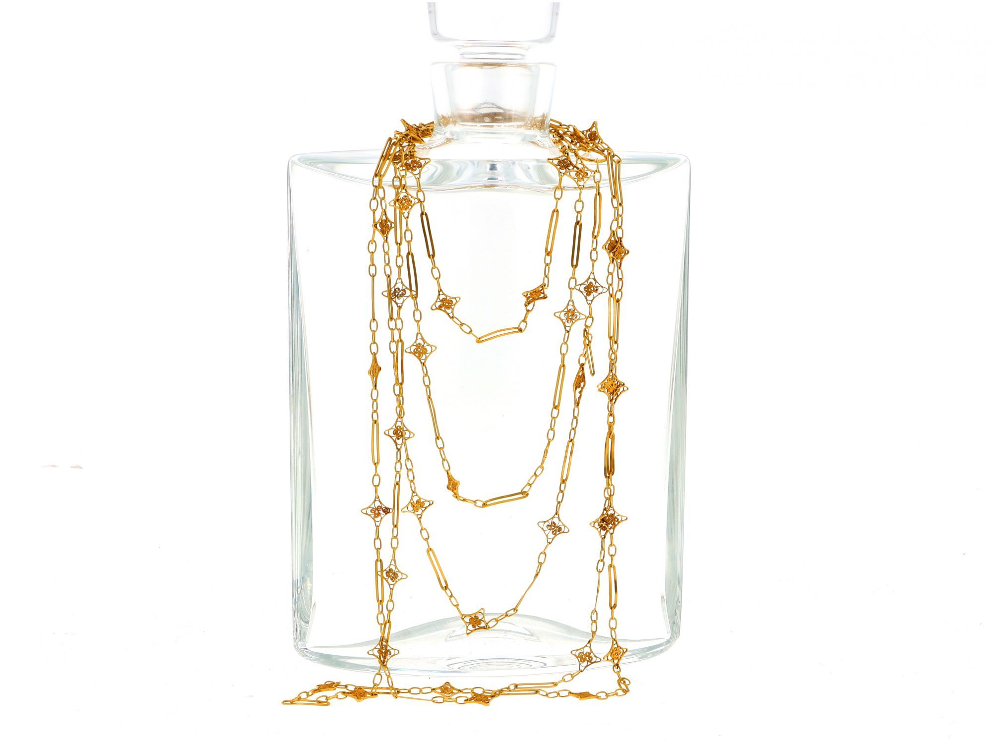 Lote 031 - Cordão Trancelim em elos e estrelas trabalhado em FILIGRANA, elaborado em OURO 19,2 QUILATES. Estado de Conservação: Bom, sinais de uso. Contraste: Cabeça de Veado 800 (OURO - 1985-2020, ao abrigo do Decreto Lei 120/2017, artigo 3.º, alínea y). Medidas (Comp): 100cm. Peso Total: 21,47g.