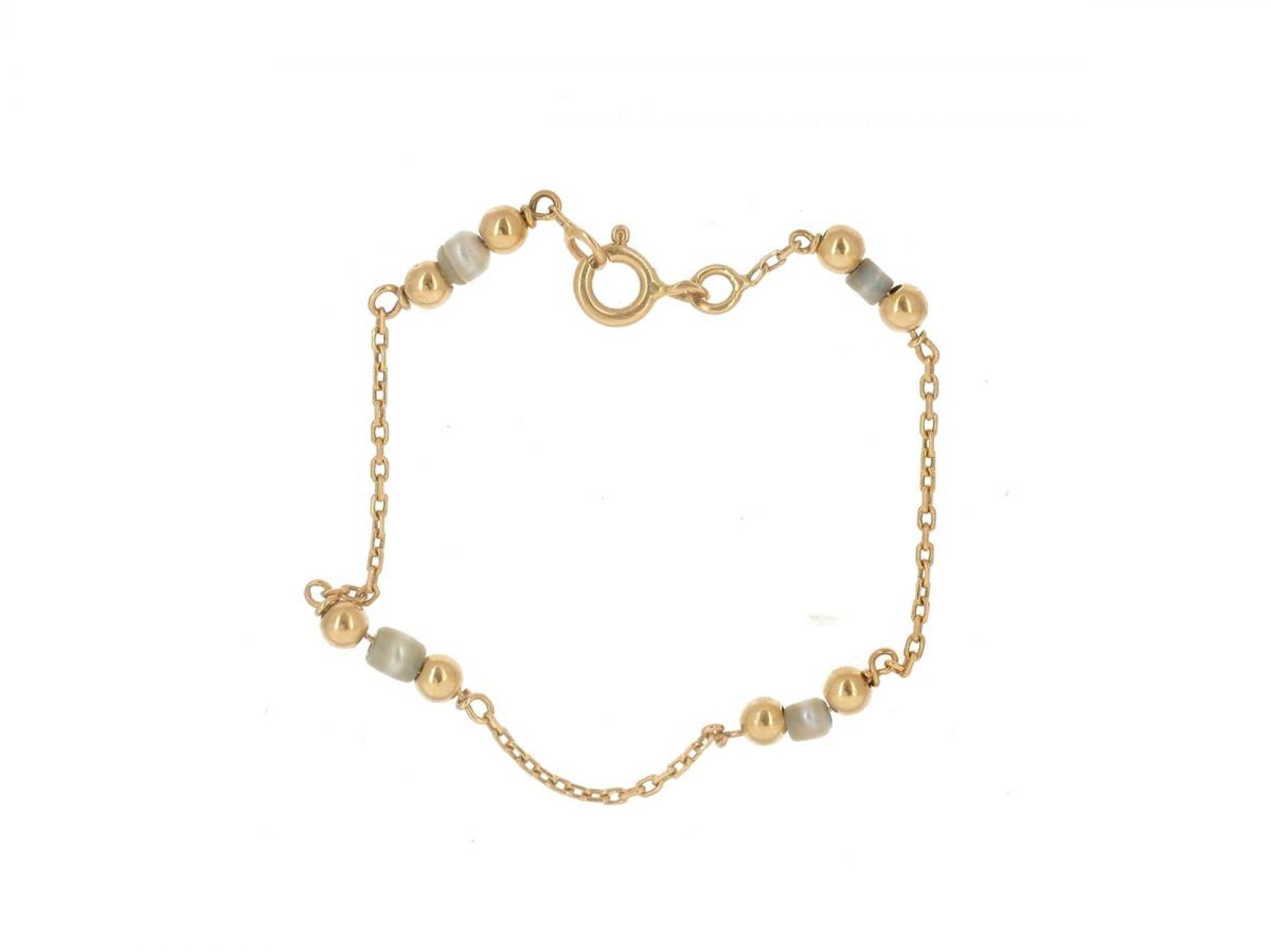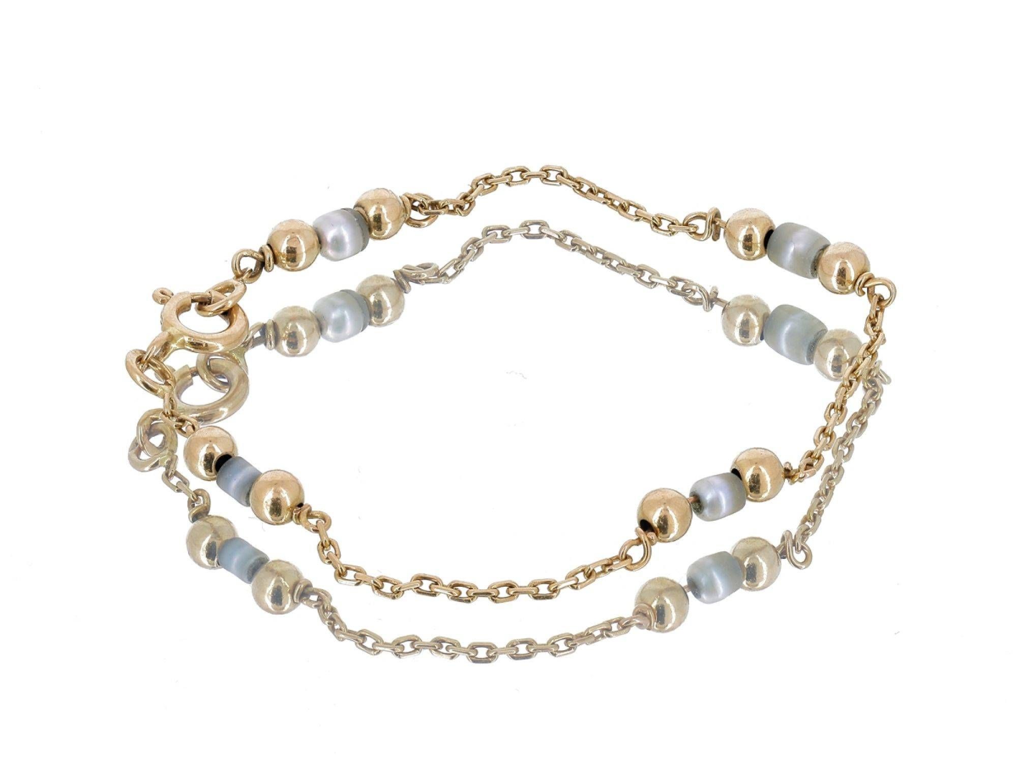 Lote 033 - Pulseira elaborada em OURO 19,2 Quilates, decorada com pequenas PÉROLAS e esferas em Ouro polido. Estado de Conservação: Muito Bom, ligeiros sinais de uso. Contraste: Cabeça de Veado 800 (OURO - 1985-2020, ao abrigo do Decreto Lei 120/2017, artigo 3.º, alínea y). Medidas (CxL): 14x0,3cm. Peso Total: 1,81gr.