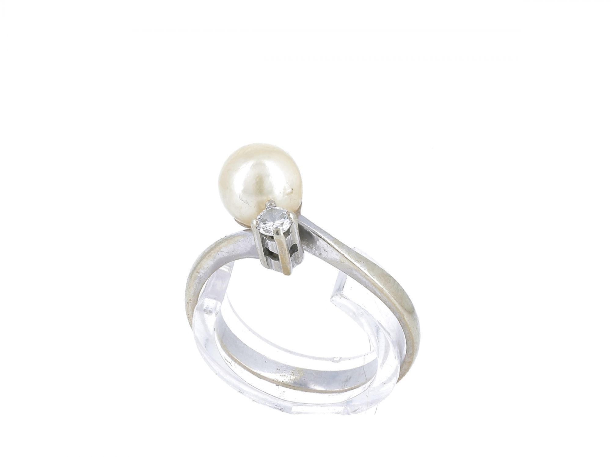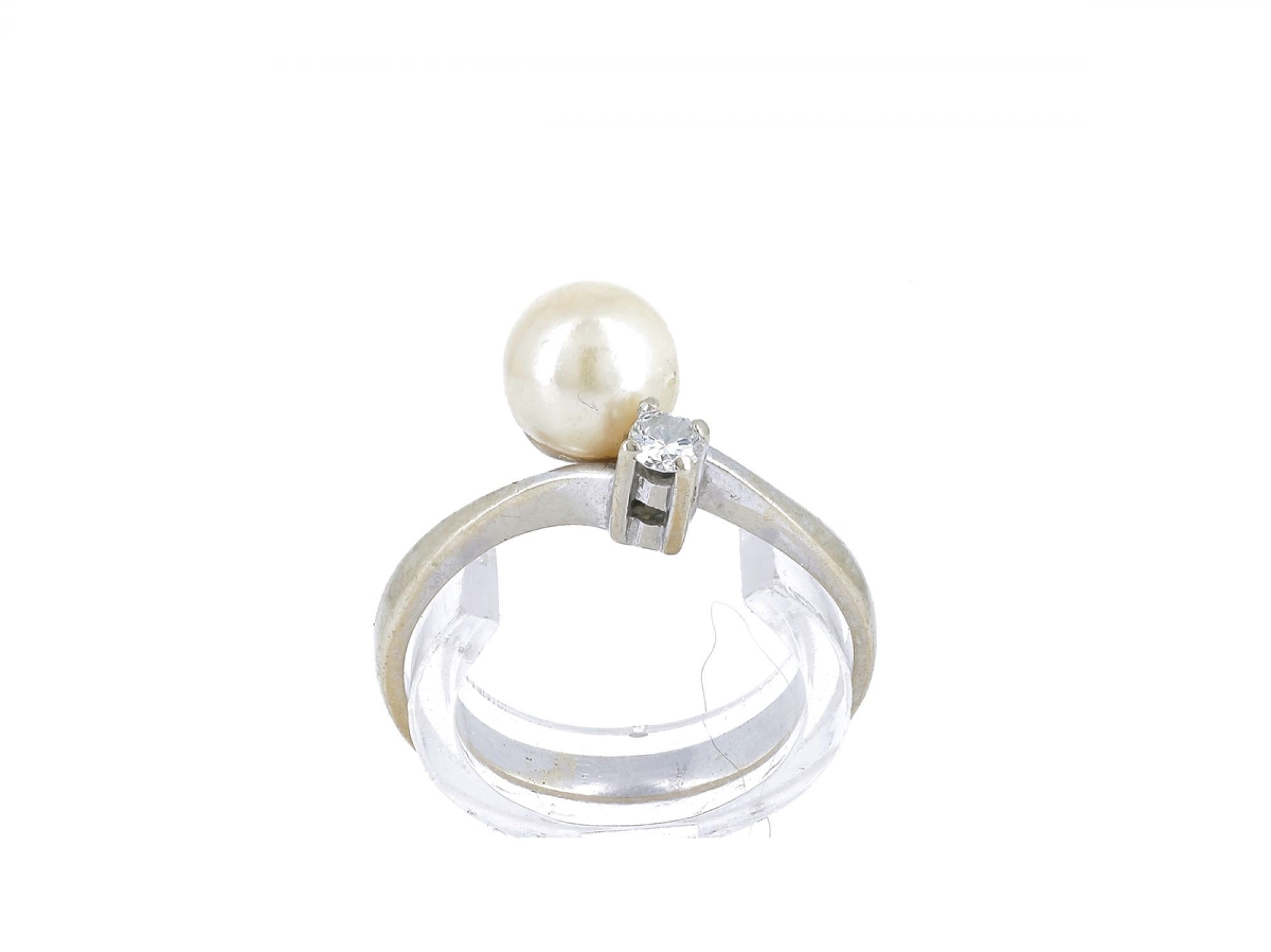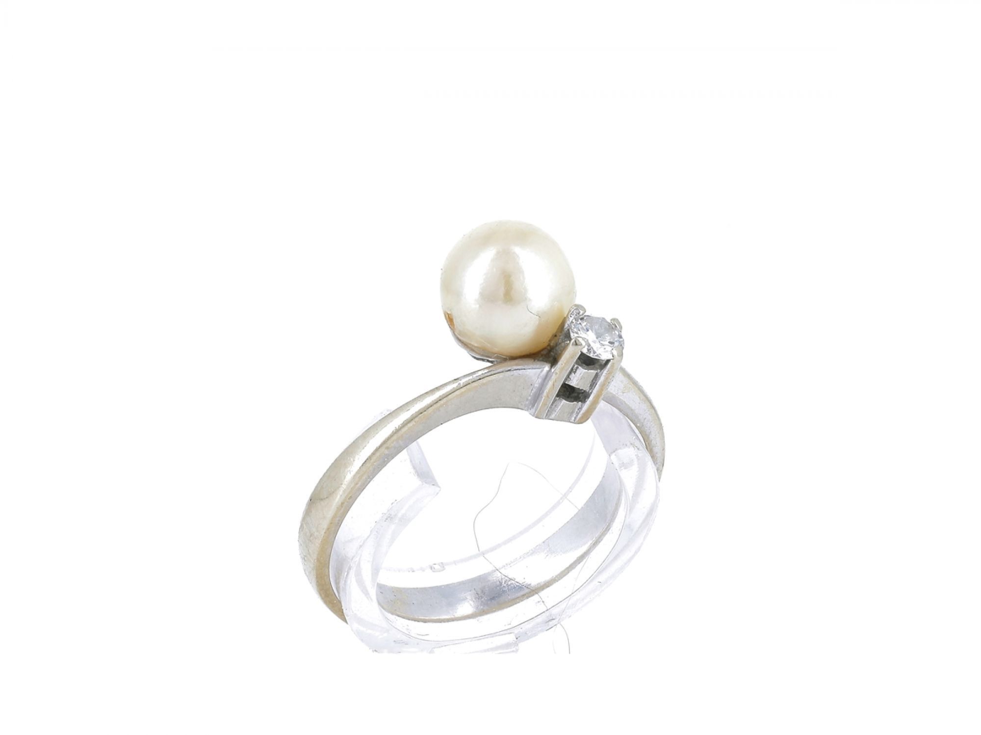 Lote 018 - Anel solitário em ouro branco com 1 perola e 1 diamante, elaborado em OURO 19,2 QUILATES. Estado de Conservação: Bom, sinais de uso. Contraste: Cabeça de Veado 800 (OURO) e Cabeça de Galo à esquerda (Pedras Preciosas e/ou Pérolas Naturais-) (1985-2020, ao abrigo do Decreto Lei 120/2017, artigo 3.º, alínea y). Tam.: 11. Medidas (LxA): 2,40x1,80x0,9cm. Peso Total: 1,91g.