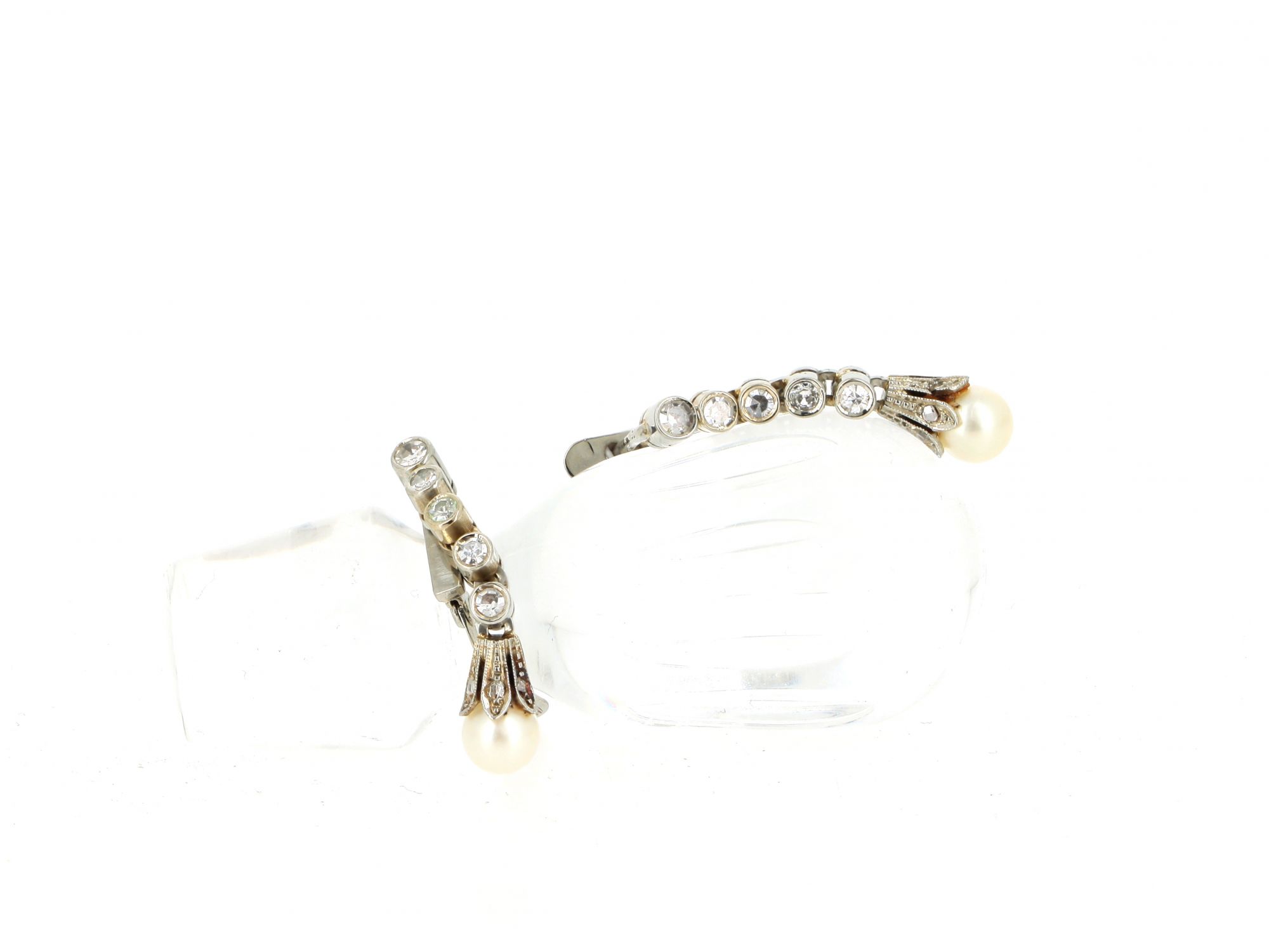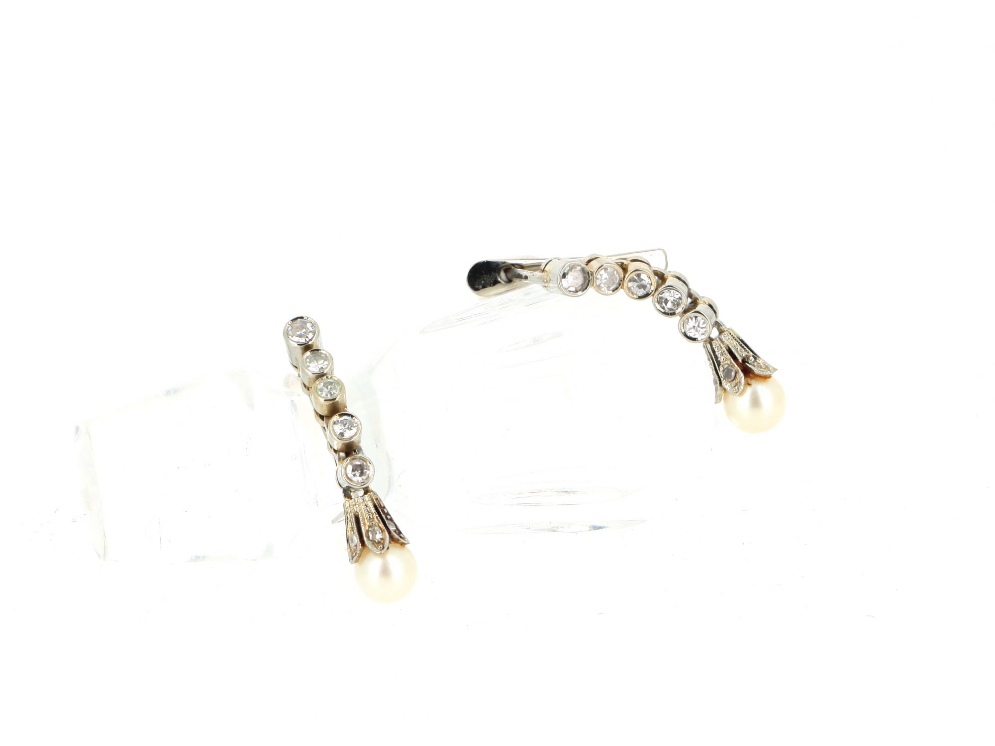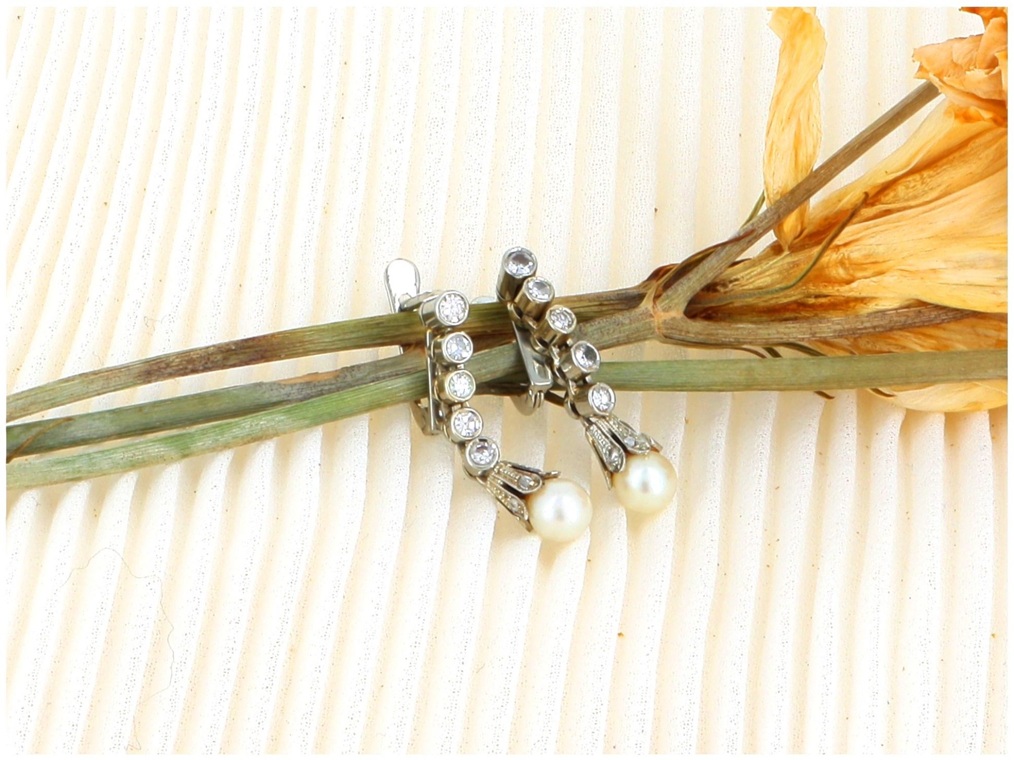 Lote 031 - Brincos ANTIGOS em Ouro Branco compridos em tira de círculos cravejados com 10 DIAMANTES em talhe brilhante com pendente em pérola da cultura, elaborado em OURO 19,2 QUILATES. Estado de Conservação: Bom. Contraste: Formiga (Ouro Branco 800) (1938-1984 - ao abrigo do Decreto Lei 120/2017, artigo 3.º, alínea y). Medidas (Comp): 2,2cm. Peso Total: 3,88gr.