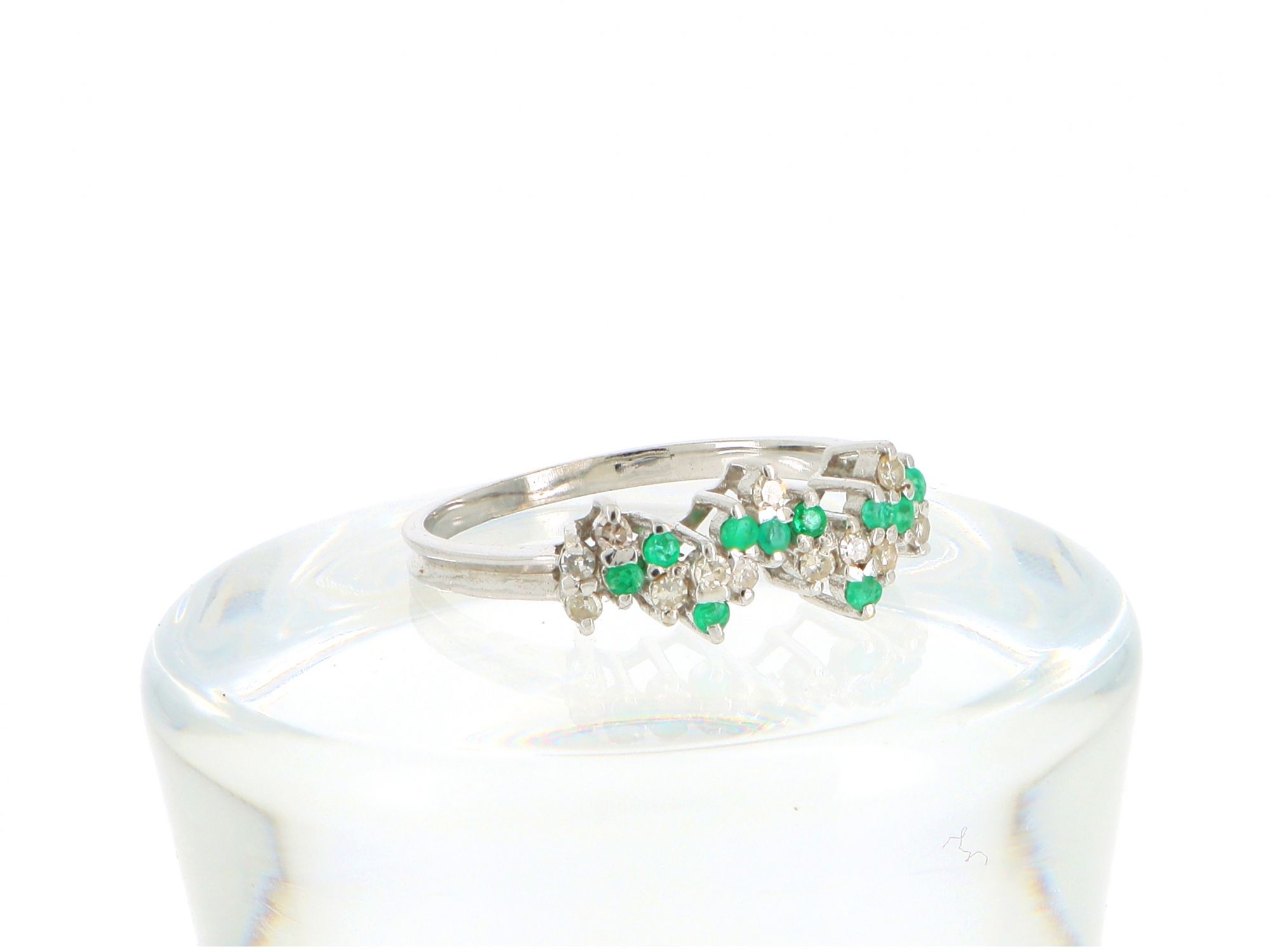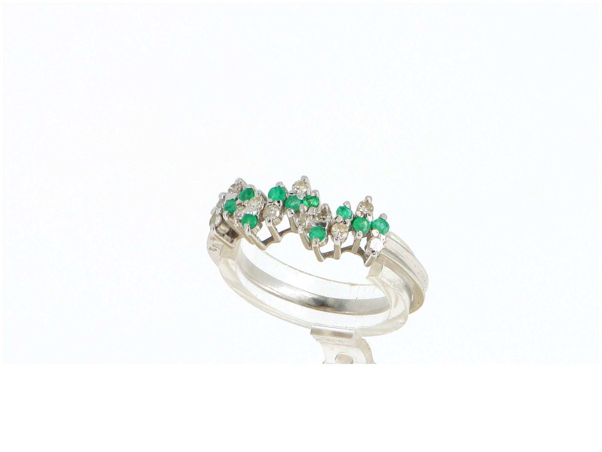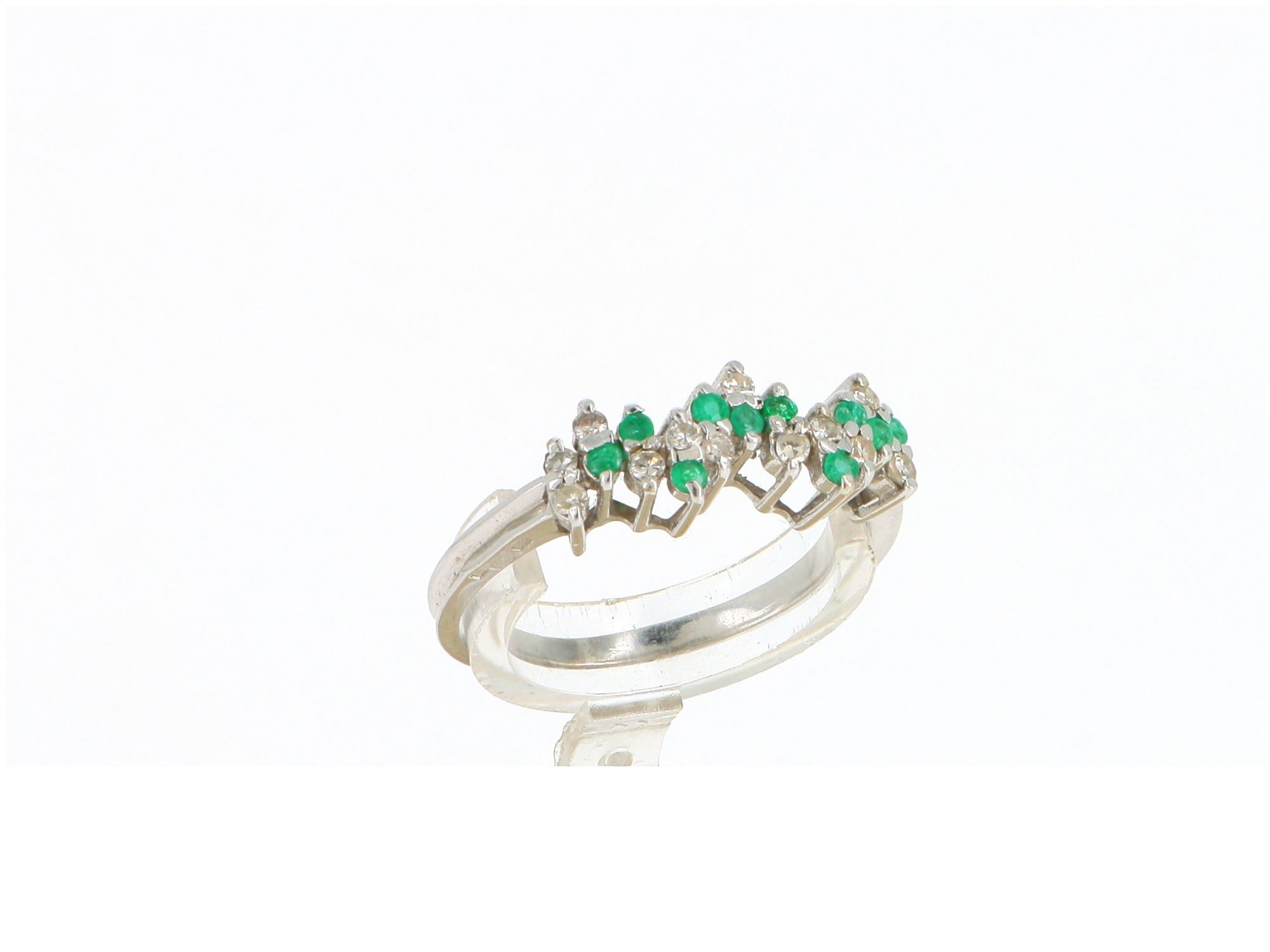 Lote 013 - Chuveiro ANTIGO de ALTA JOALHERIA elaborado em Ouro Branco de 19,2 quilates, cravejado com 11 DIAMANTES em tahe redondo brilhante e 10 ESMERALDAS em talhe resondo brilhante. Estado de Conservação : Muito Bom. Contrastes: Formiga ( Contraste que certifica Ouro Branco Antigo) e Cabeça de Galo ( Contrastte de certificação das Pedras Preciosas). Tamanho 17,5. Medidas: 0.5cm de largura. Peso Total: 2.68gr.