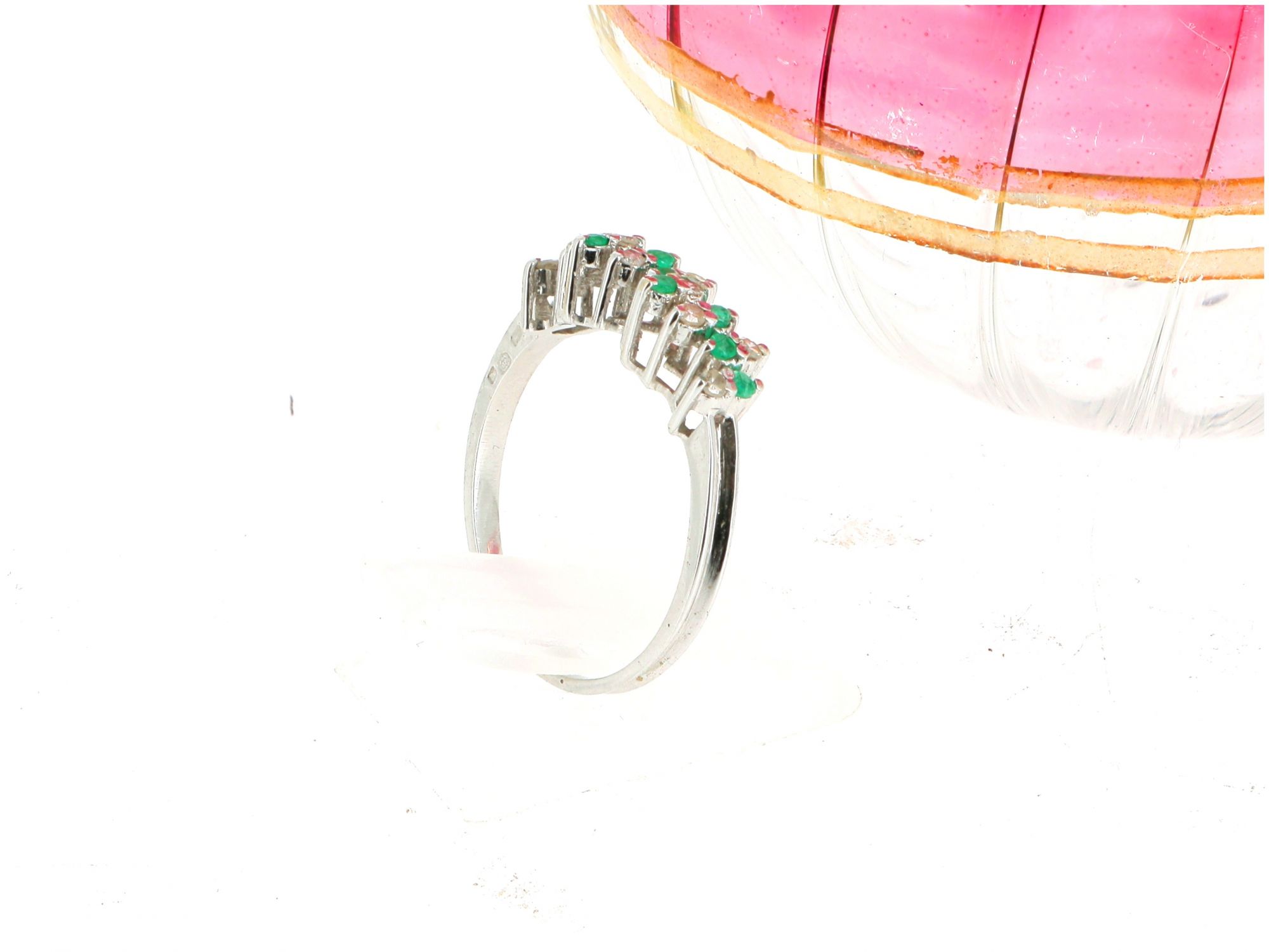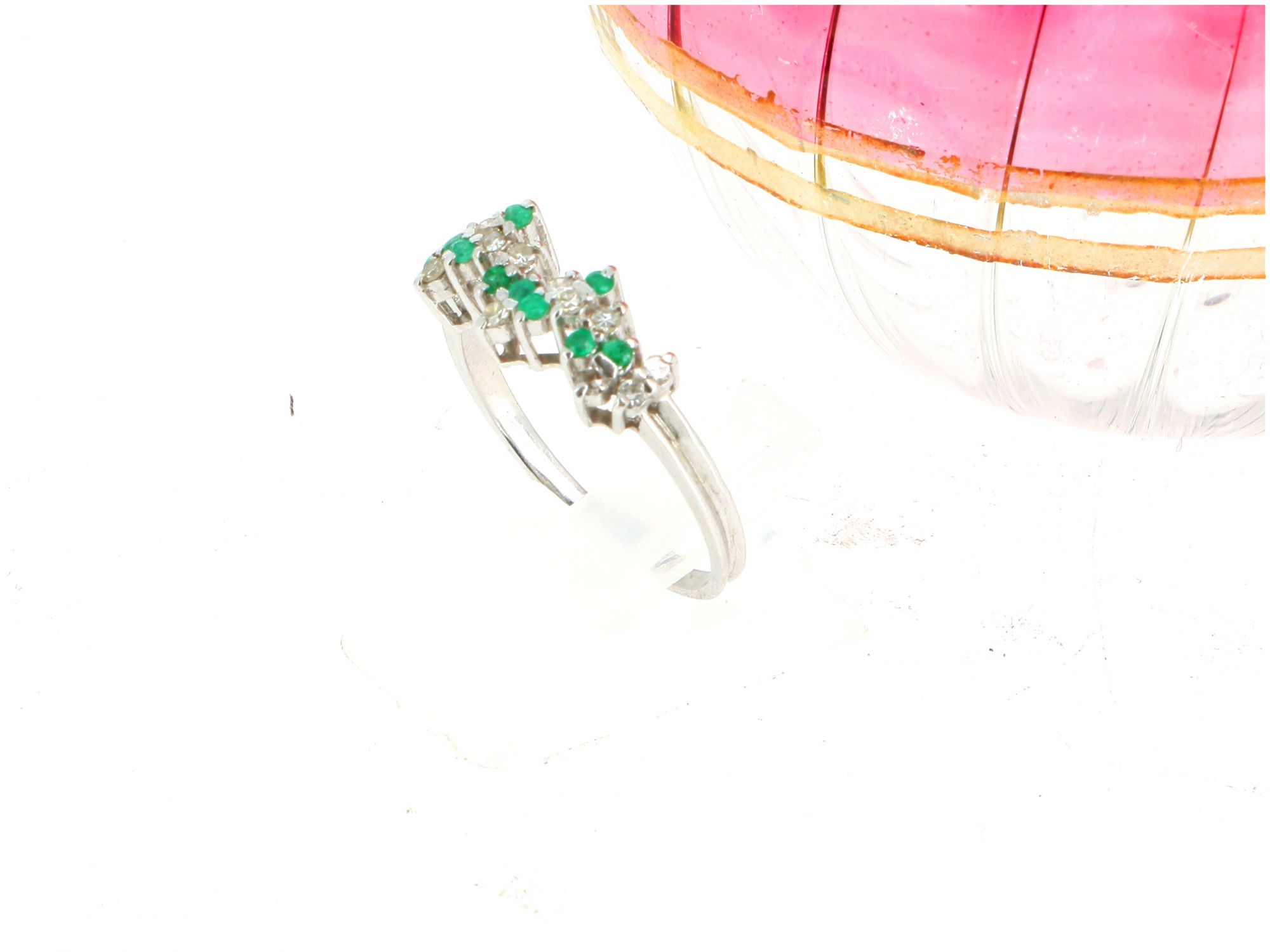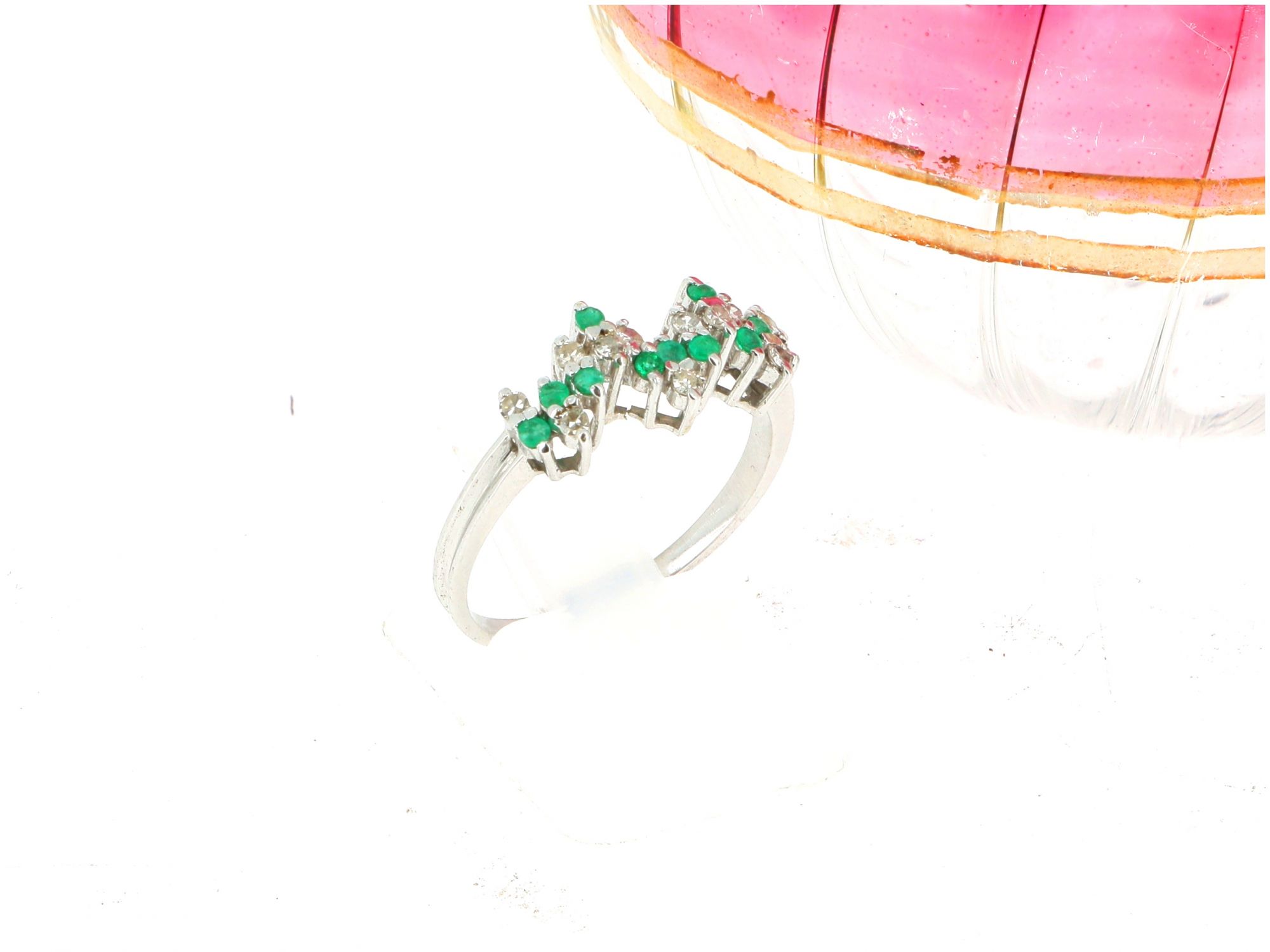 Lote 013 - Chuveiro ANTIGO de ALTA JOALHERIA elaborado em Ouro Branco de 19,2 quilates, cravejado com 11 DIAMANTES em tahe redondo brilhante e 10 ESMERALDAS em talhe resondo brilhante. Estado de Conservação : Muito Bom. Contrastes: Formiga ( Contraste que certifica Ouro Branco Antigo) e Cabeça de Galo ( Contrastte de certificação das Pedras Preciosas). Tamanho 17,5. Medidas: 0.5cm de largura. Peso Total: 2.68gr.