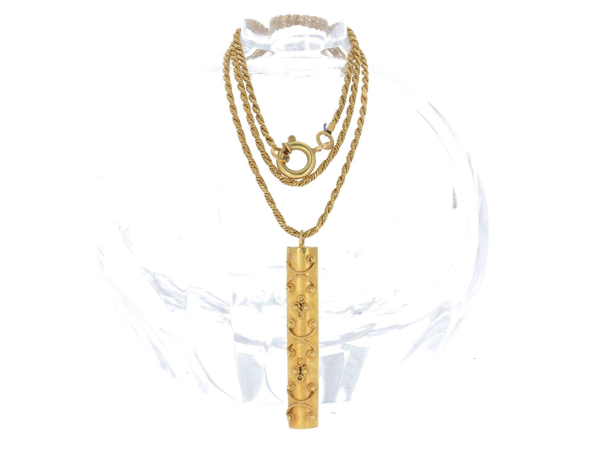 Lote 050 - Fio de malha Corda e Pingente (3,5x0,6cm) com detalhes em FILIGRANA, elaborados em OURO 19,2 Quilates. Estado de Conservação: Excelente. Contraste: Cabeça de Veado 800 (1985-2020 - ao abrigo do Decreto Lei 120/2017, artigo 3.º, alínea y). Medidas (CxL): 44x0,2cm. Peso Total: 8,1g.