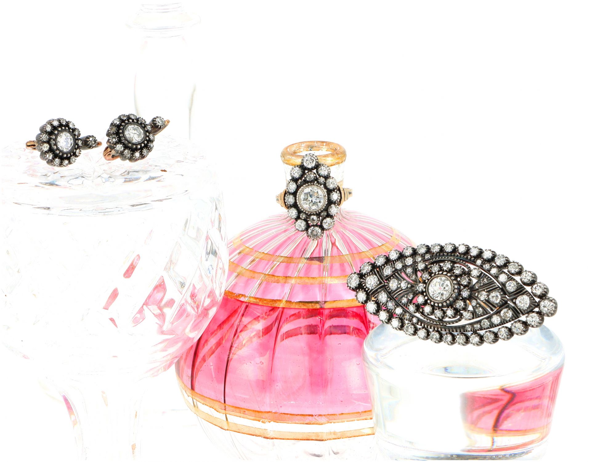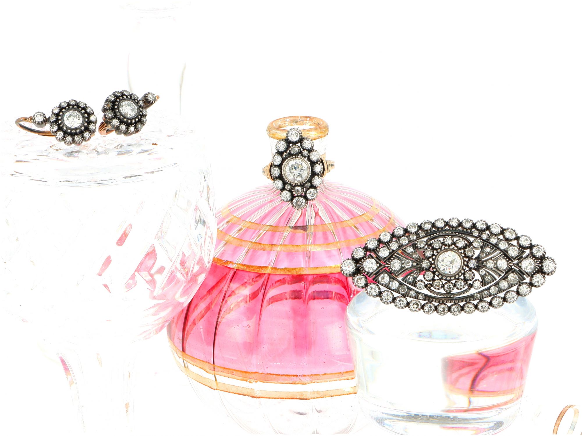 conjunto alfinete anel e brincos ouro e diamantes e prata