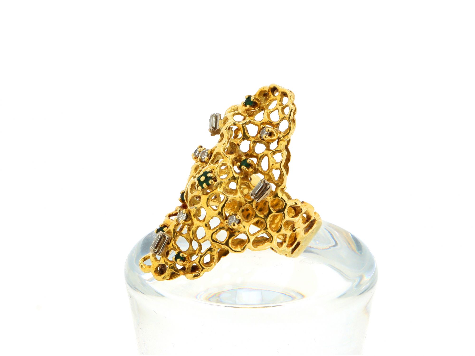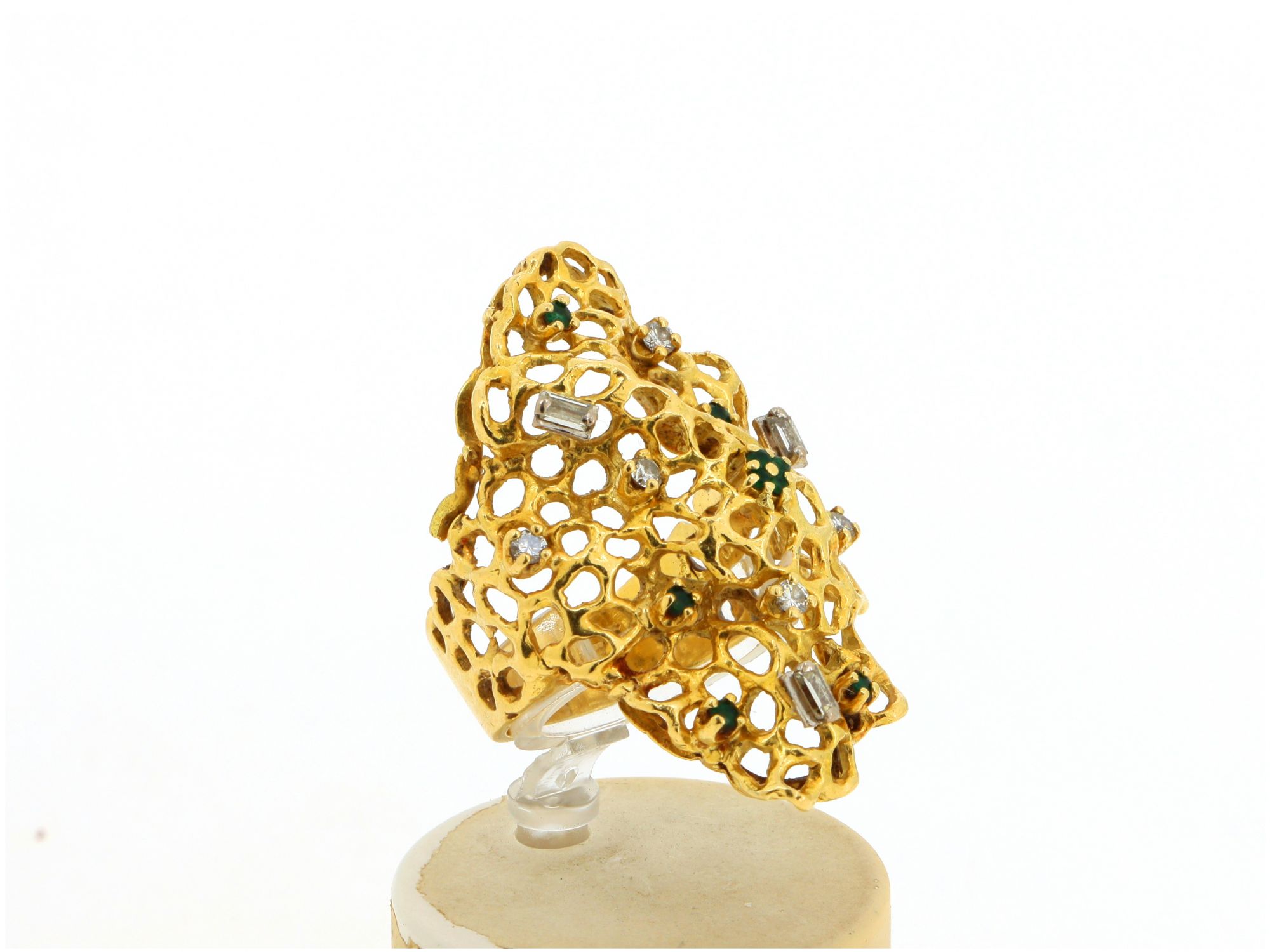 Lote 001 - Anel em Ouro, Cocktail com semelhanças de uma rede de favos de mel, cravejados com 6 ESMERALDAS em talhe redondo e 8 DIAMANTES em talhe brilhante e baguete, elaborado em OURO 18 QUILATES. Estado de Conservação: Bom. Contraste: Marca 18K. (OURO - ao abrigo do Decreto Lei 120/2017, artigo 3.º, alínea x). Tam.: 16. Medidas (CxLxA): 2,2*3,8*2,5cm. Peso Total: 11,27g.