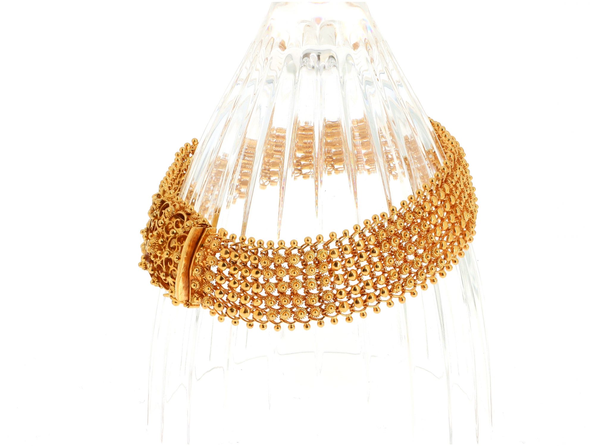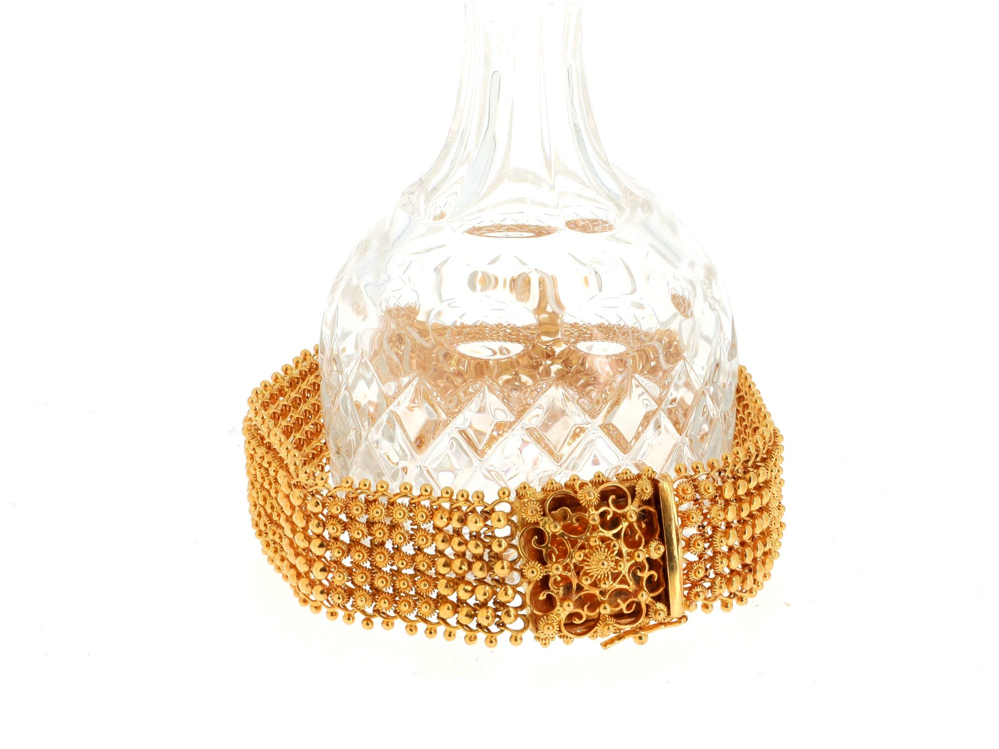 Lote 014 - Bracelete em Ouro larga de Caramujos e Granadas com fecho caixa, trabalhado à mão em Filigrana, elaborado em OURO 19,2 QUILATES. Estado de Conservação: Excelente. Contraste: Cabeça de Veado 800 (OURO - 1985-2020, ao abrigo do Decreto Lei 120/2017, artigo 3.º, alínea y). Medidas (CxL): 23,7*2cm. Peso Total: 61,27g.