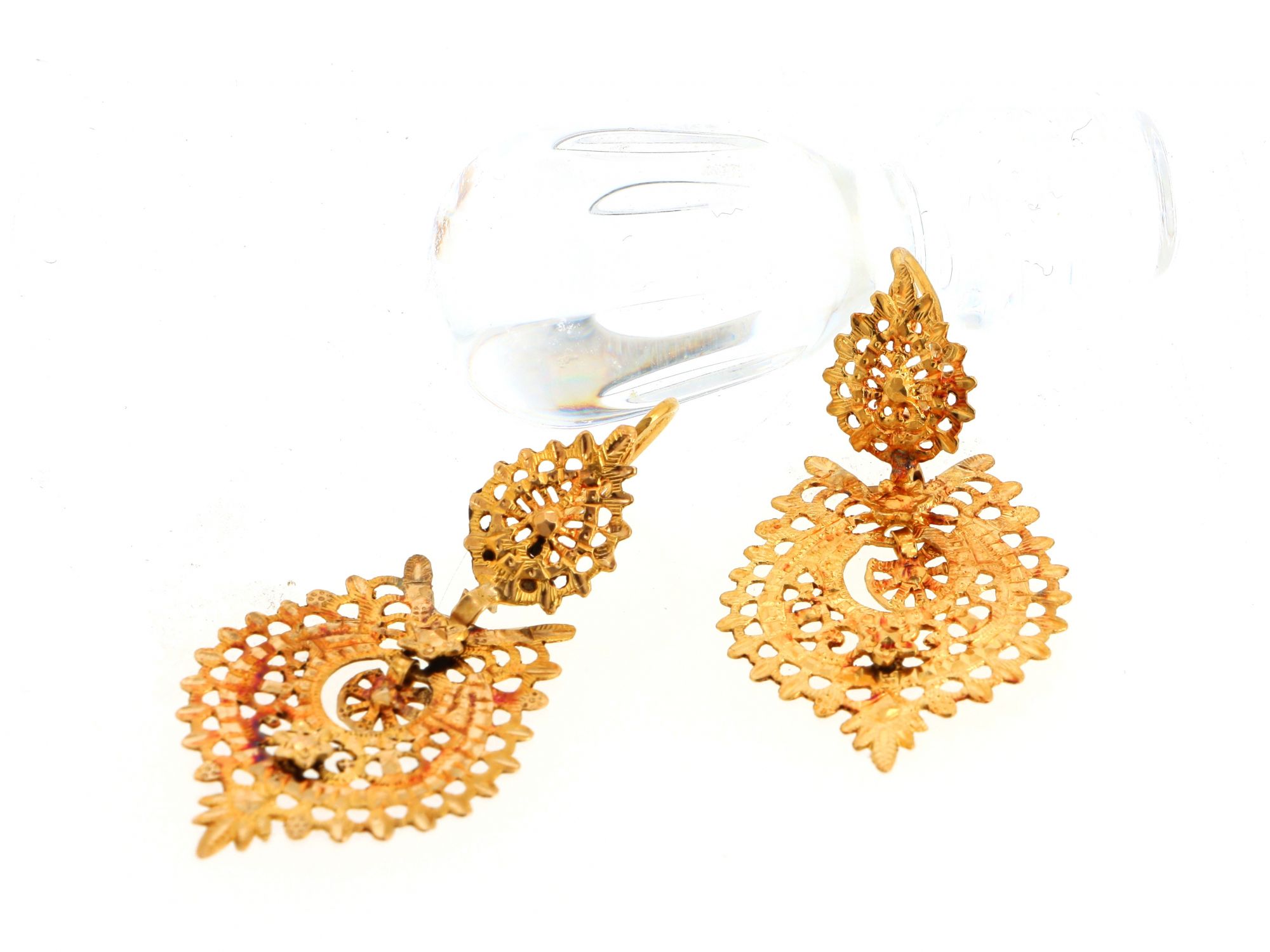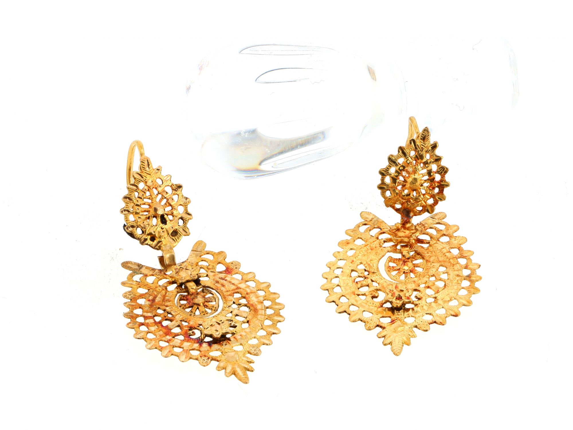 Lote 031 - Brincos ANTIGOS em Ouro à Rainha, trabalhados em FILIGRANA, elaborado em OURO 19,2 QUILATES. Estado de Conservação: Bom. Contraste: Cabeça de Dragão 800 (1938-1984 - ao abrigo do Decreto Lei 120/2017, artigo 3.º, alínea y). Medidas (CxL): 4,5*2,3cm. Peso Total: 5,3g.