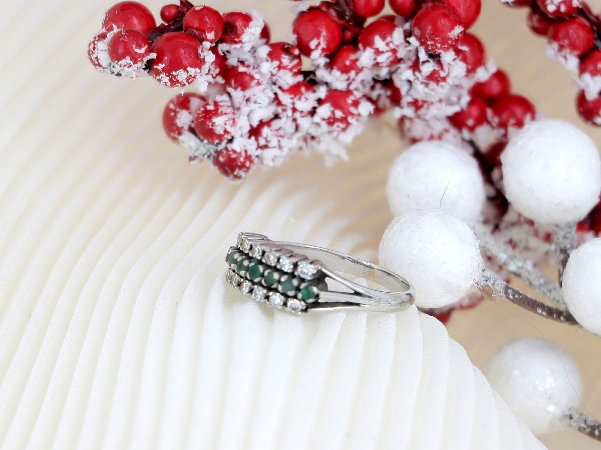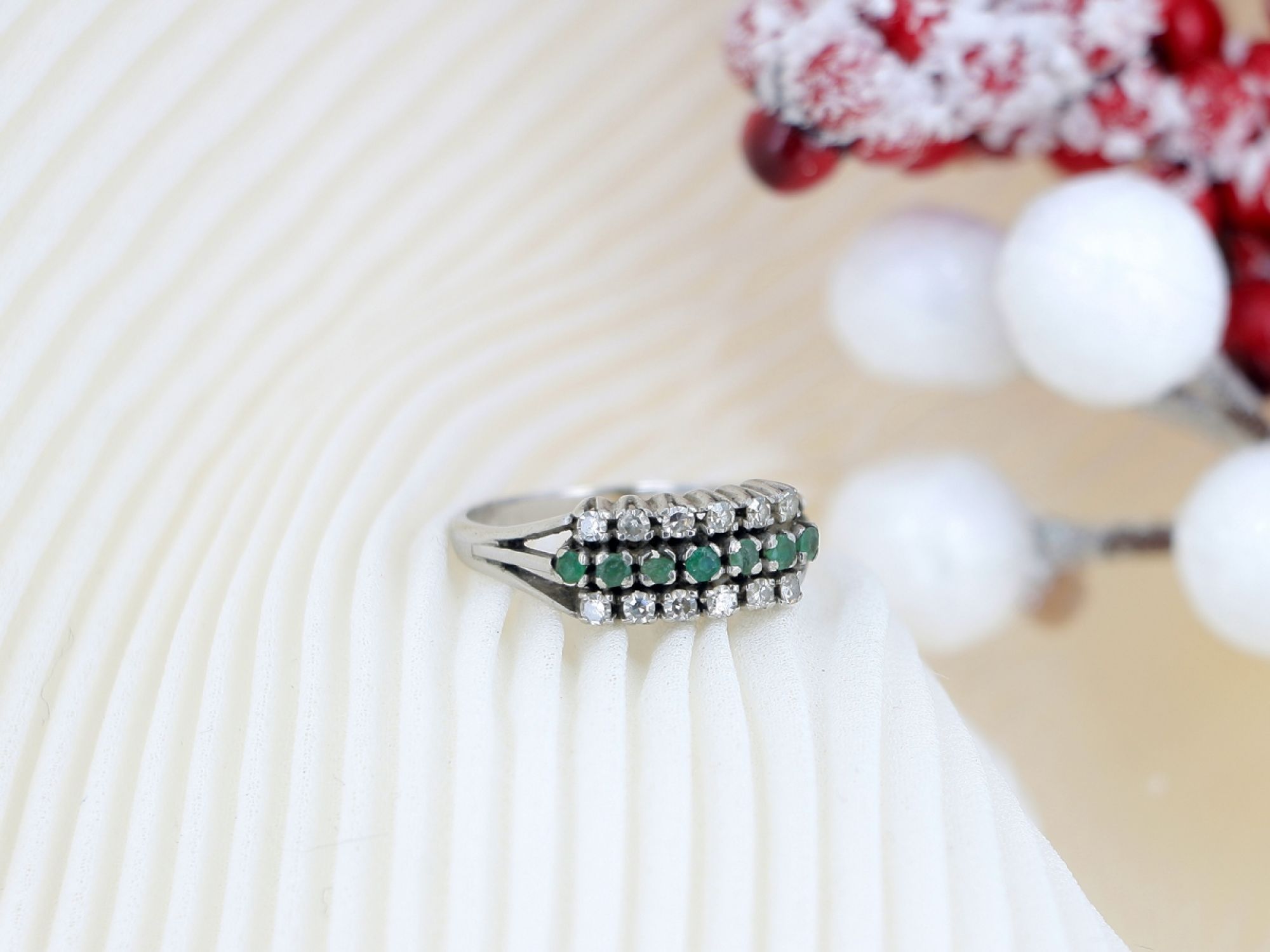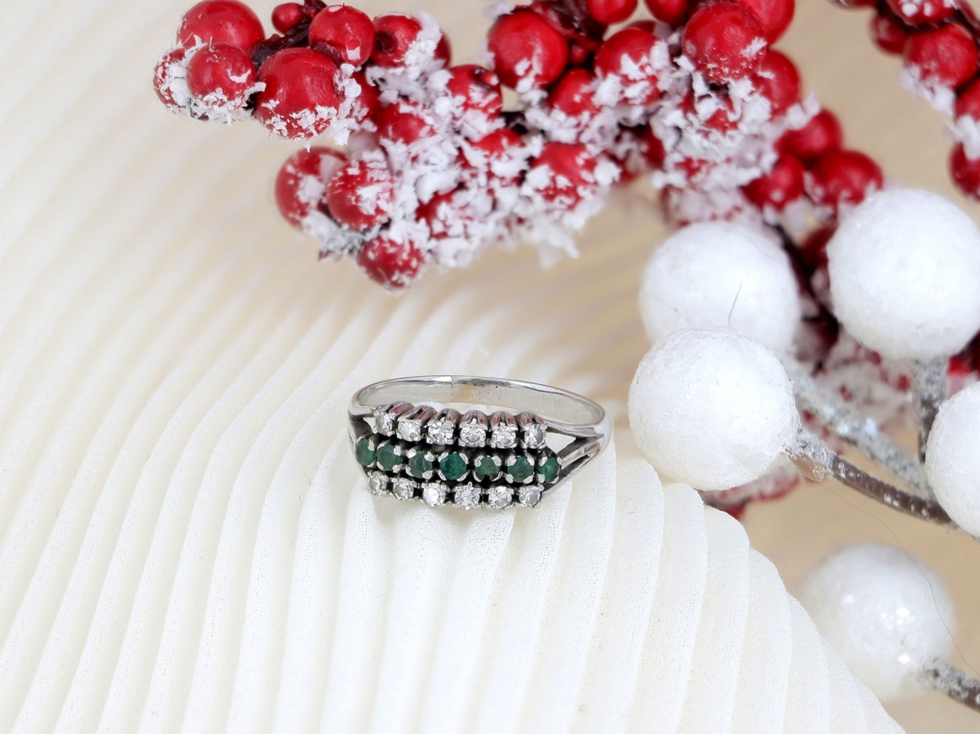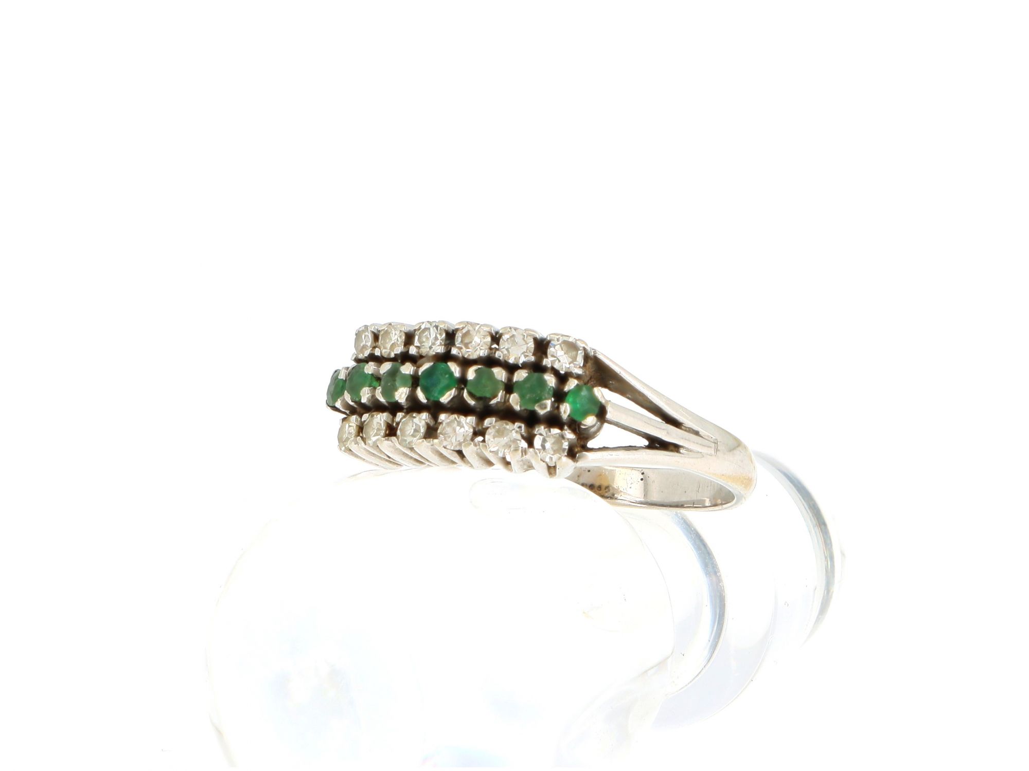 Lote 028 - Anel elaborado em OURO 19,2 Quilates, cravejado com 12 DIAMANTES e 7 ESMERALDAS. Estado de Conservação: Muito Bom, ligeiros sinais de uso. Contraste: Escaravelho (OURO Branco 800 - 1985-2020, ao abrigo do Decreto Lei 120/2017, artigo 3.º, alínea y). Tam.: 16. Medidas (CxAxL): 0,2x0,4x2,3cm. Peso Total: 4,33g.