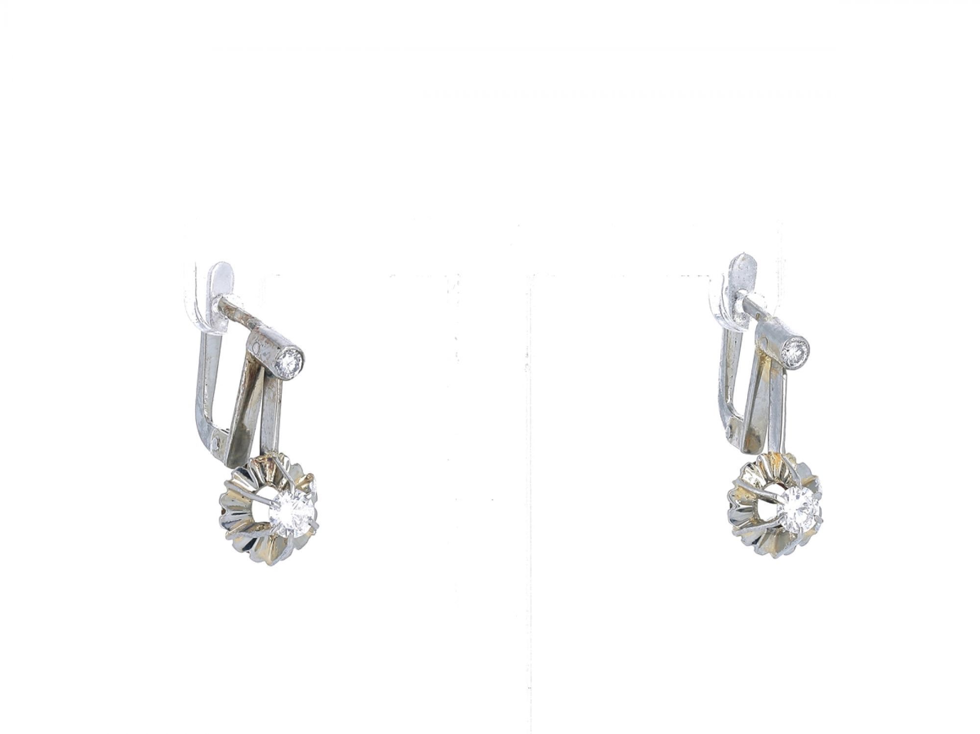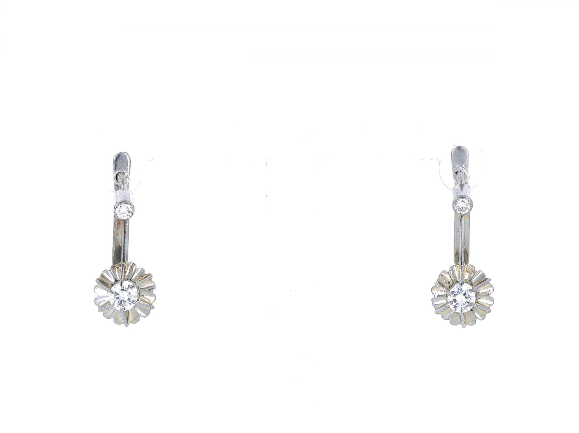 Lote 034 - Brincos ANTIGOS em Ouro Branco de 19,2 Quilates, cravejados com 4 DIAMANTES em Talhe Redondo Brilhante Estado de Conservação: Muito Bom. Contraste: Formiga (Ouro Branco 800) (1938-1984 - ao abrigo do Decreto Lei 120/2017, artigo 3.º, alínea y). Medidas (Comp): 1,5cm. Peso Total: 3,5gr.