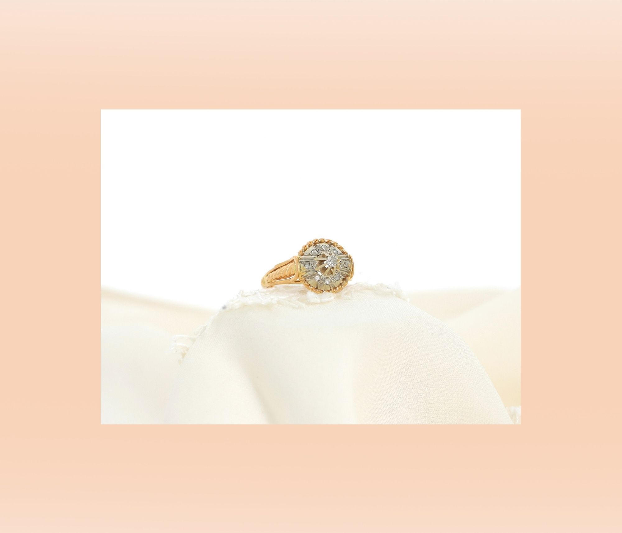< Back to Auction Active Auctions Lote 021 - Anel VINTAGE Bicolor em malha corda no rebordo cravejado com 9 DIAMANTES, elaborada em OURO 18 QUILATES. Estado de Conservação: Bom, sinais de uso. Contraste: sem marcas de contraste, com mais de 50 anos ao abrigo do Decreto Lei 120/2017, artigo 2.º, alínea c). Medidas (CxLxA): 2*1,3*3cm. Peso Total: 5,33g.